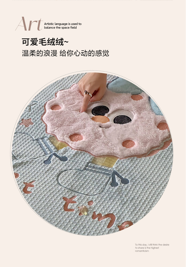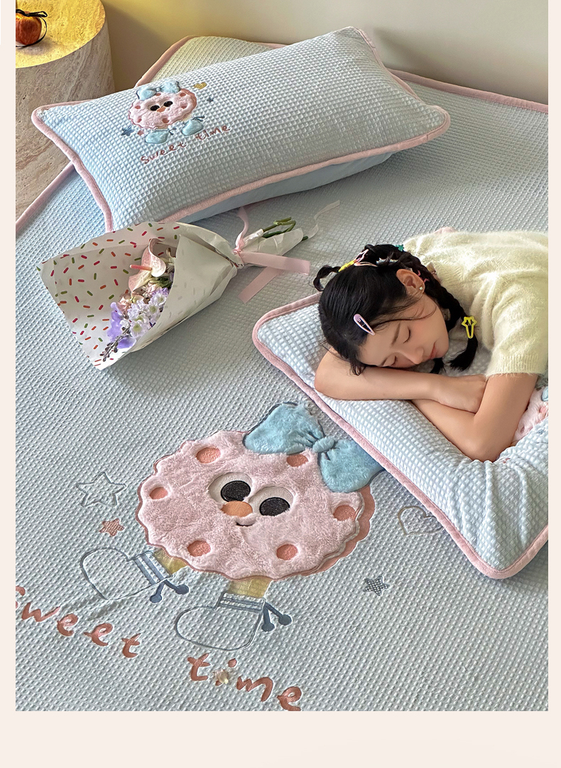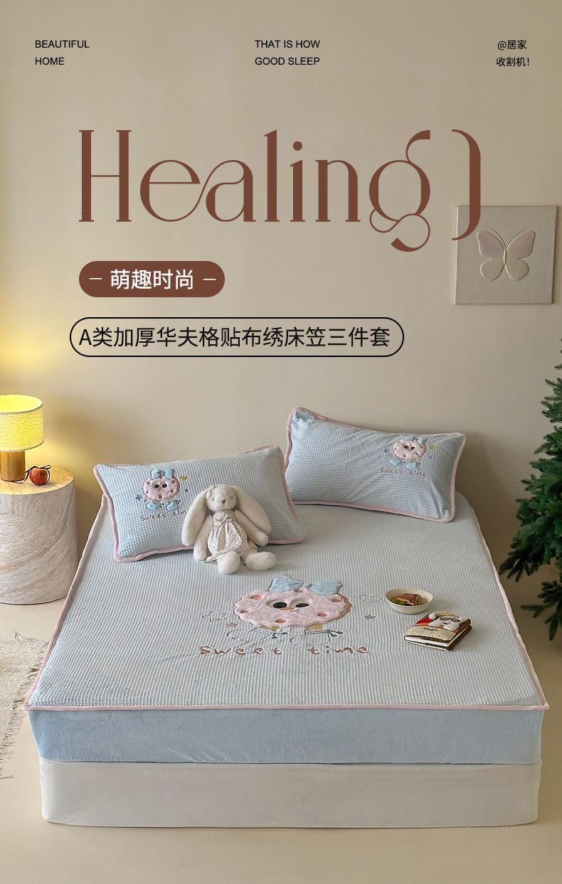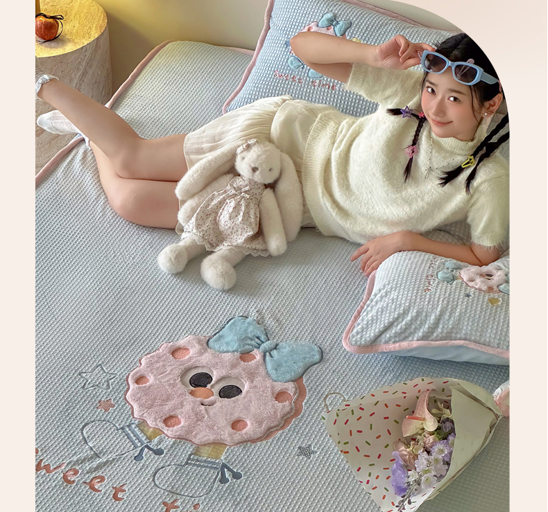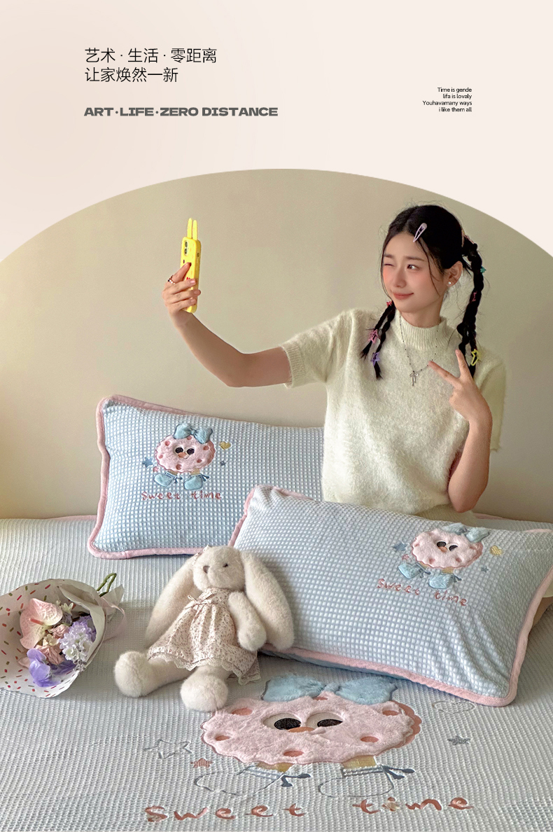 商品名称:Sweet dreams甜梦 2025新款华夫格绒兔毛贴布床笠三件套 甜甜圈蓝