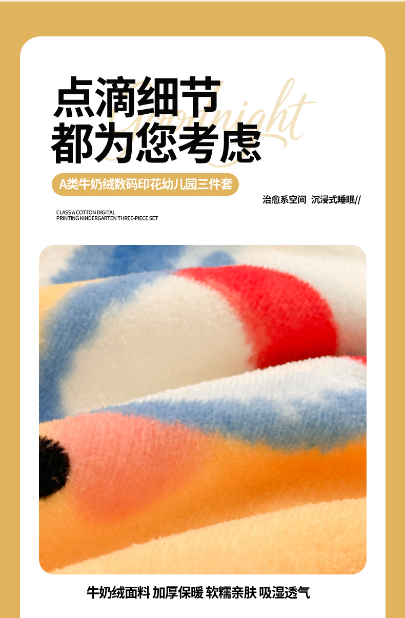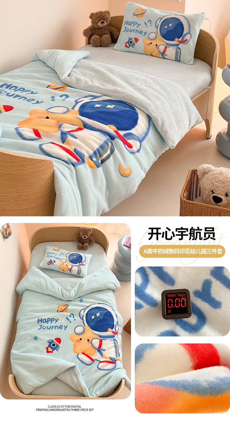 当前位置: 91家纺网 > 商品网购 > 床品套件 > 三件套 > 嗨生活 2025新款牛奶绒数码印花原创大版卡通幼儿园套件幼儿园三件套 开心宇航员