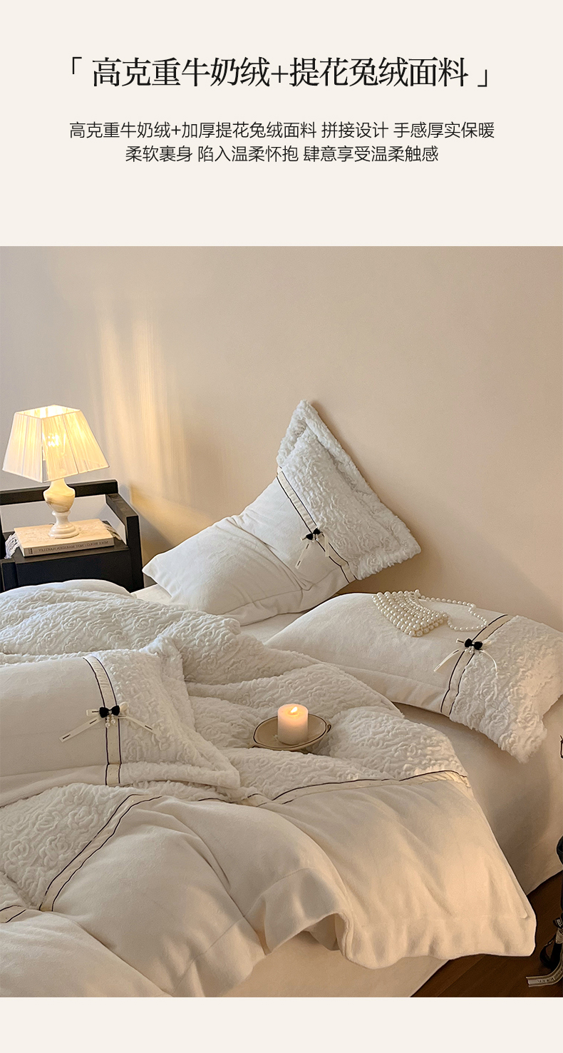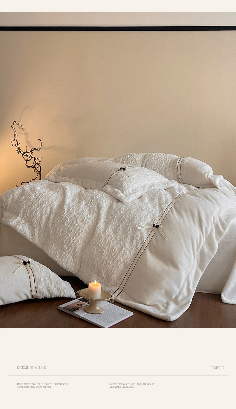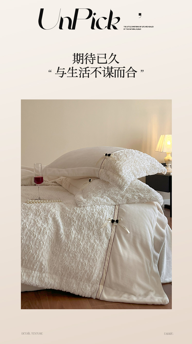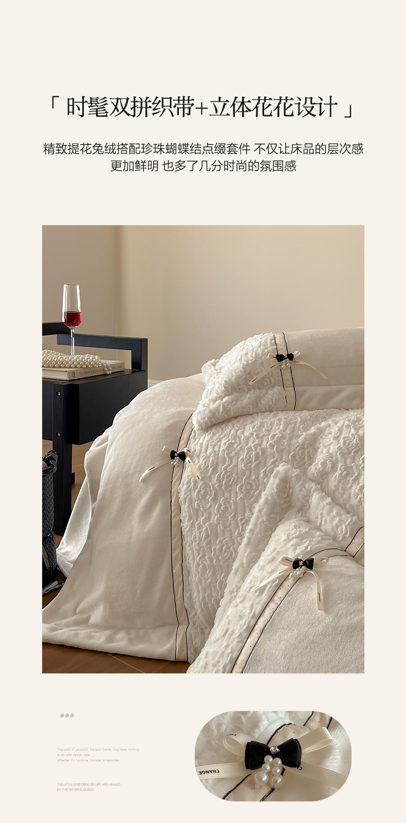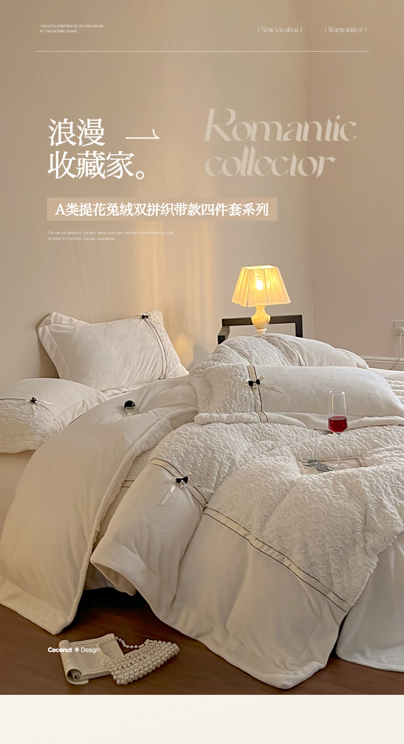 蓝邻家纺 2025新款提花兔绒双拼织带款四件套-微语系列 微语-米白
