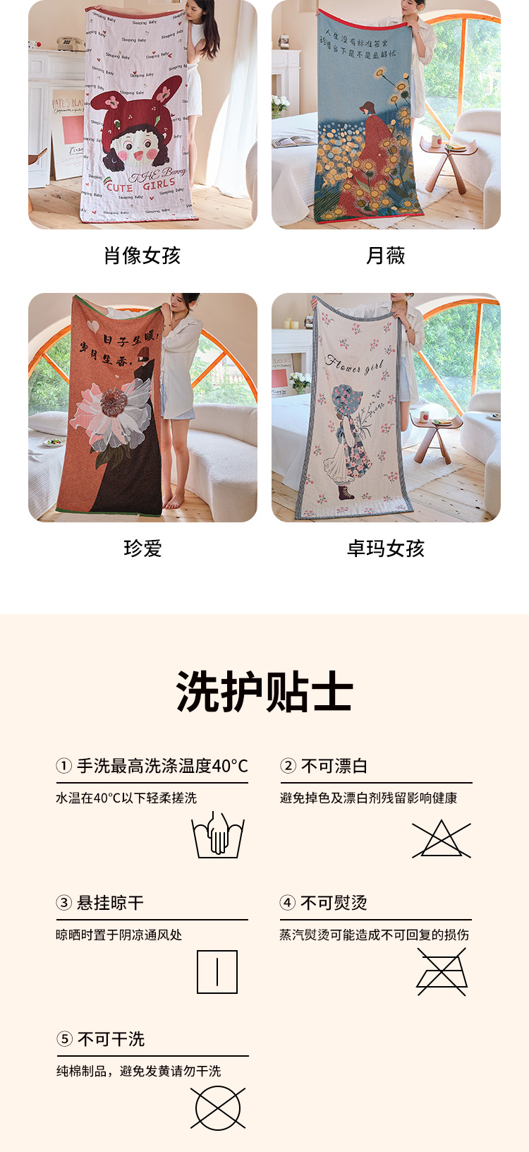 商品名称:沐瑟家纺 2025新款卡通A类全棉四层纱布浴巾加大毛巾-第三组 月薇 80*160cm