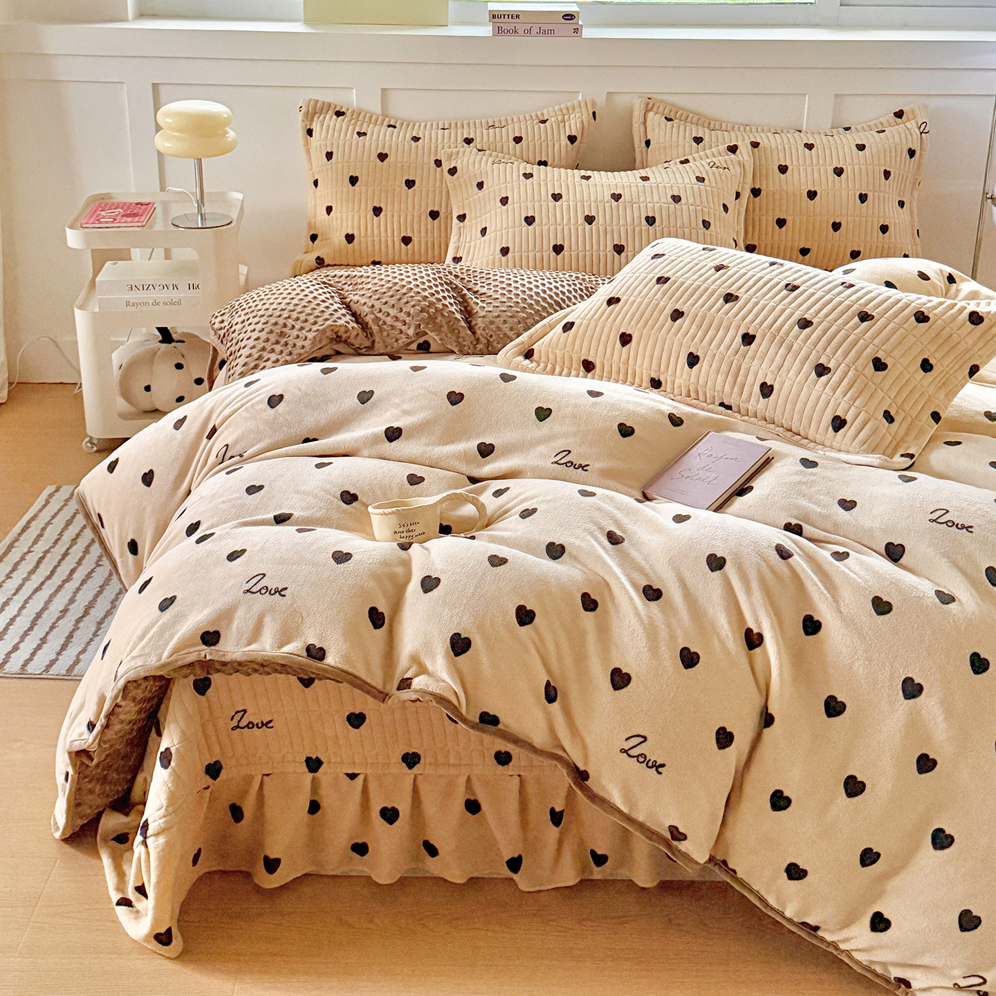 (总)欧尚 2025新款牛奶绒花边床盖四件套,粉点点,花小玉,咖色小心心,蓝点点,慕然,仙女粉,仙女紫