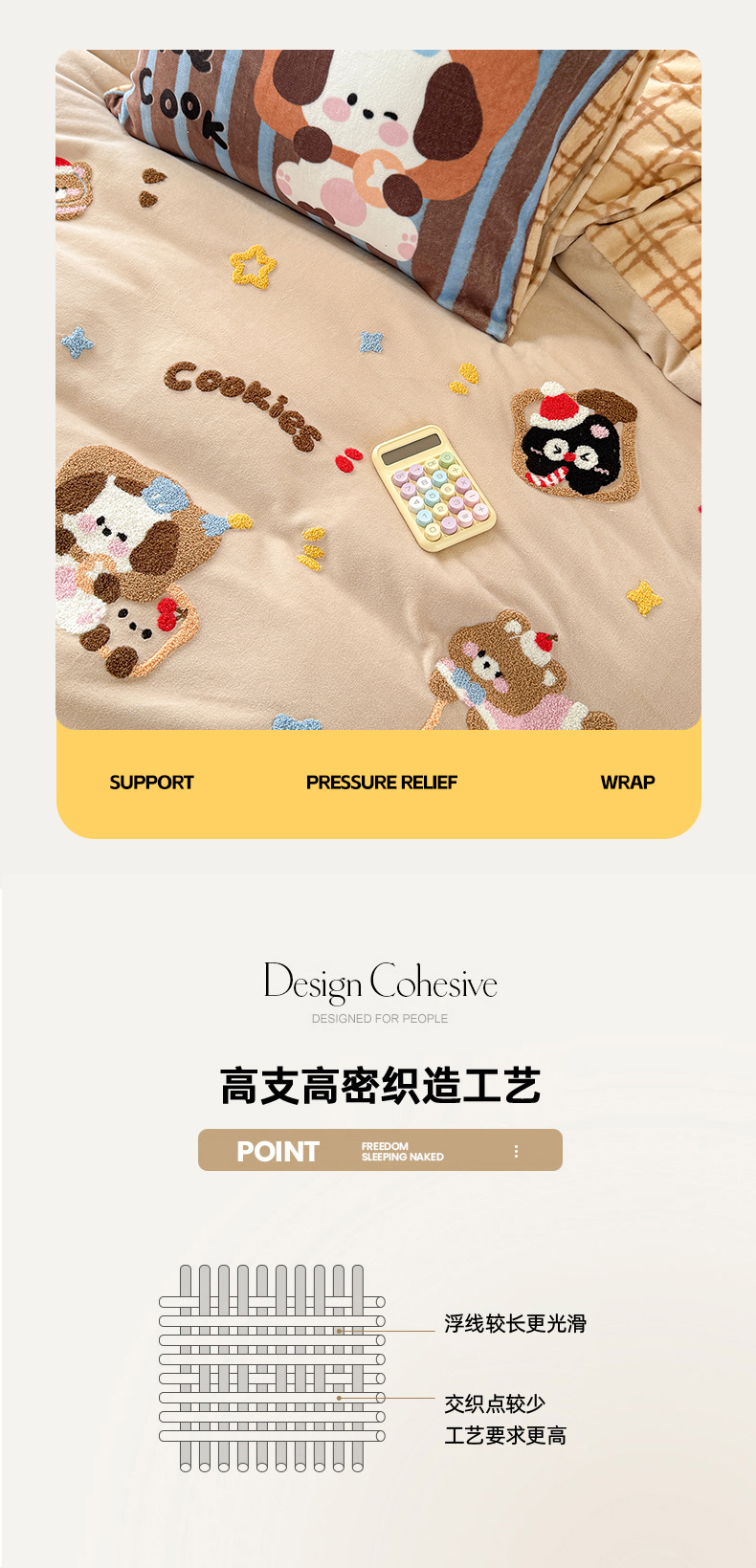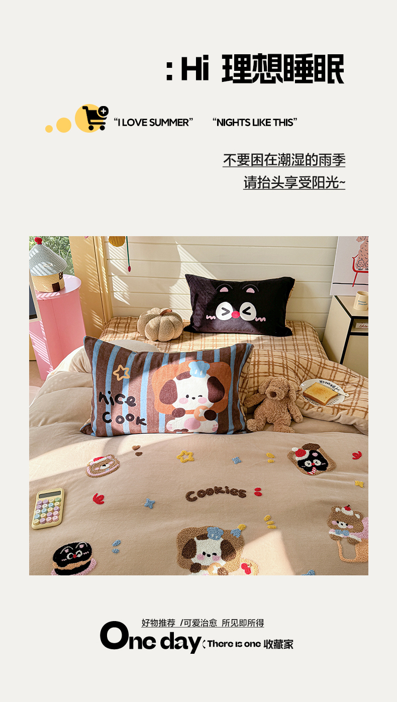 (总)眠屿家纺 2025新款加厚牛奶绒毛巾绣四件套,乐趣,面包狗,玩偶,玩泡泡