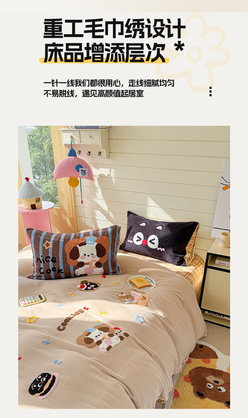 (总)眠屿家纺 2025新款加厚牛奶绒毛巾绣四件套-绒球款,飞奔小狗,黑猫蘑菇,聚会动物,芝士汪汪队