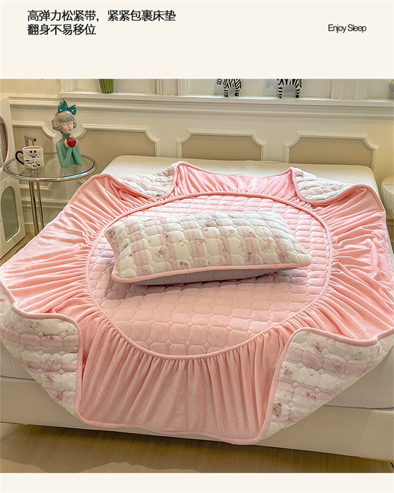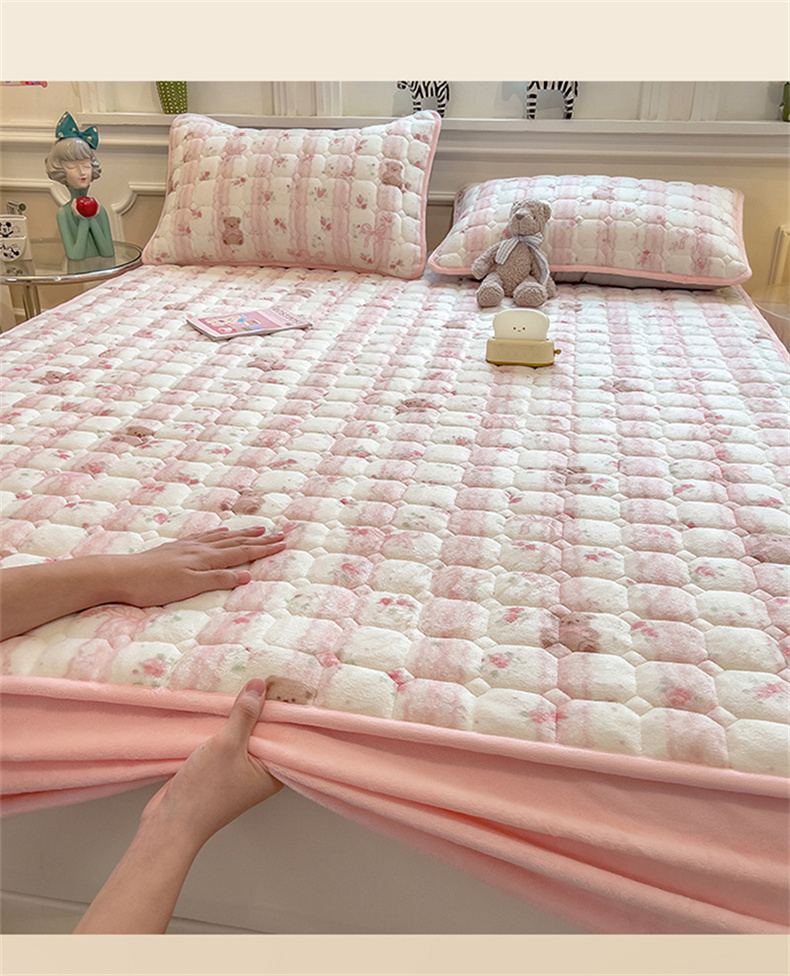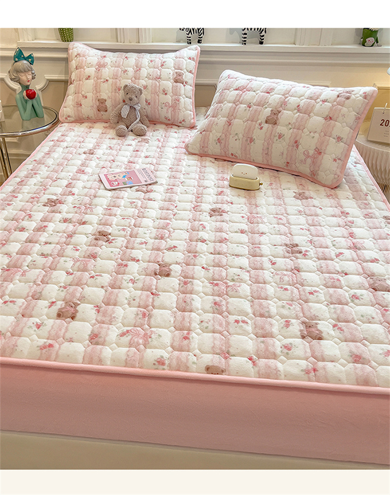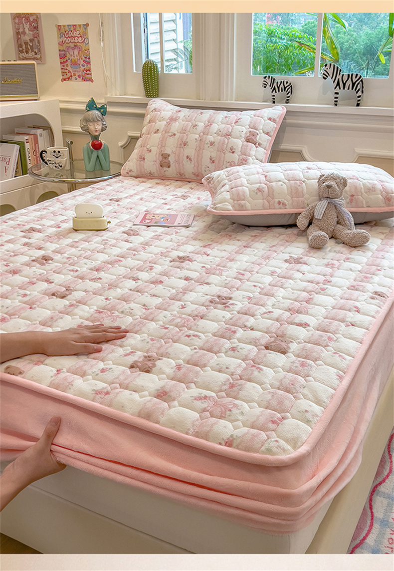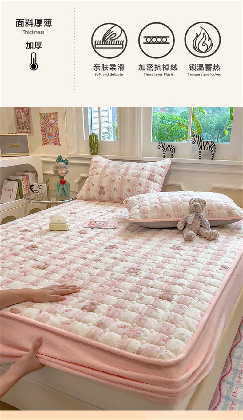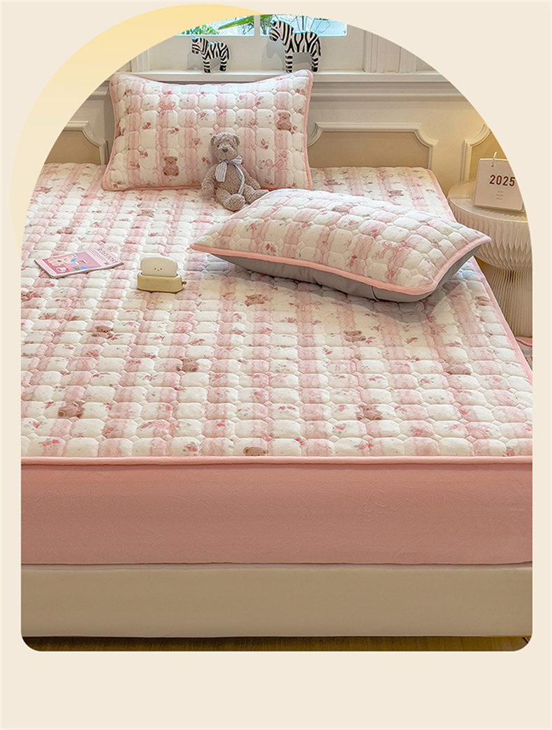 商品名称:布卢姆床垫 2025新款A类抗菌印花牛奶绒夹棉床笠 粉粉蕾丝熊