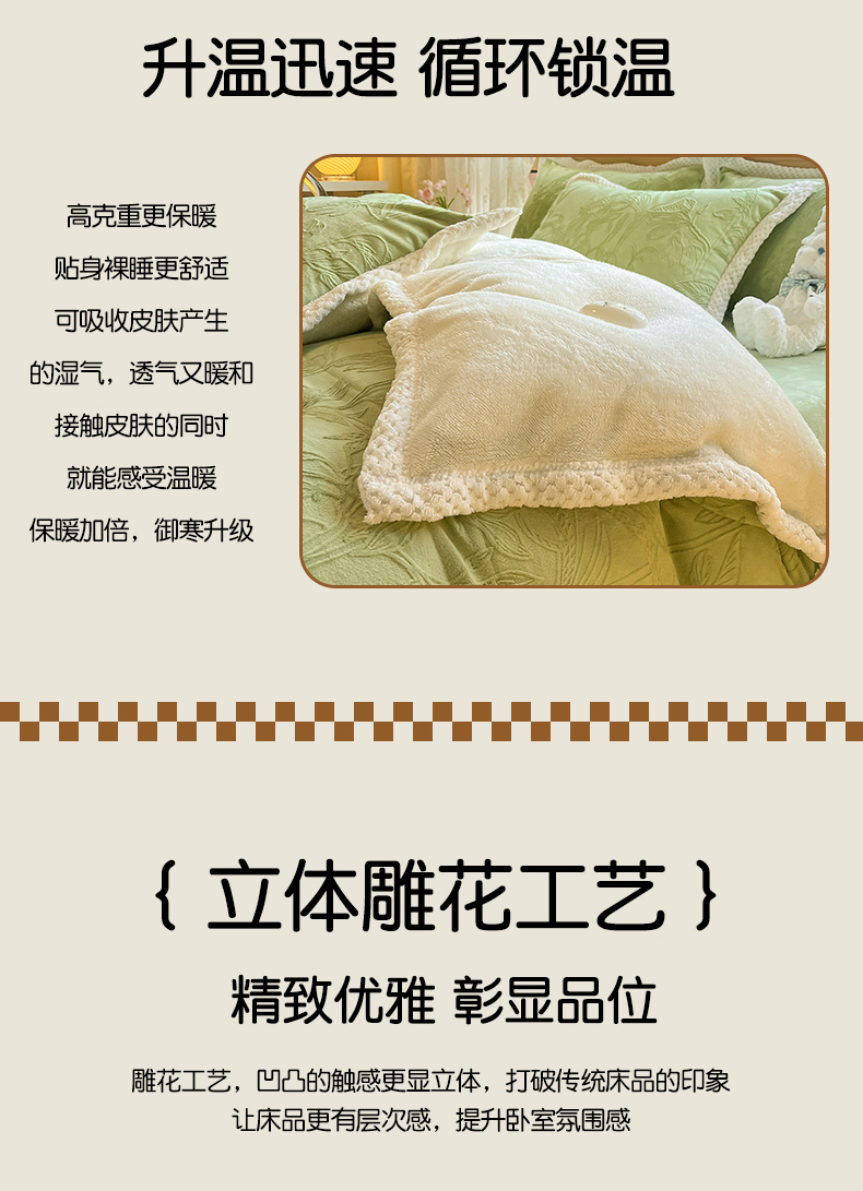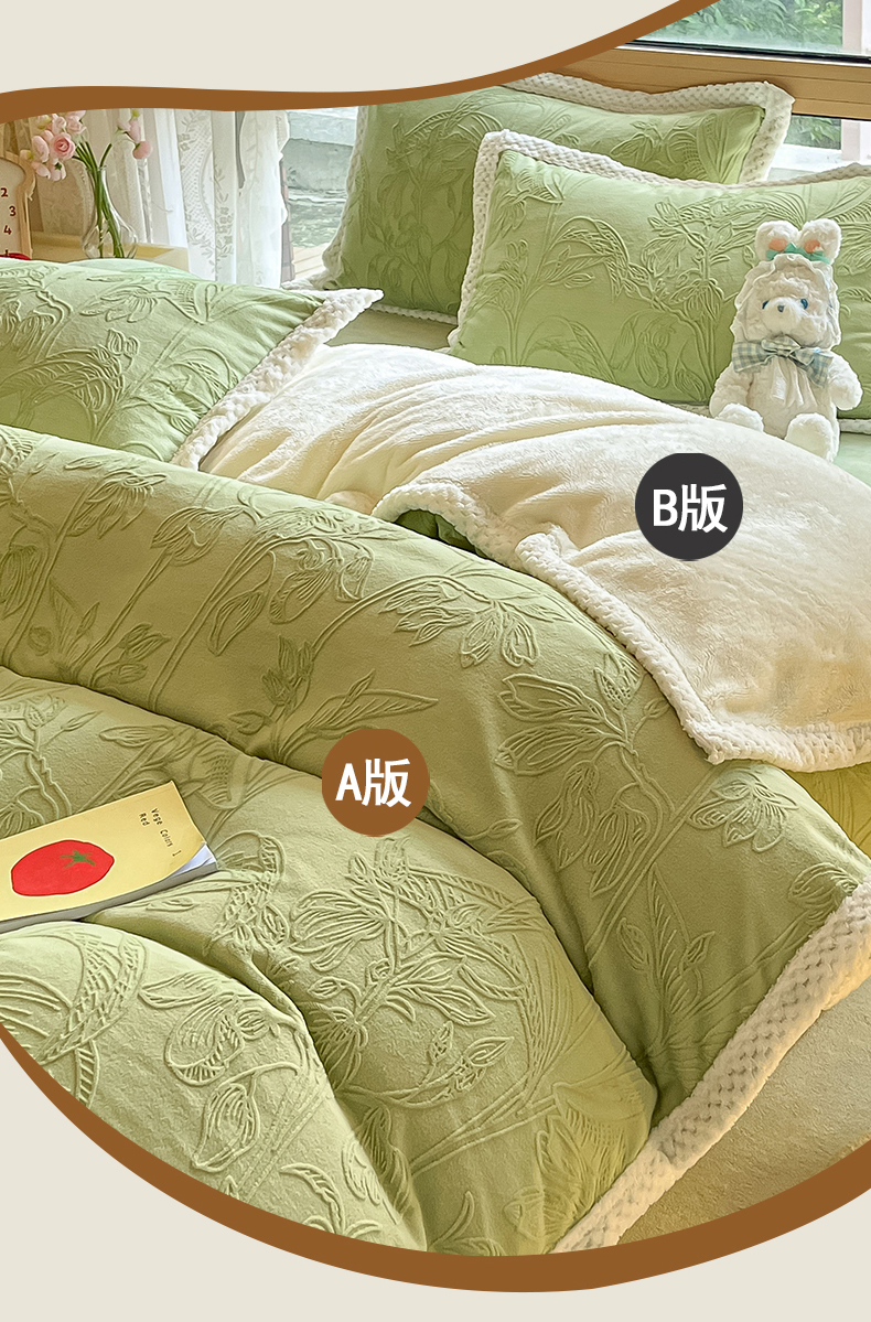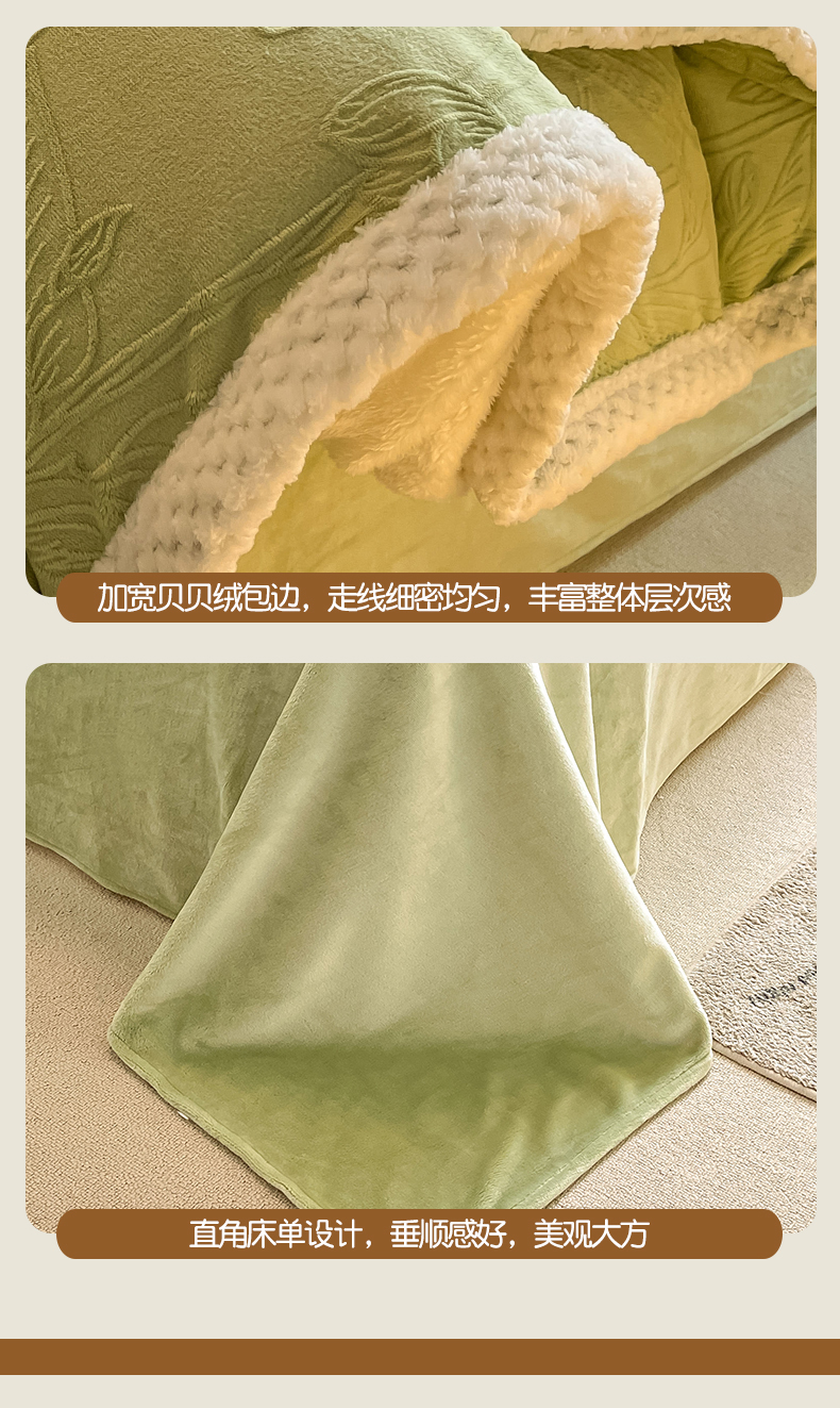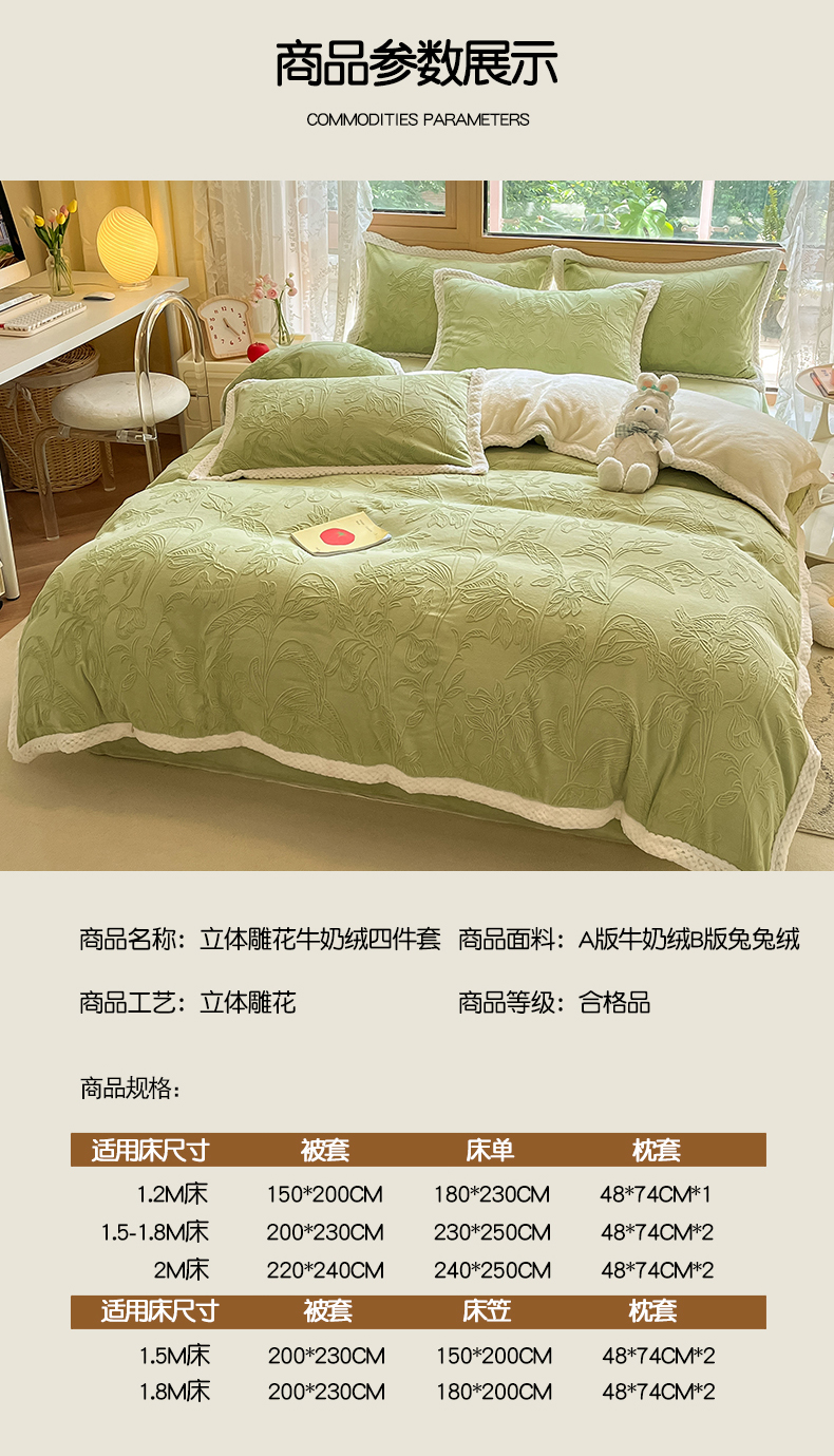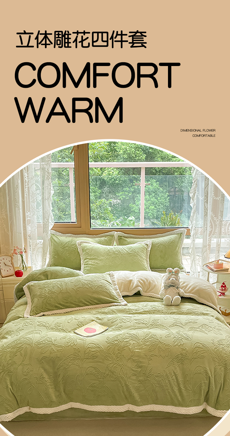当前位置: 91家纺网 > 商品网购 > 床品套件 > 四件套 > 雕花绒四件套 > 琪格格纺织 2025新款全消光包边立体简约清新雕花绒四件套 雕花包边-枝枝叶叶 浅绿