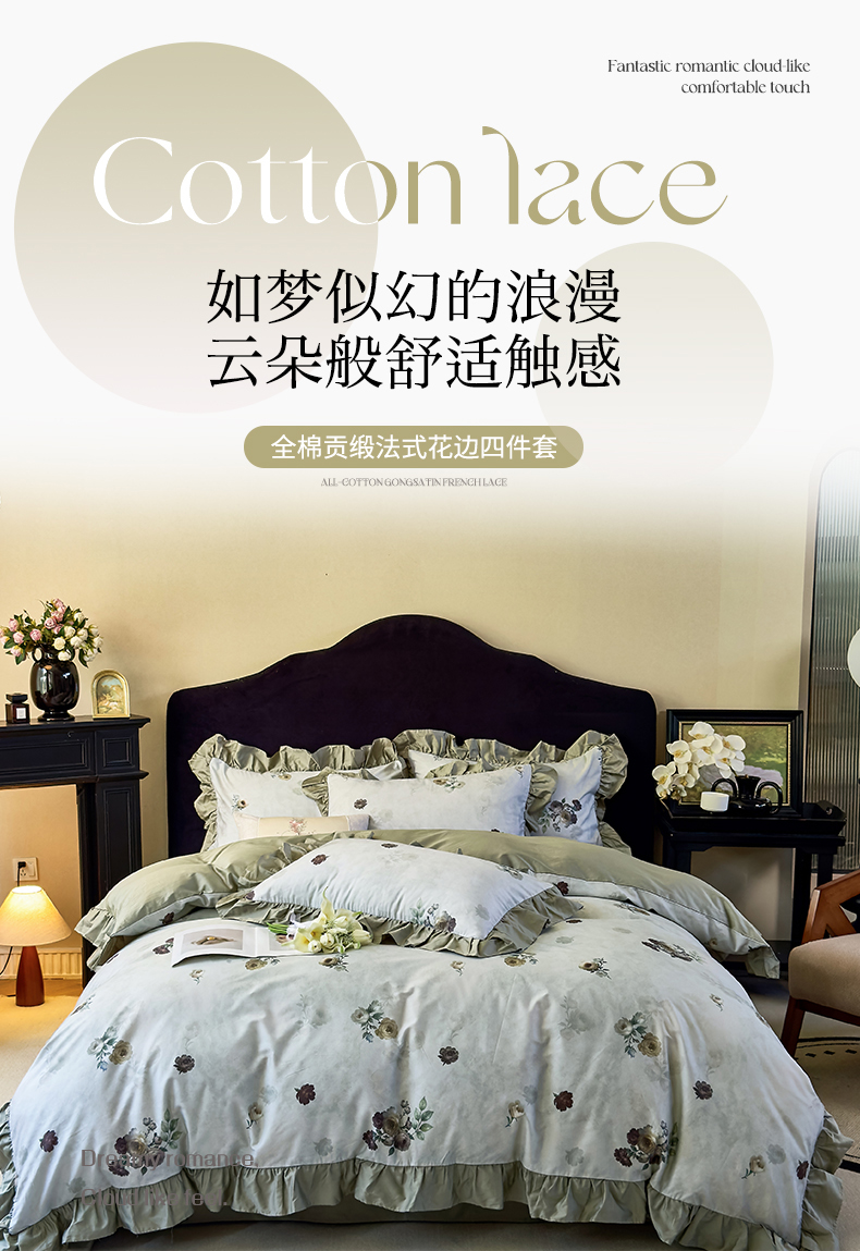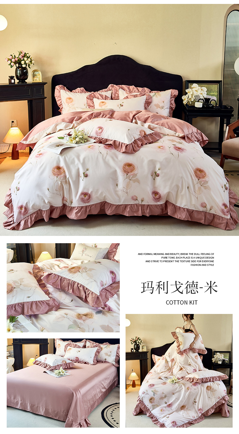 当前位置: 91家纺网 > 商品网购 > 床品套件 > 四件套 > 全棉普通四件套 > 未来家居 2025新款法式全棉贡缎花边款数码印花四件套 槿薇-红