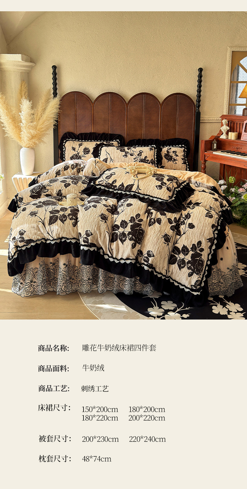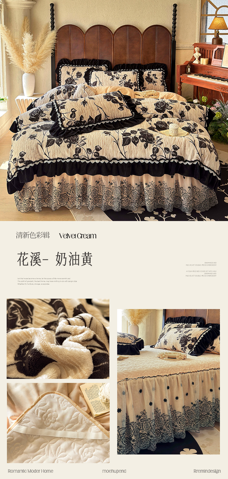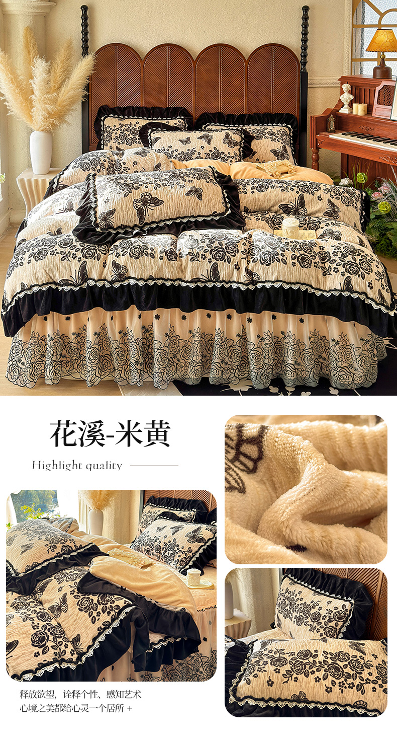 当前位置: 91家纺网 > 商品网购 > 床品套件 > 四件套 > 牛奶绒四件套 > 虹星家纺 2025新款雕花牛奶绒床裙四件套-花溪系列 花溪-奶油黄