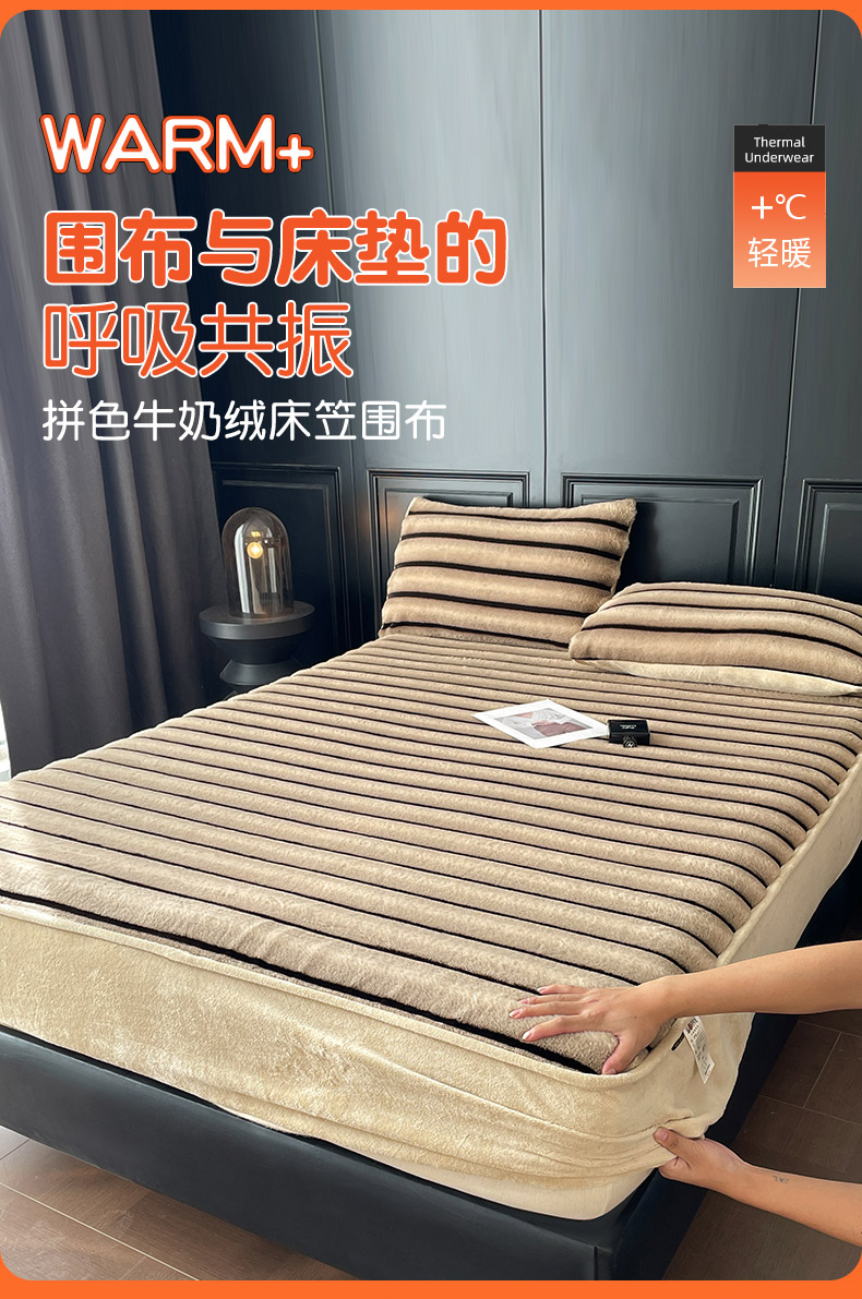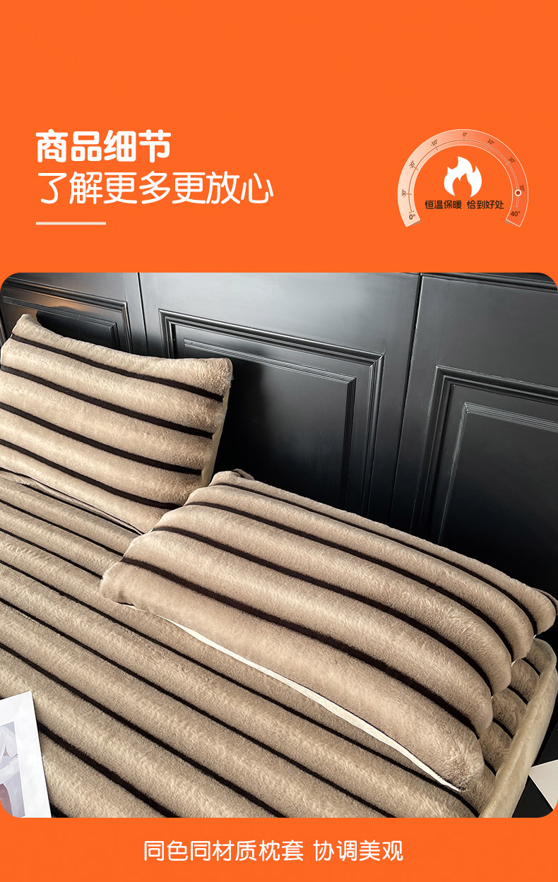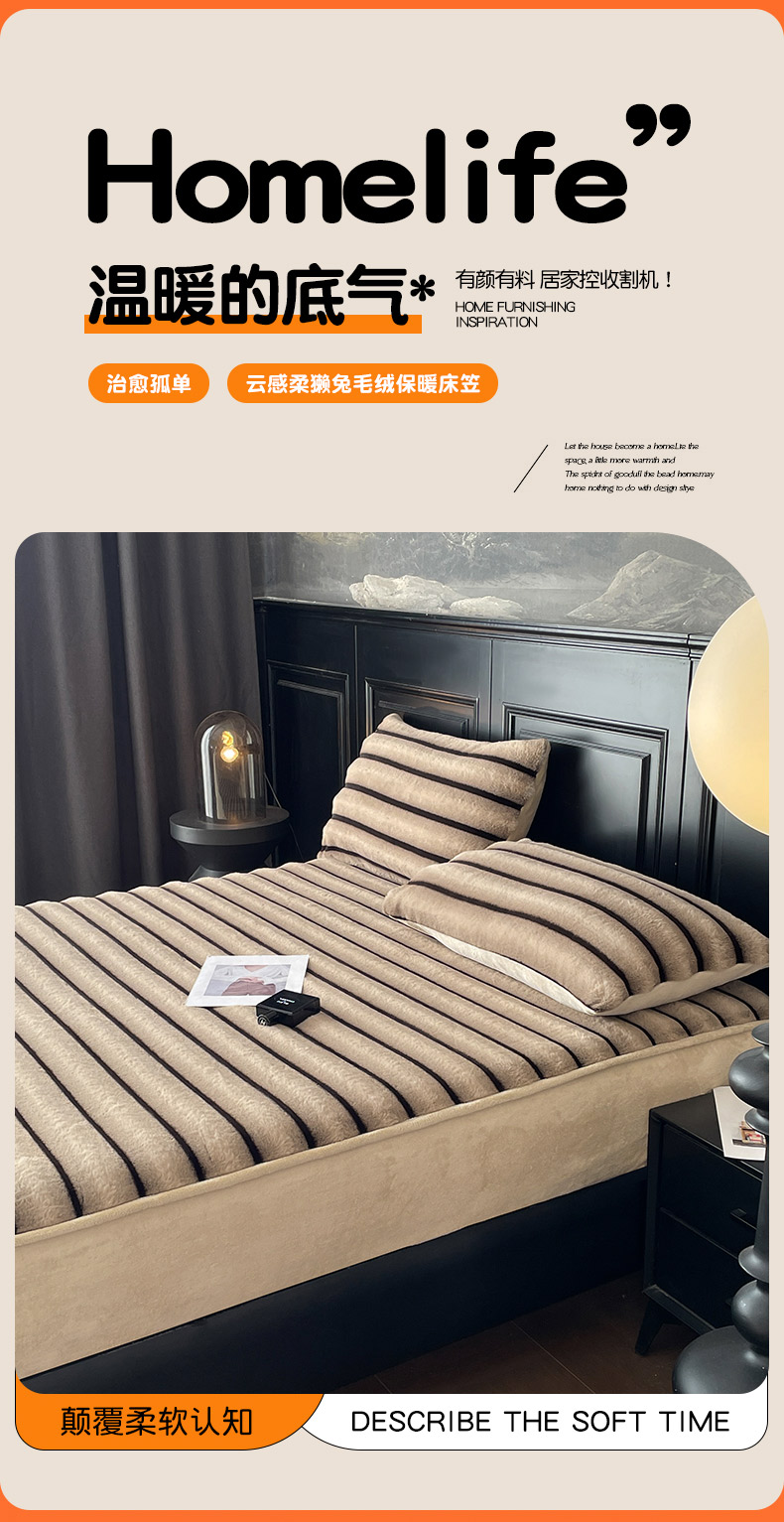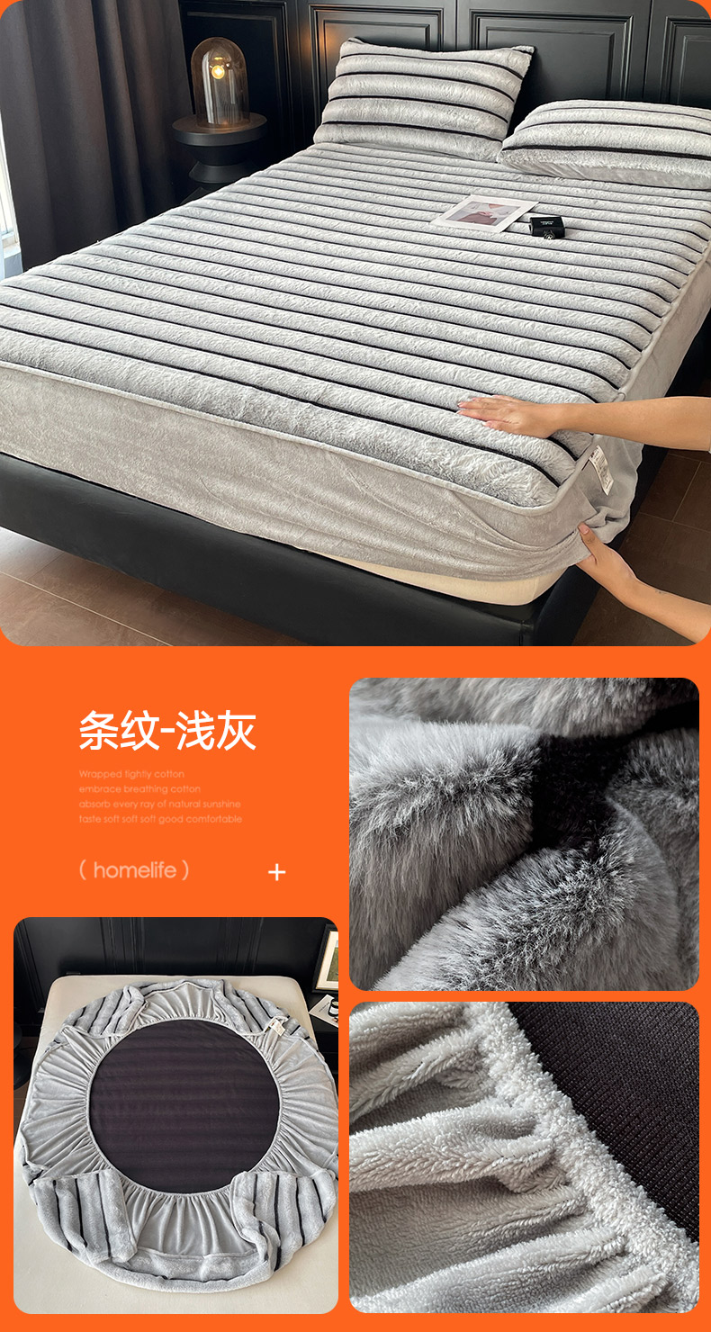 商品名称:库里梦家纺 2025新款美拉德托卡斯獭兔毛绒床笠三件套 条纹-深灰