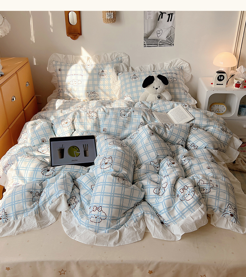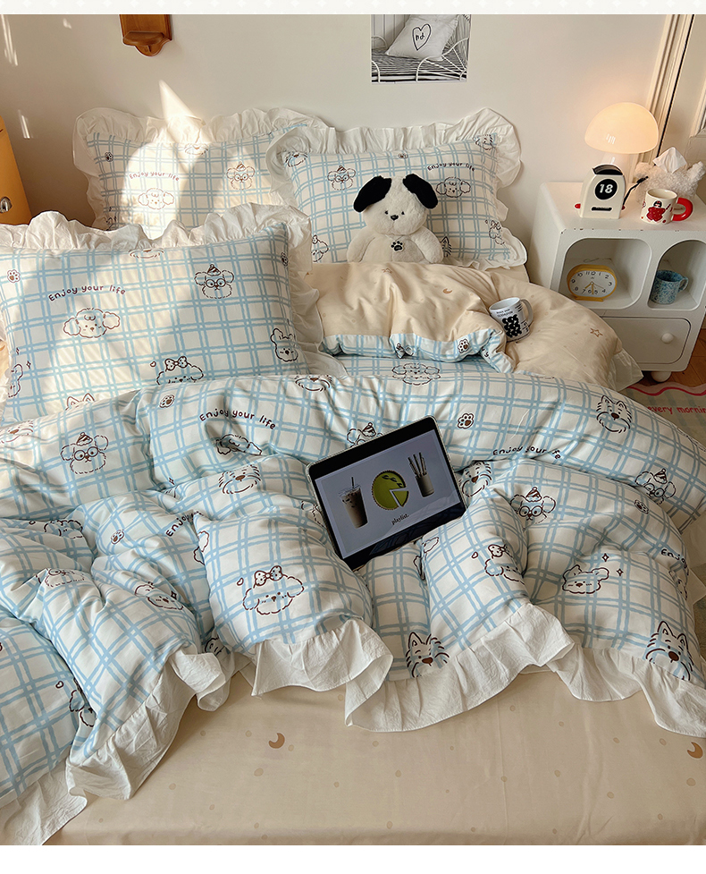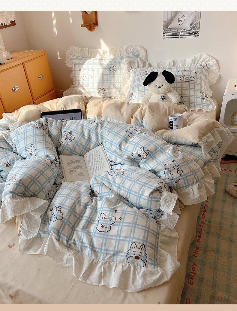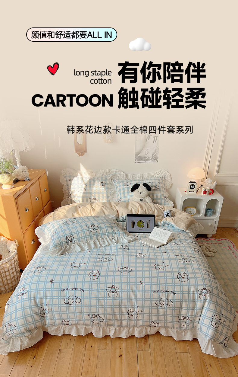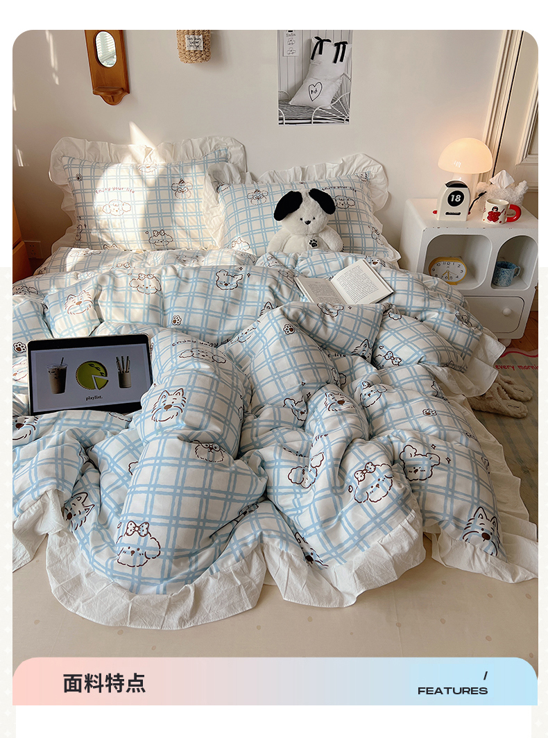 商品名称:六巷胡同 2026春夏新款韩系可爱风花边款卡通全棉四件套(第一系列) 花边蓝格美拉犬