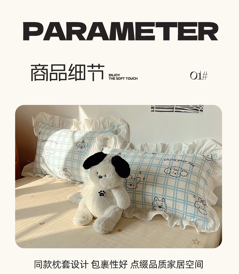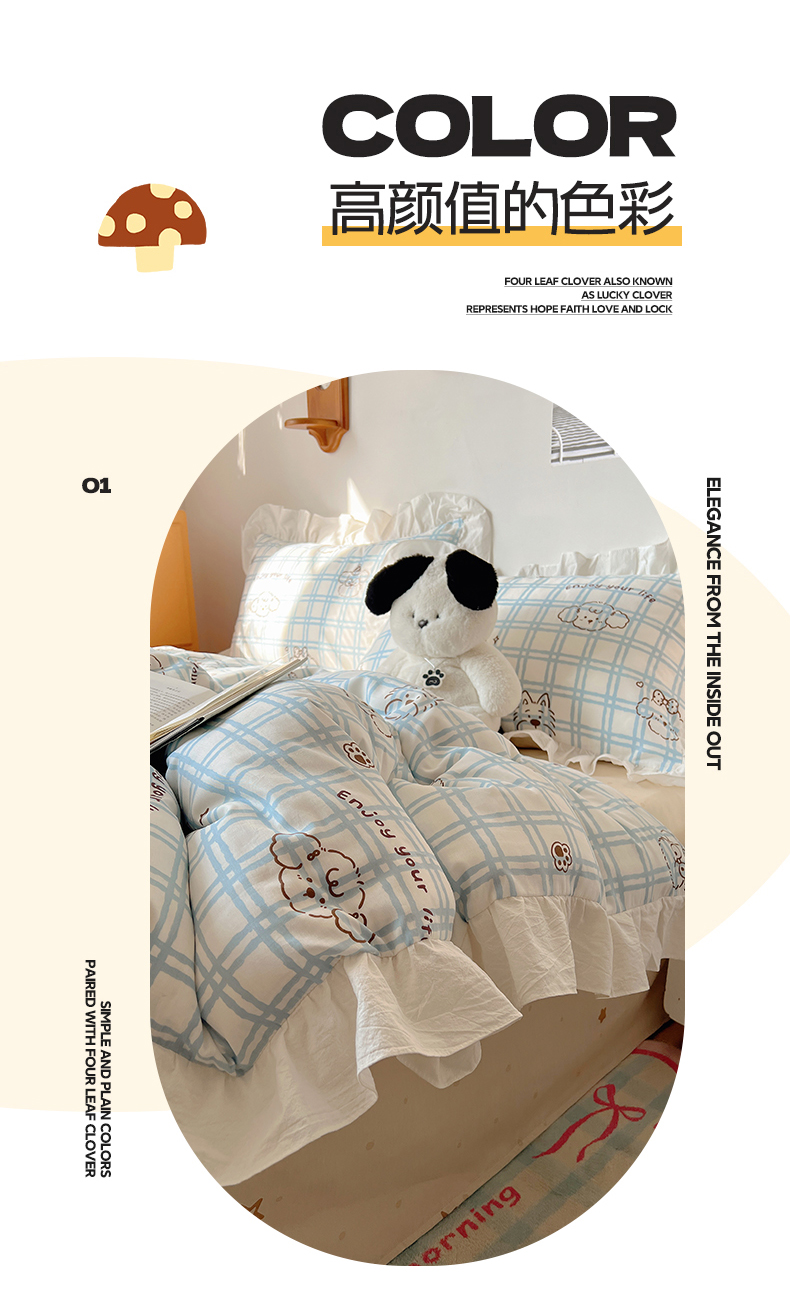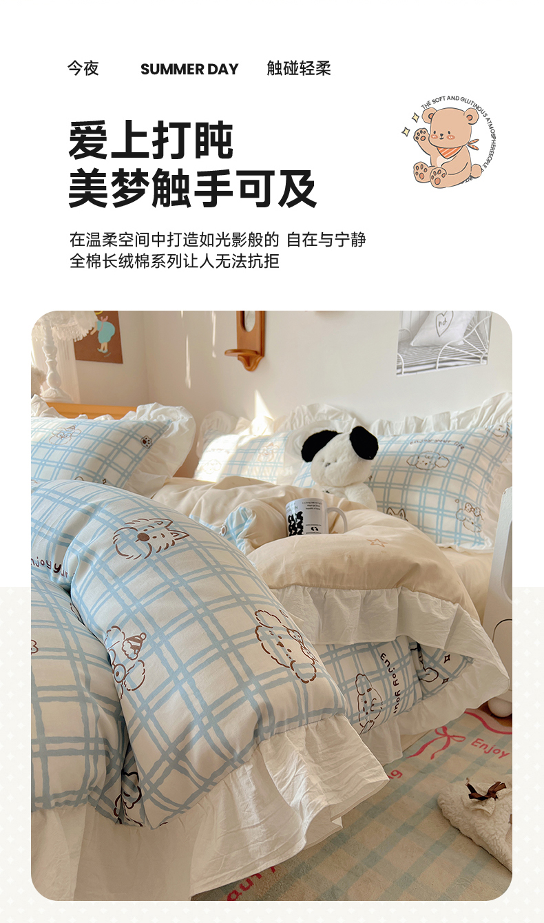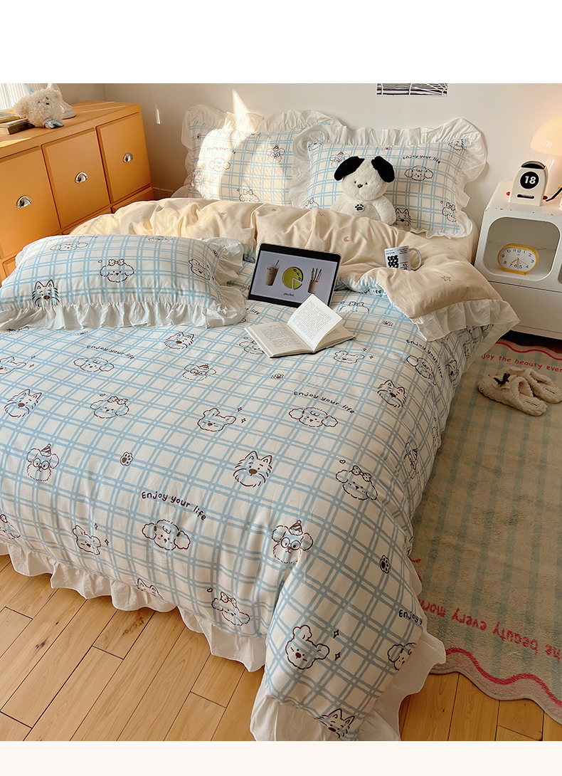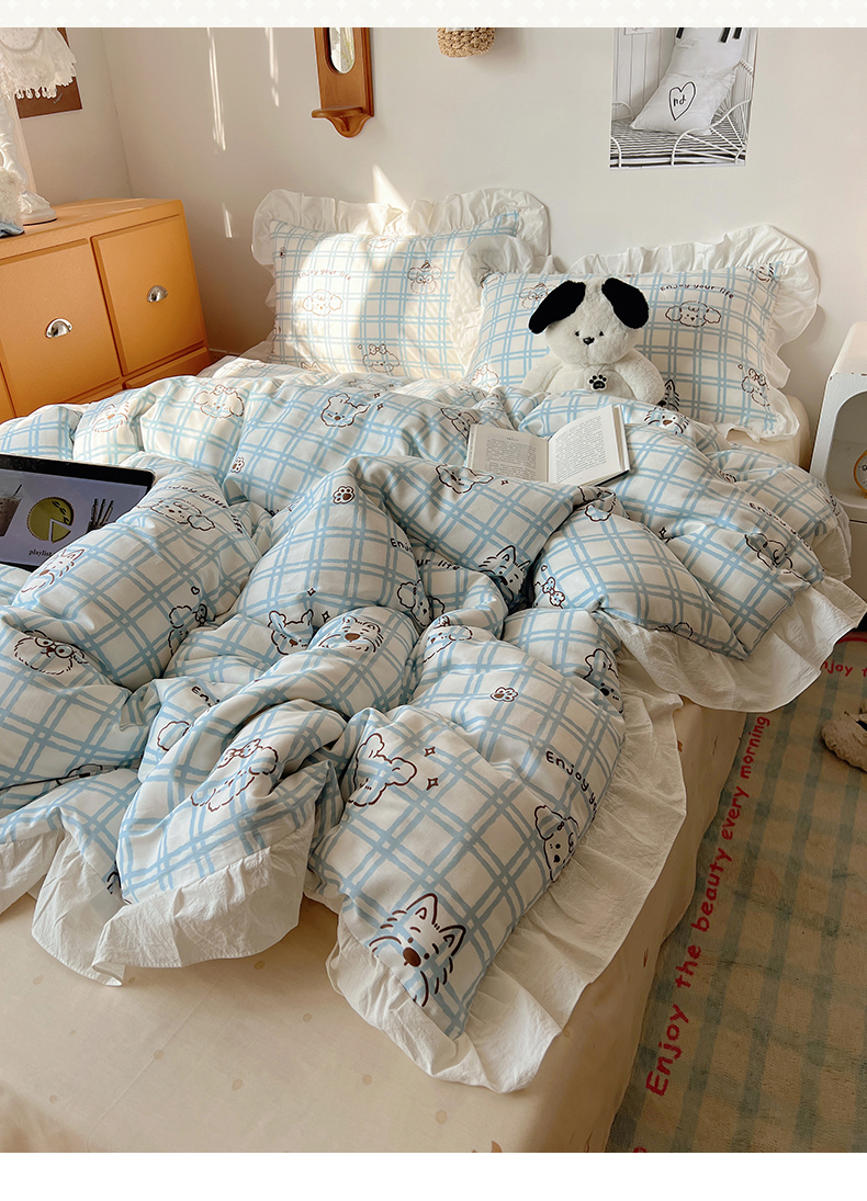 商品名称:六巷胡同 2026春夏新款韩系可爱风花边款卡通全棉四件套(第一系列) 花边蓝格美拉犬