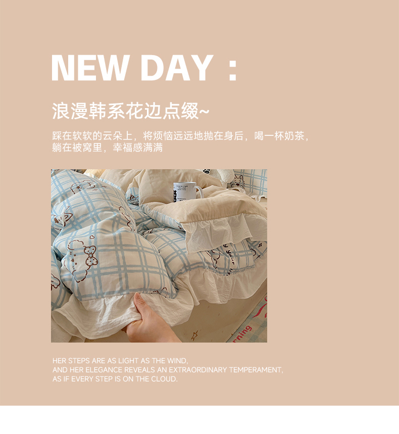 (总)六巷胡同 2026春夏新款韩式INS减龄花边款全棉卡通四件套,花边洋气柯基崽,花边欢乐课堂趴,花边假日庄园兔,花边蓝格奶油狗,花边浪漫碎花犬,花边秘境花园熊,花边奶油甜心熊