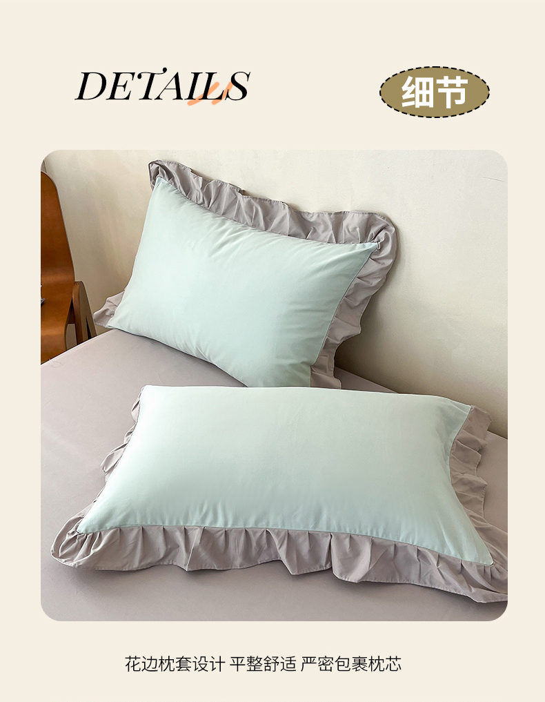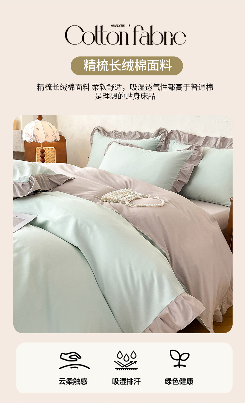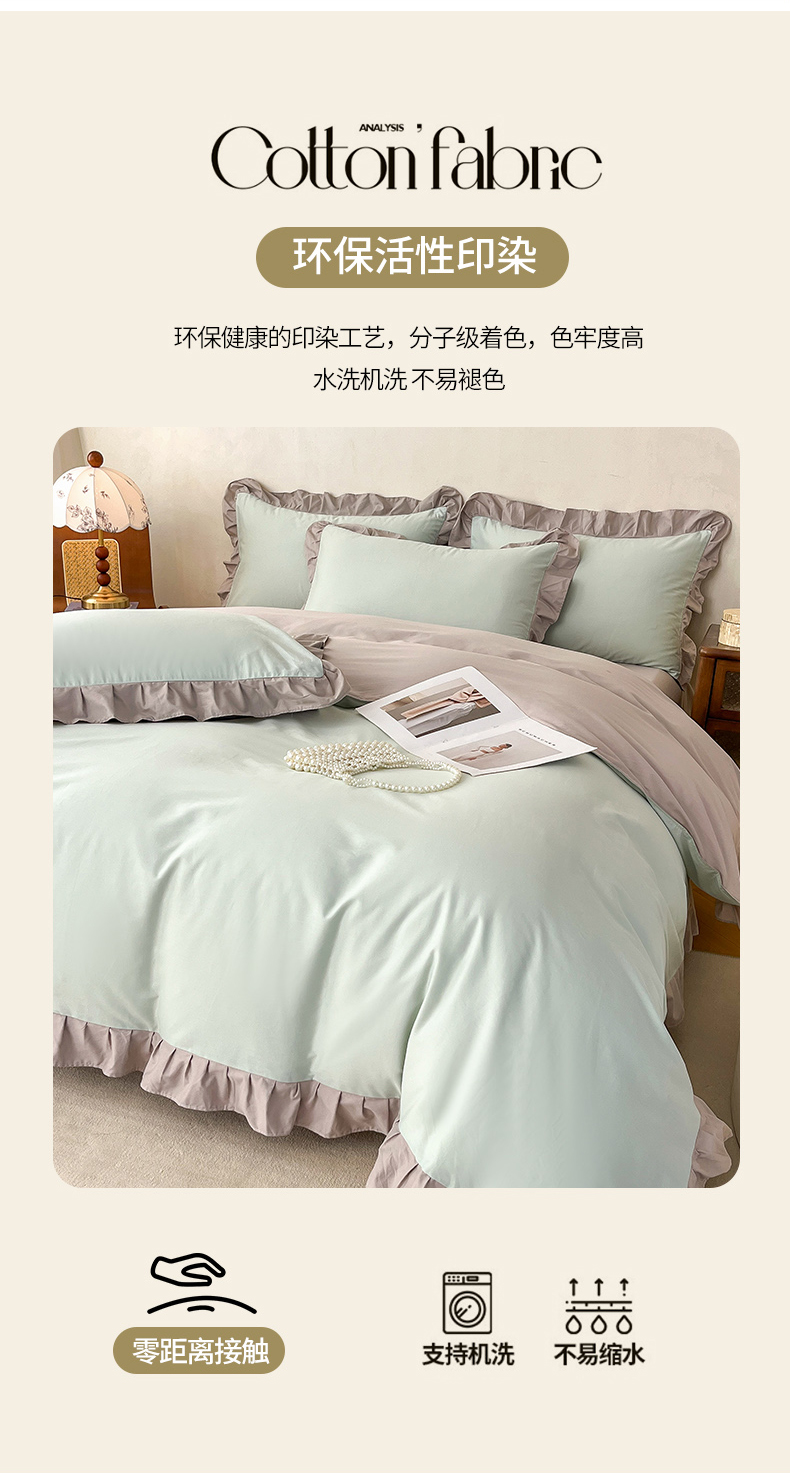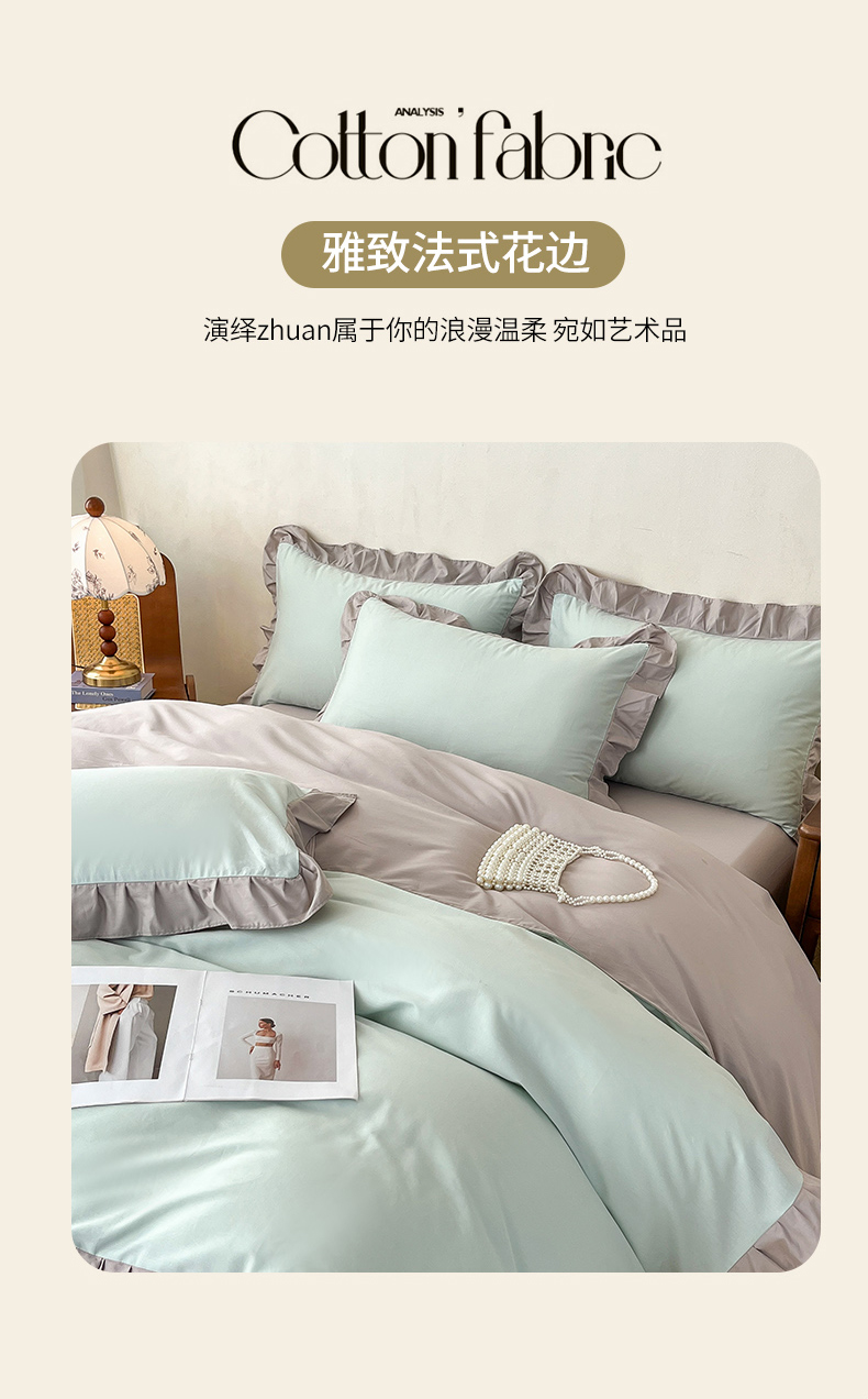 当前位置: 91家纺网 > 商品网购 > 床品套件 > 四件套 > 全棉普通四件套 > 艾迪尚家纺 2026新款法式韩版荷叶边纯色长绒棉四件套 薄荷青灰