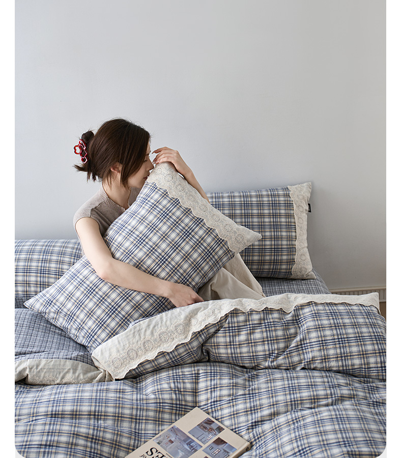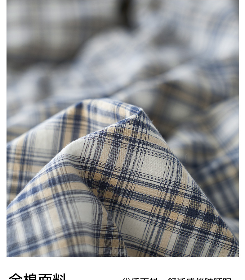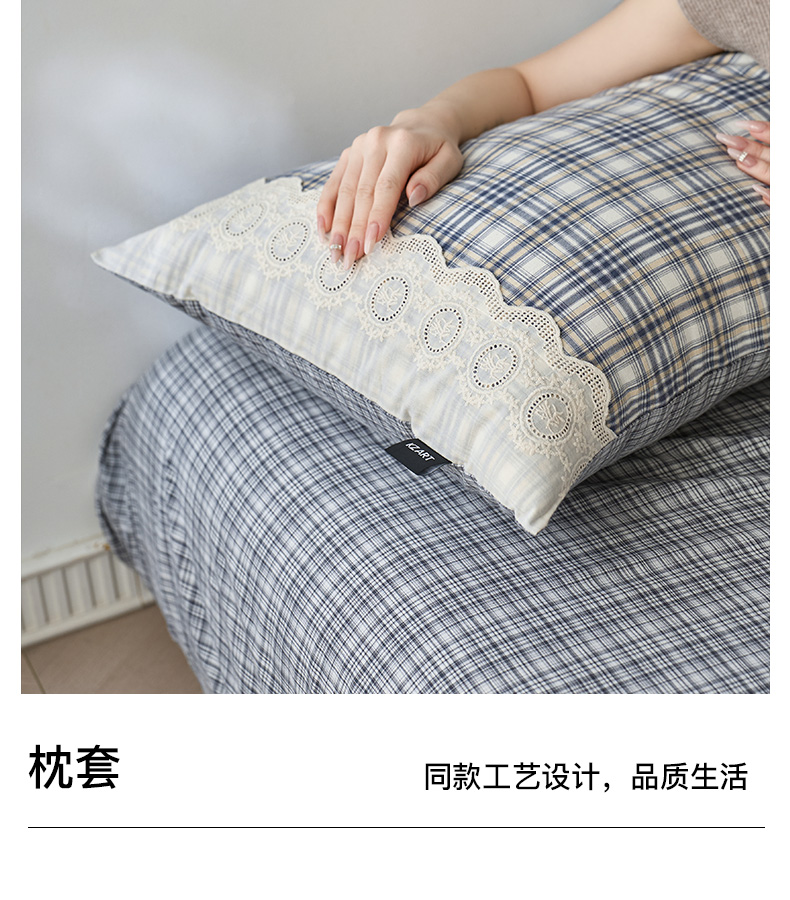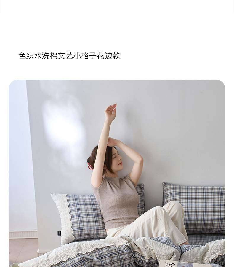 商品名称:卡姿家纺 2026春夏色织水洗棉文艺小格子花边款 利奥-烟蓝