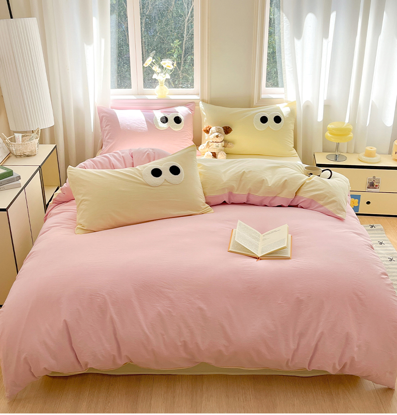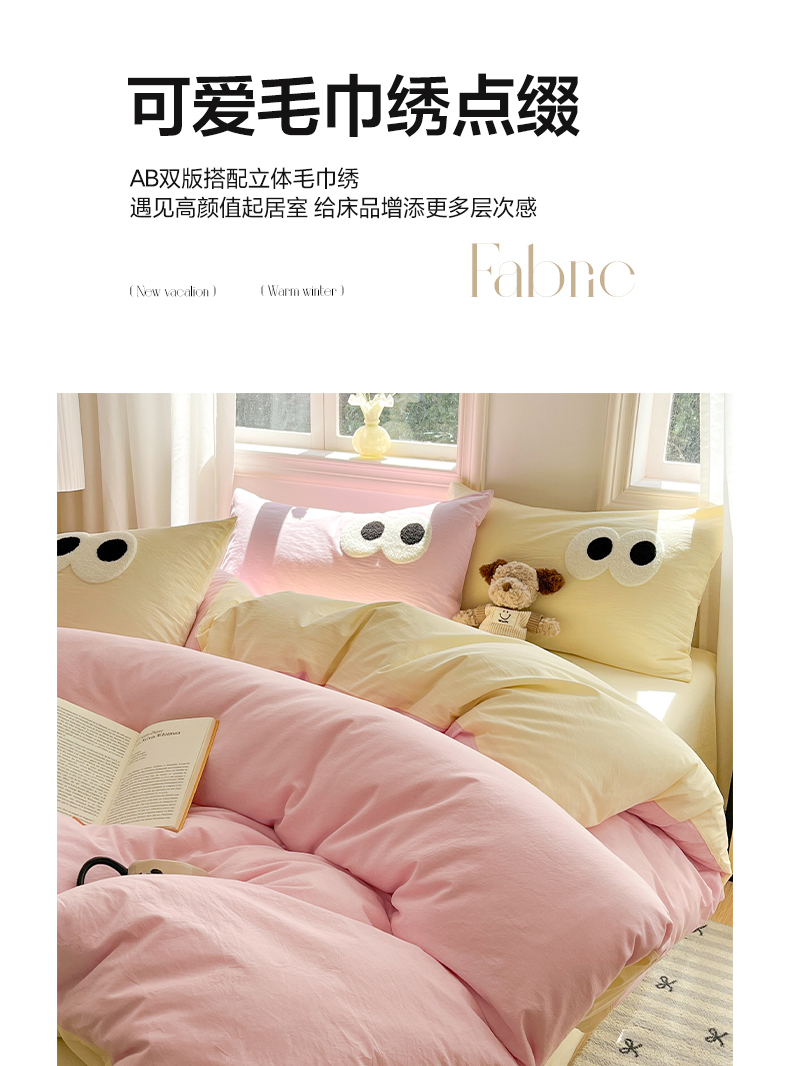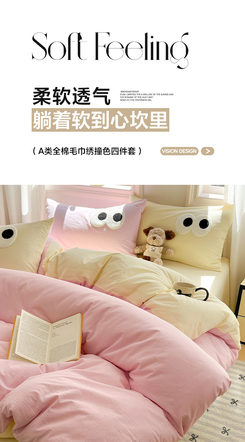 禧澜庭 2026新款全棉纯棉水洗棉四件套大眼毛巾绣 白桃粉+奶油黄
