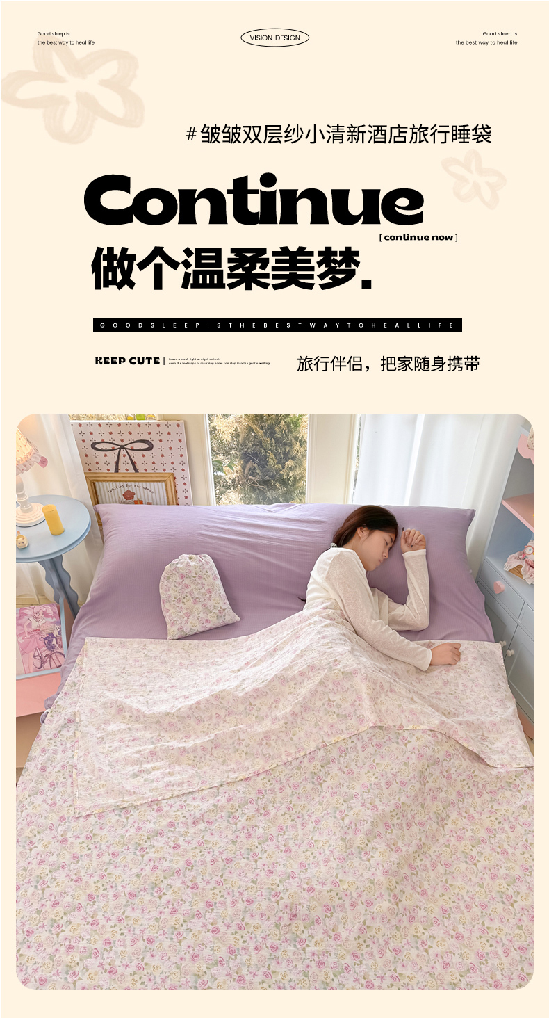 (总)Sweet dreams甜梦 2026新款A类皱皱双层纱小清新酒店一体式旅行睡袋,爱心格子,大脸猫,粉色小碎花,格子小兔,狗狗世界,黄色小碎花,马到成功,马上有钱,南瓜小兔,奇趣小动物,碎花小狗,碎花樱桃,田园姑娘,晚安小熊,小兔仔,星星小狗,异域风情,紫玫瑰,紫色小碎花