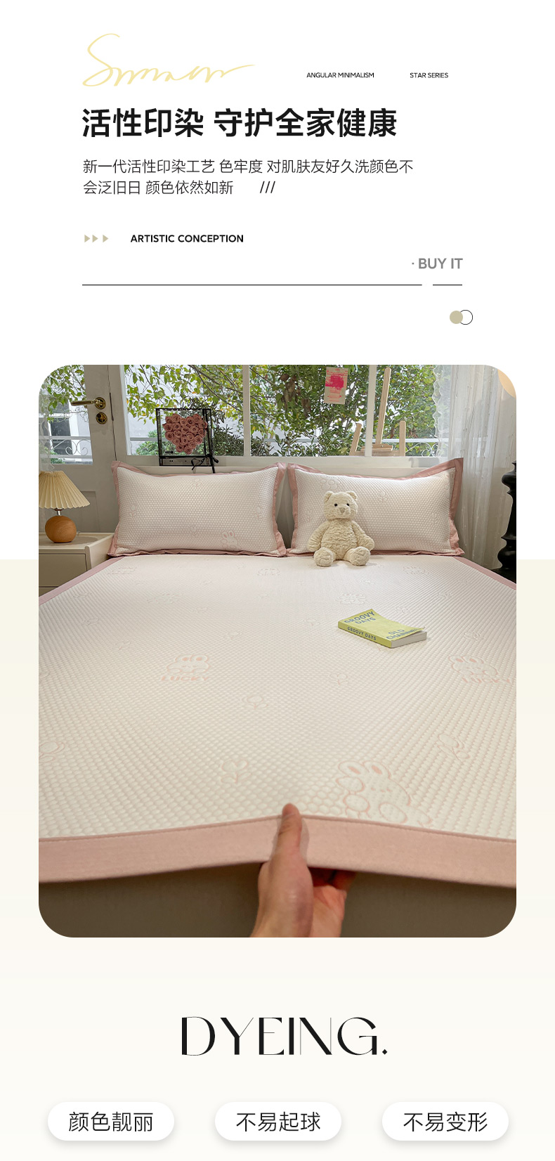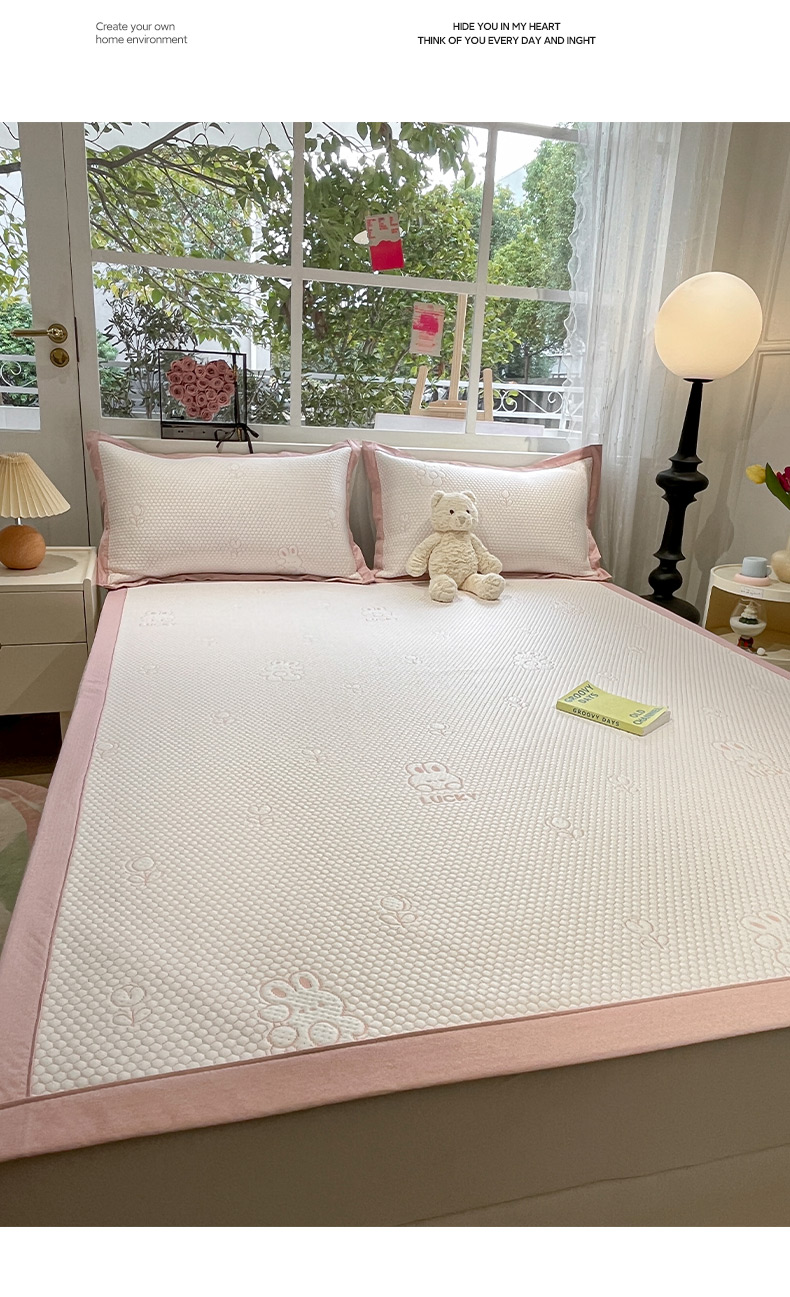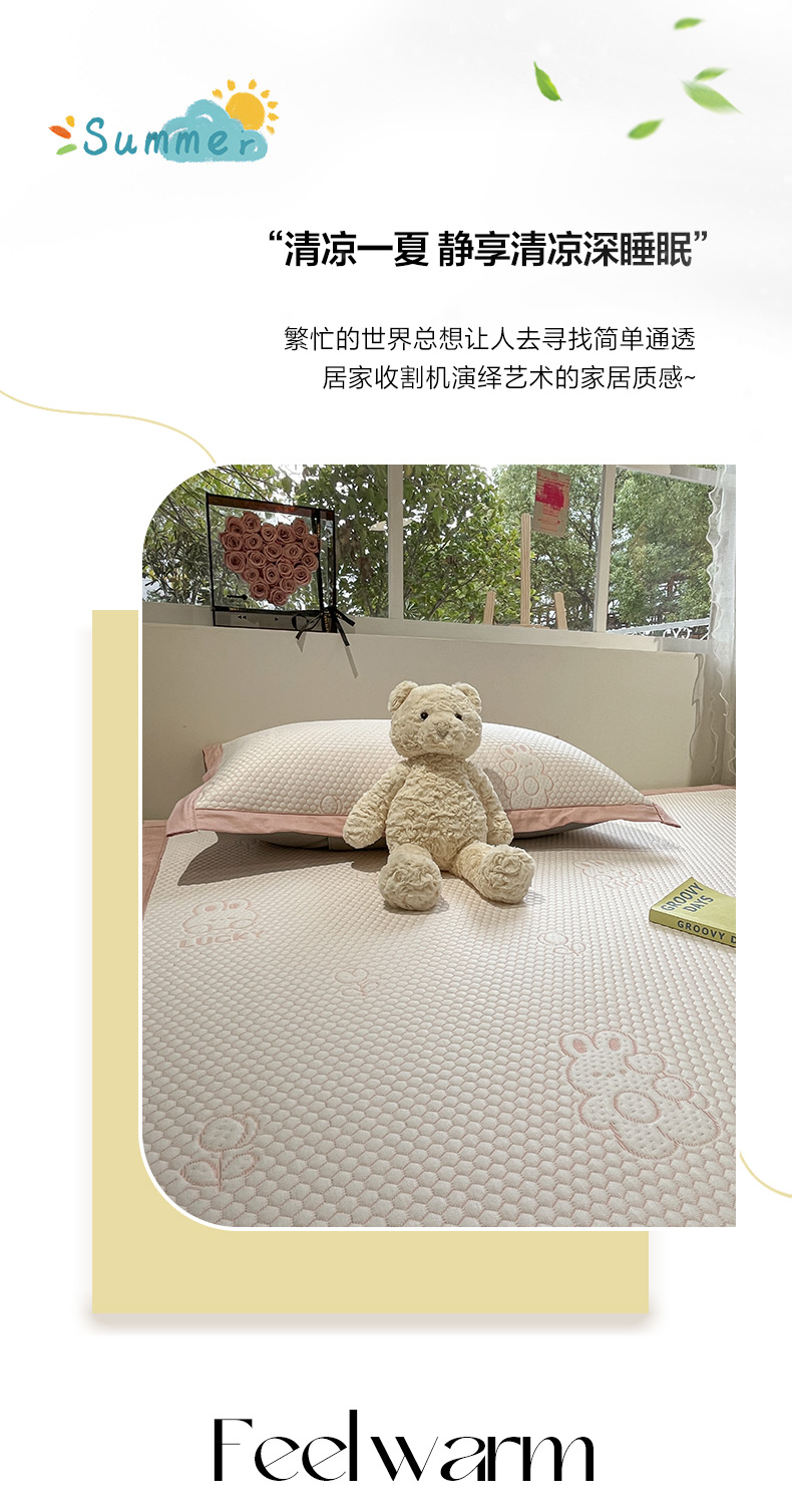 (总)雅居纺家纺 2026新款A类加厚三明治底提花小清新凉感席床笠款凉席席子,粉小兔,蝴蝶结猫咪,领结小猫,平安熊猫,山茶花,太空星球,晚安小狗,小熊熊,星星小熊,悠闲花园