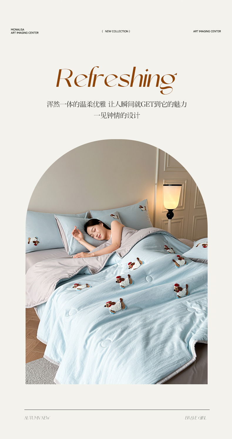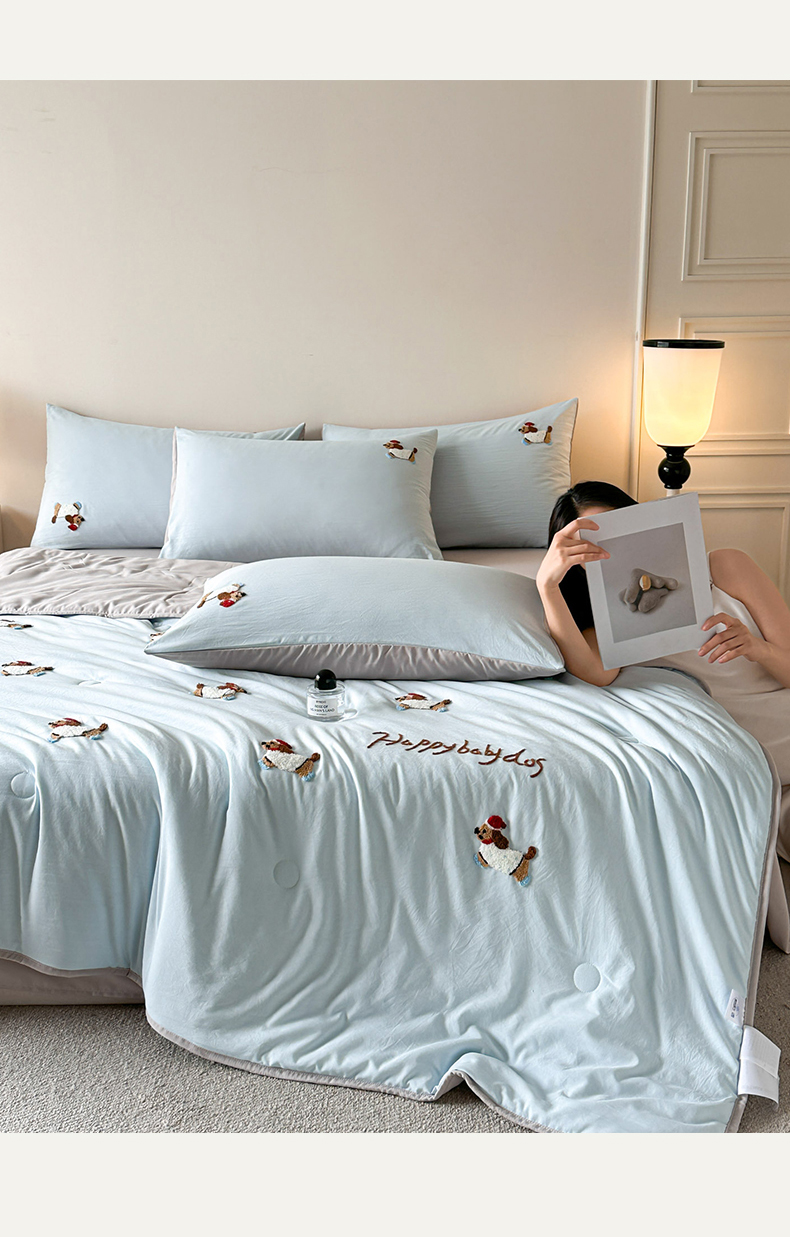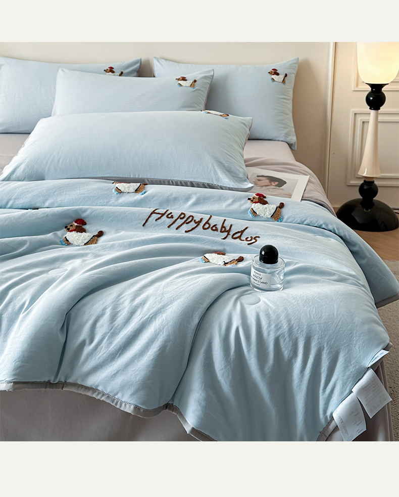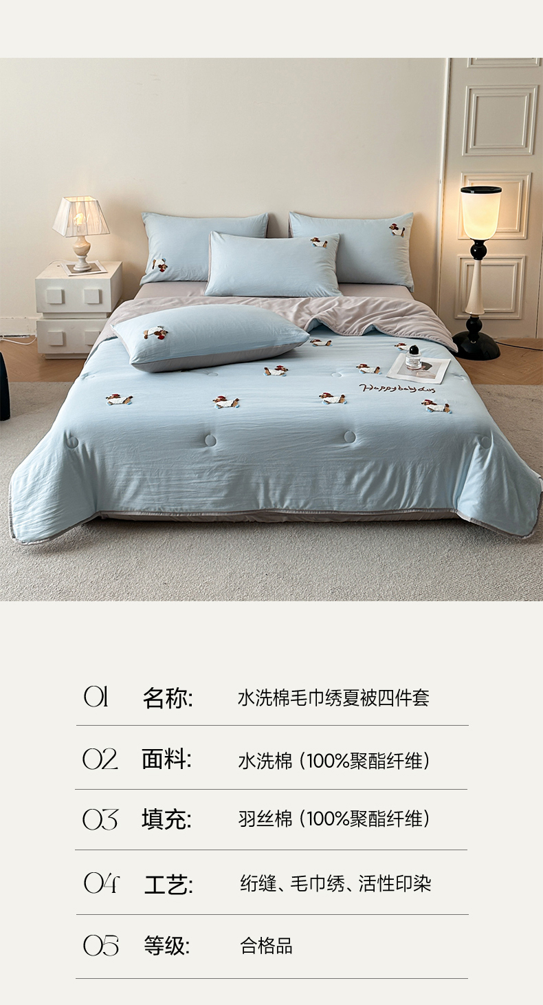 • 91家纺网 家纺一手货源 找家纺 遇见家居生活馆 2026新款水洗棉毛巾绣夏被四件套-艾拉 艾拉-小狗飘蓝+浅灰