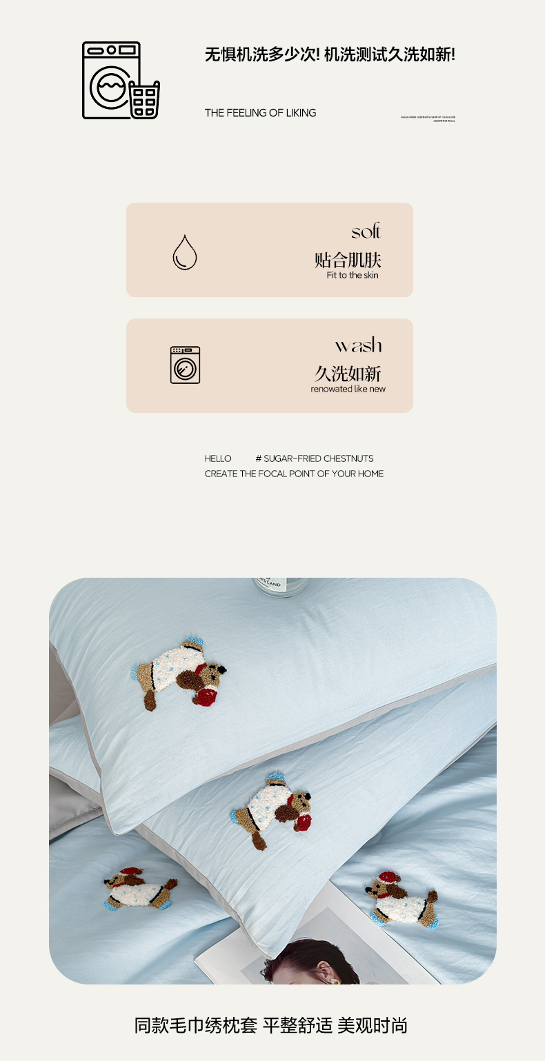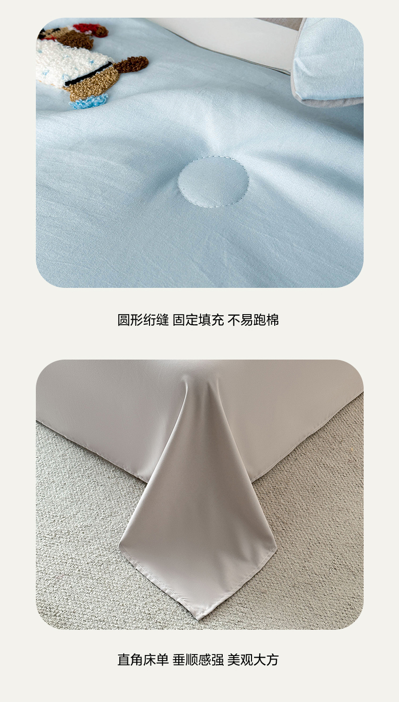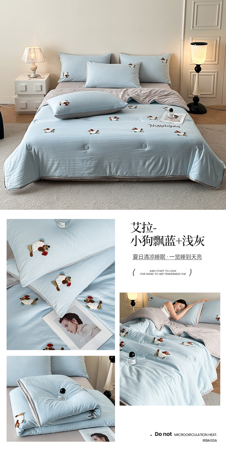 • 91家纺网 家纺一手货源 找家纺 遇见家居生活馆 2026新款水洗棉毛巾绣夏被四件套-艾拉 艾拉-小狗飘蓝+浅灰