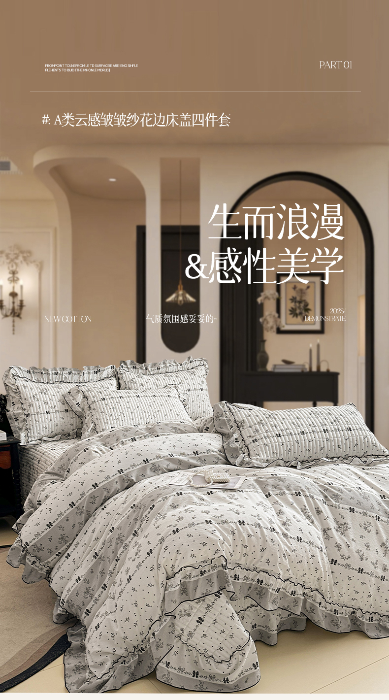 当前位置: 91家纺网 > 商品网购 > 床品套件 > 四件套 > 双层纱四件套 > 眠势力 2026新款双层纱花边床盖四件套加厚夹棉云感皱皱纱大花边床单套件赫本风 水墨蔷薇