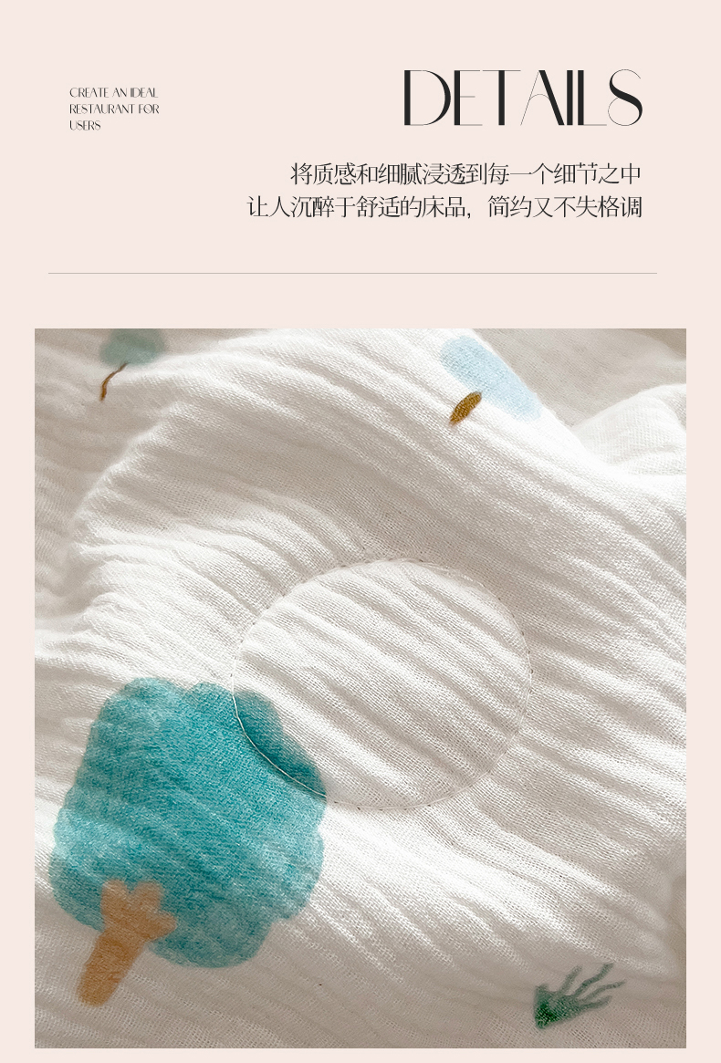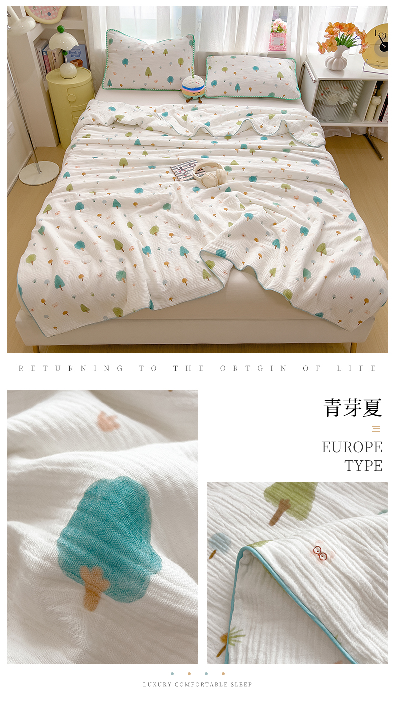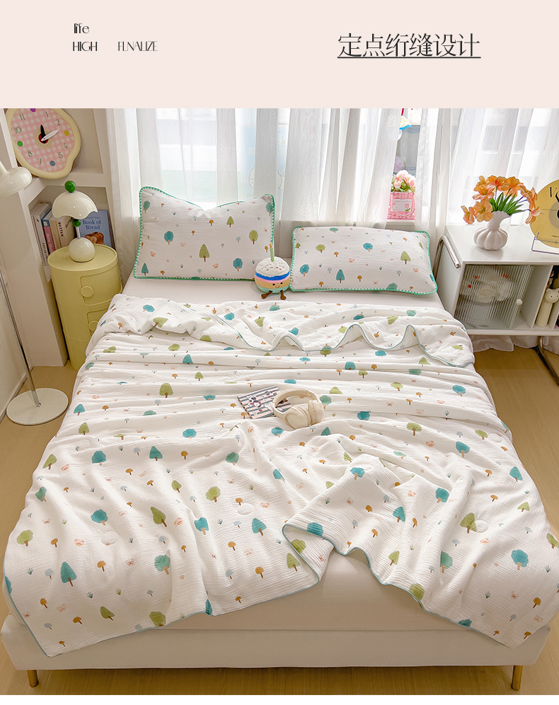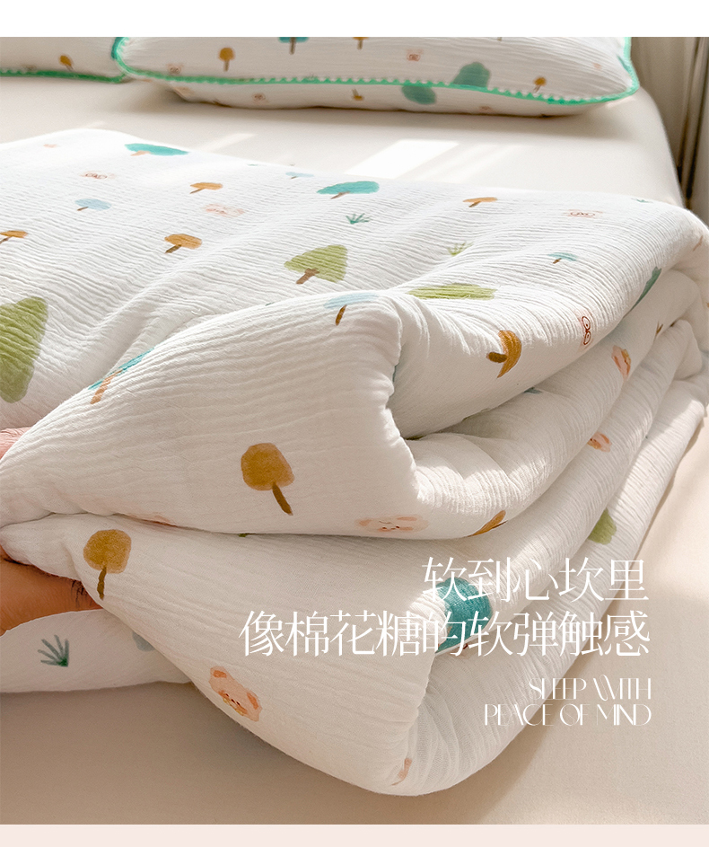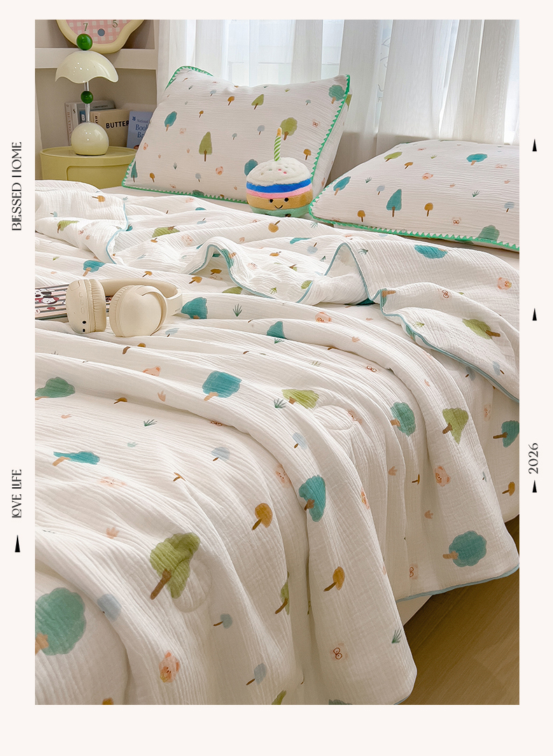 商品名称:兄弟坊 2026春夏新款全棉纯棉印花双层皱皱纱(滚边款)夏被纱布夏凉被午睡被盖毯夏凉被 青芽夏