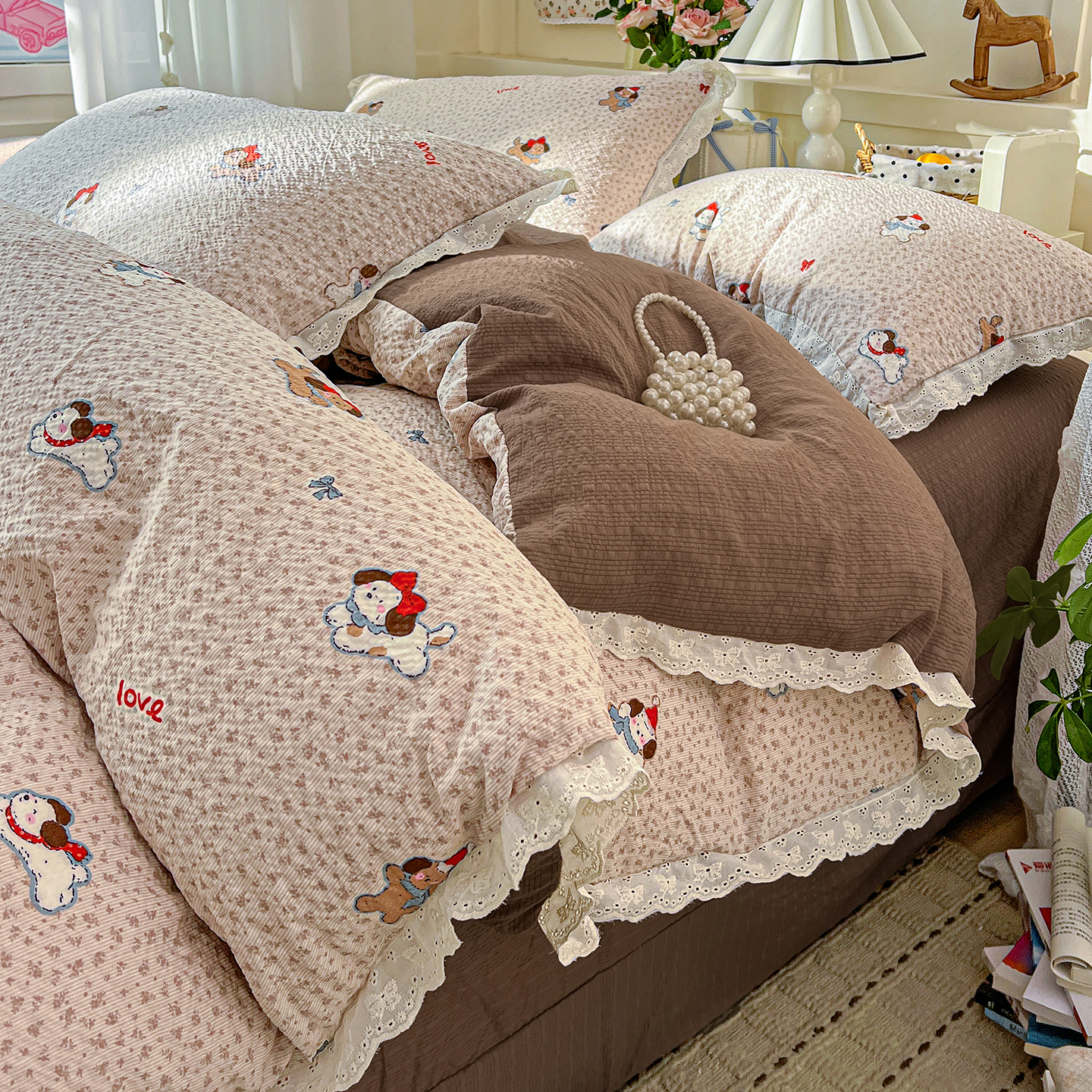 (总)一比一家纺 2026新款泡芙纱花边四件套,捕梦星人 - 黄,捕梦星人 - 红,蝶屿,费尔岛狗狗,果子小象,红啵啵,红色小马,花影,花与兔,咖啡狗,萌趣小熊,喵喵日记,奶棕小马,青梅酱,清雅,情书,小欢喜,小黄人,心愿,樱桃布丁,紫色花田,棕熊宝贝,组合图