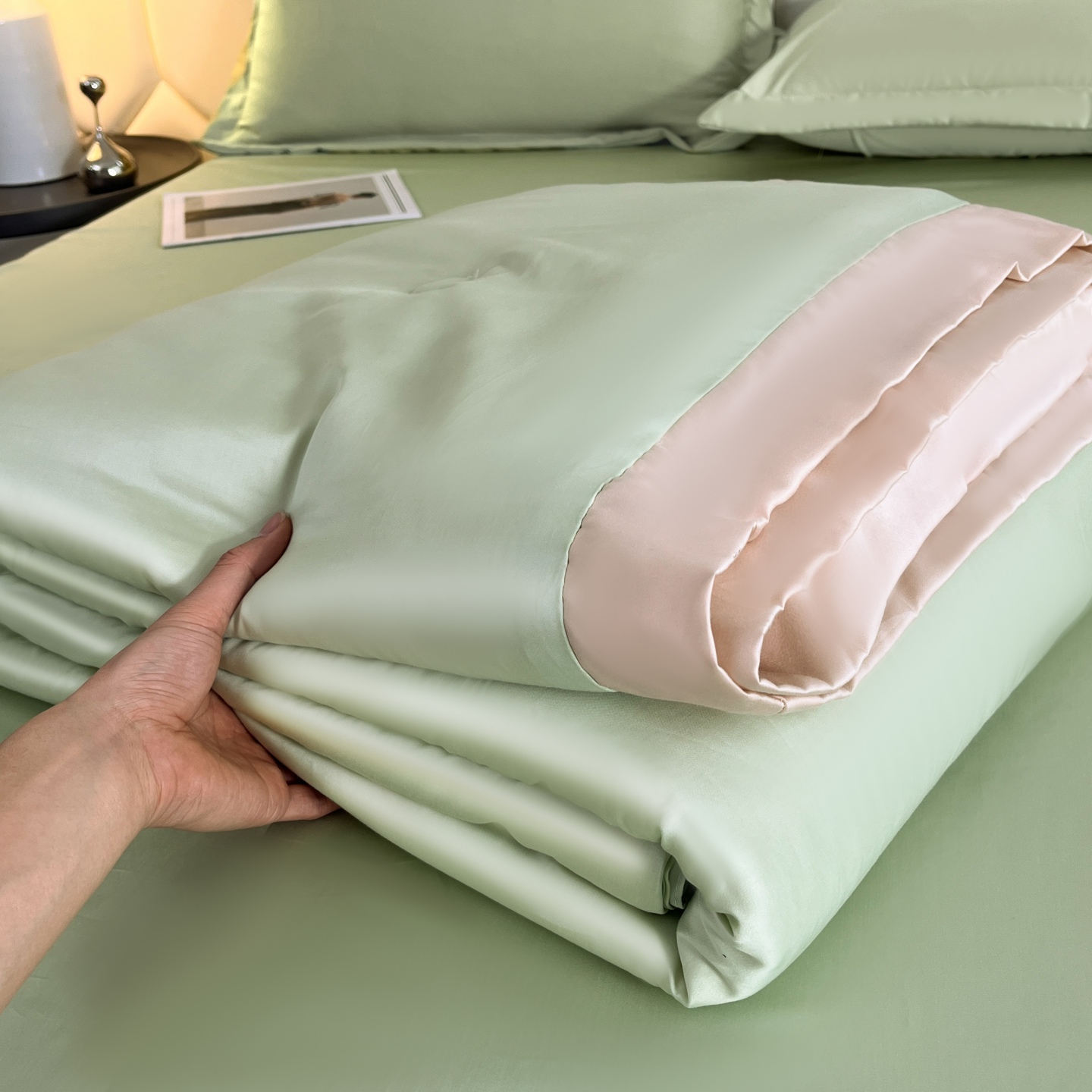 商品名称:蕾诺家纺 2026新款水洗真丝夏被纯色宽边夏被 水洗真丝-嫩芽绿