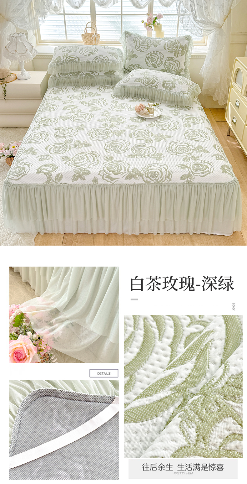 商品名称:优贝家纺 2026新款-高克重PE聚乙中分子提花刺绣法式花边复合凉感软席山茶花系列 白茶玫瑰-深绿