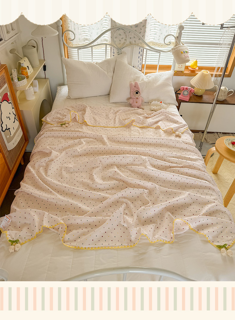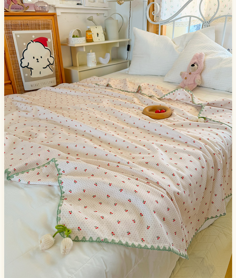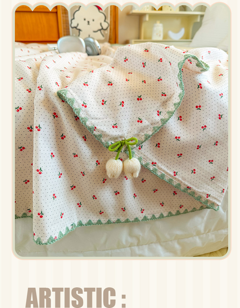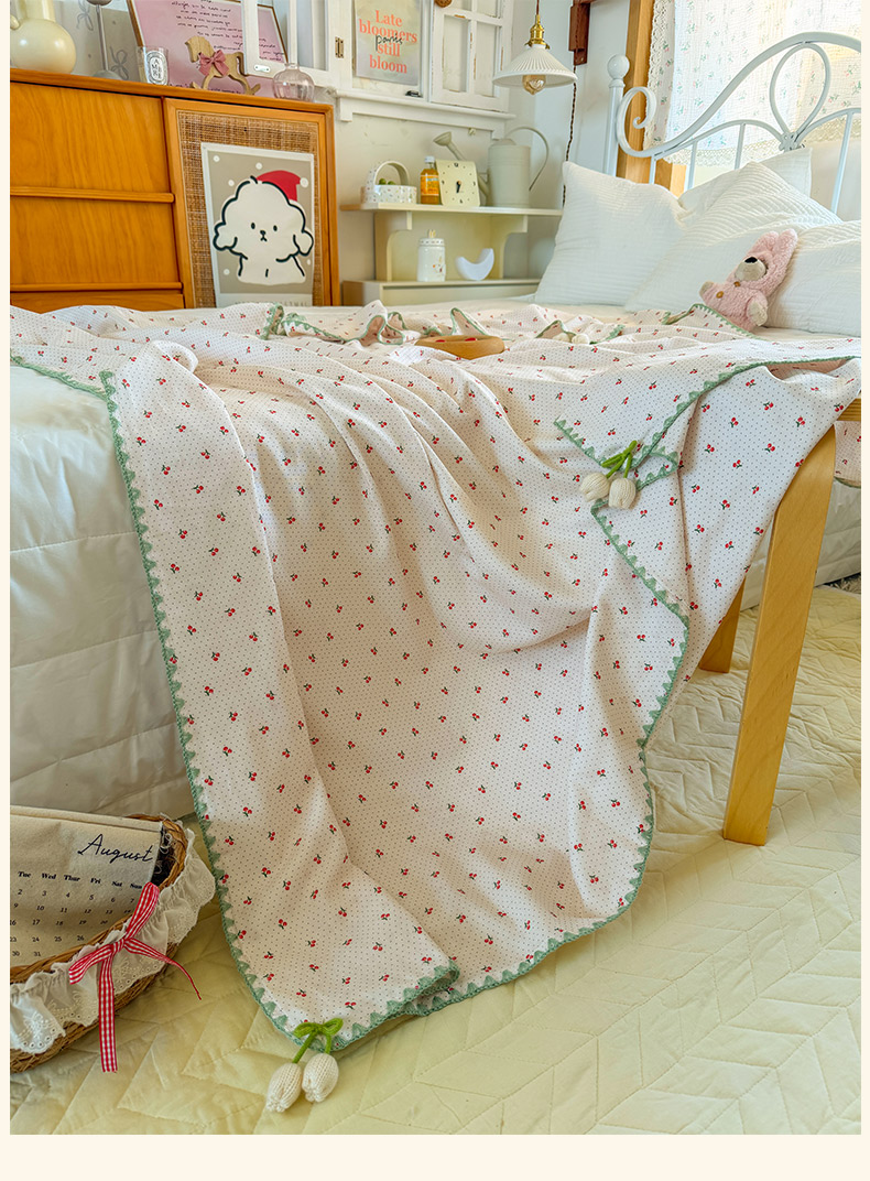 商品名称:潮邦创意家居 2026新A类全棉双层纱三角针四角郁金香吊坠盖毯—郁金纱语系列【含A类检测报告】 樱桃圆点