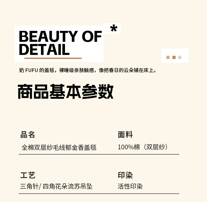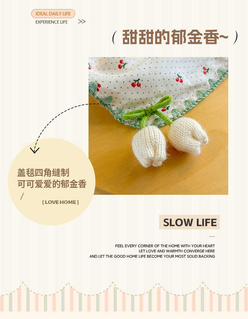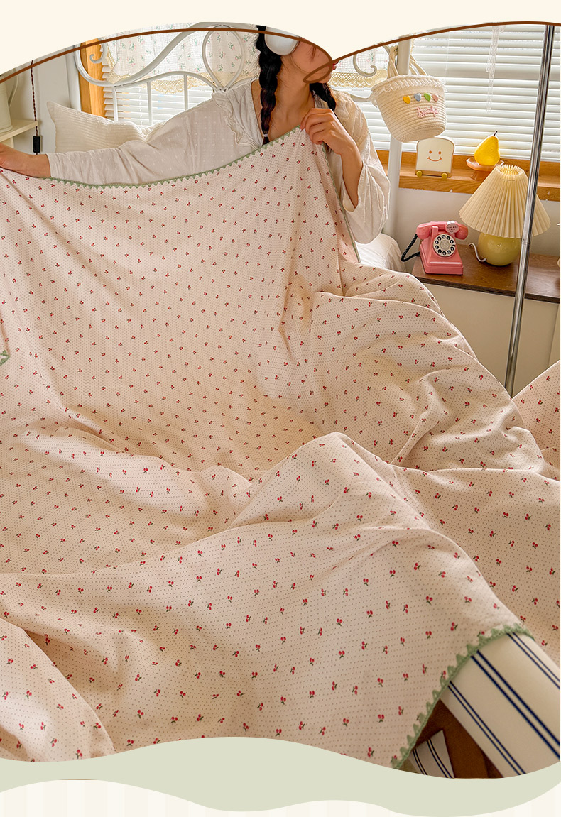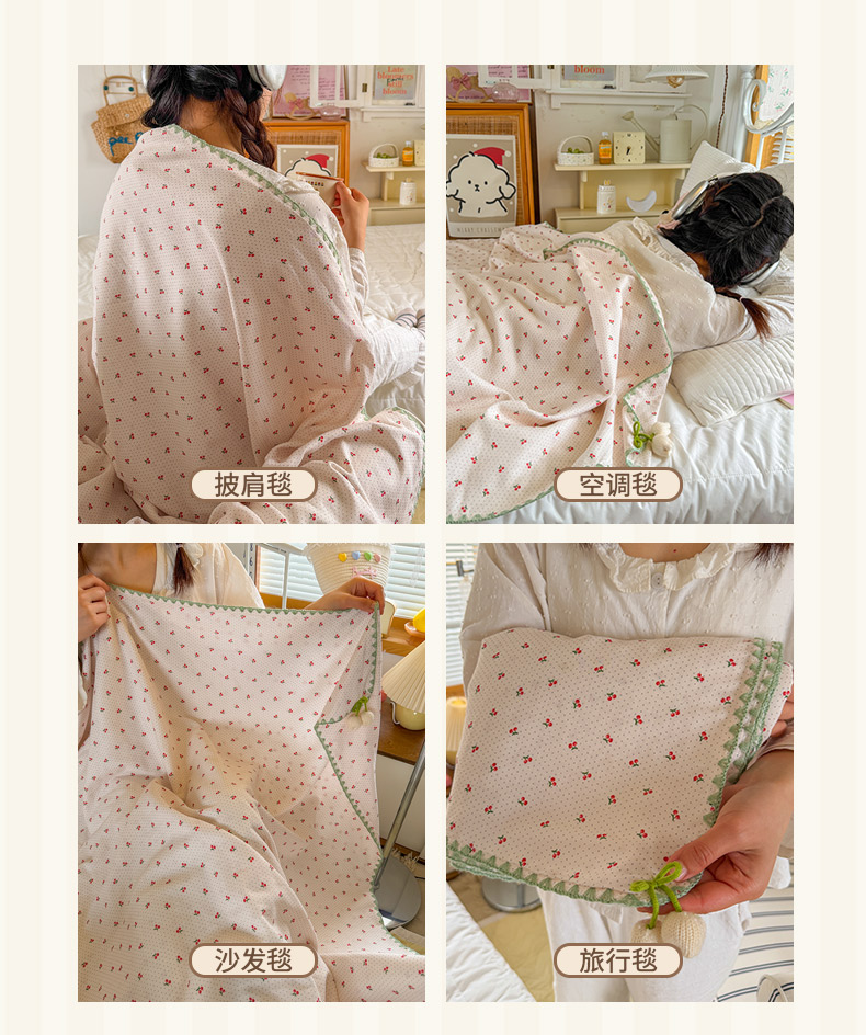 商品名称:潮邦创意家居 2026新A类全棉双层纱三角针四角郁金香吊坠盖毯—郁金纱语系列【含A类检测报告】 樱桃圆点