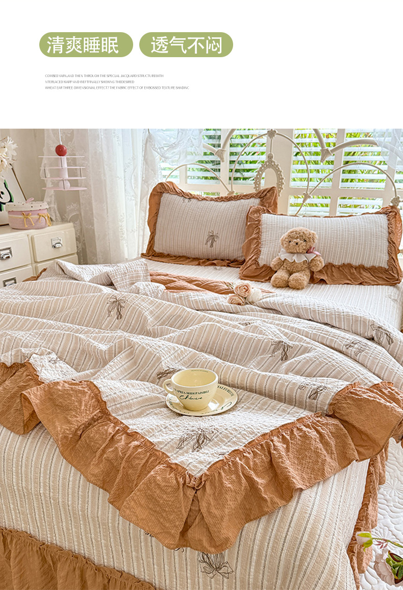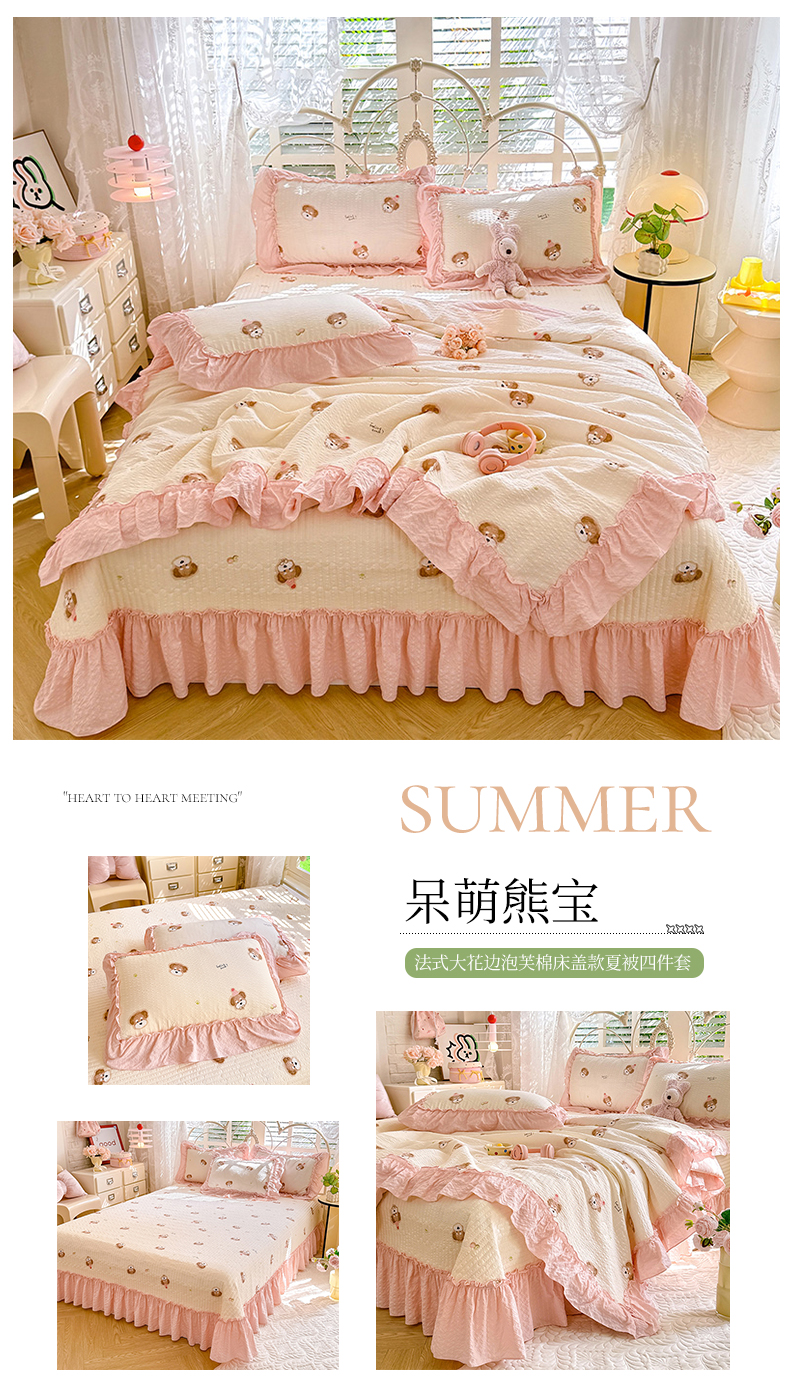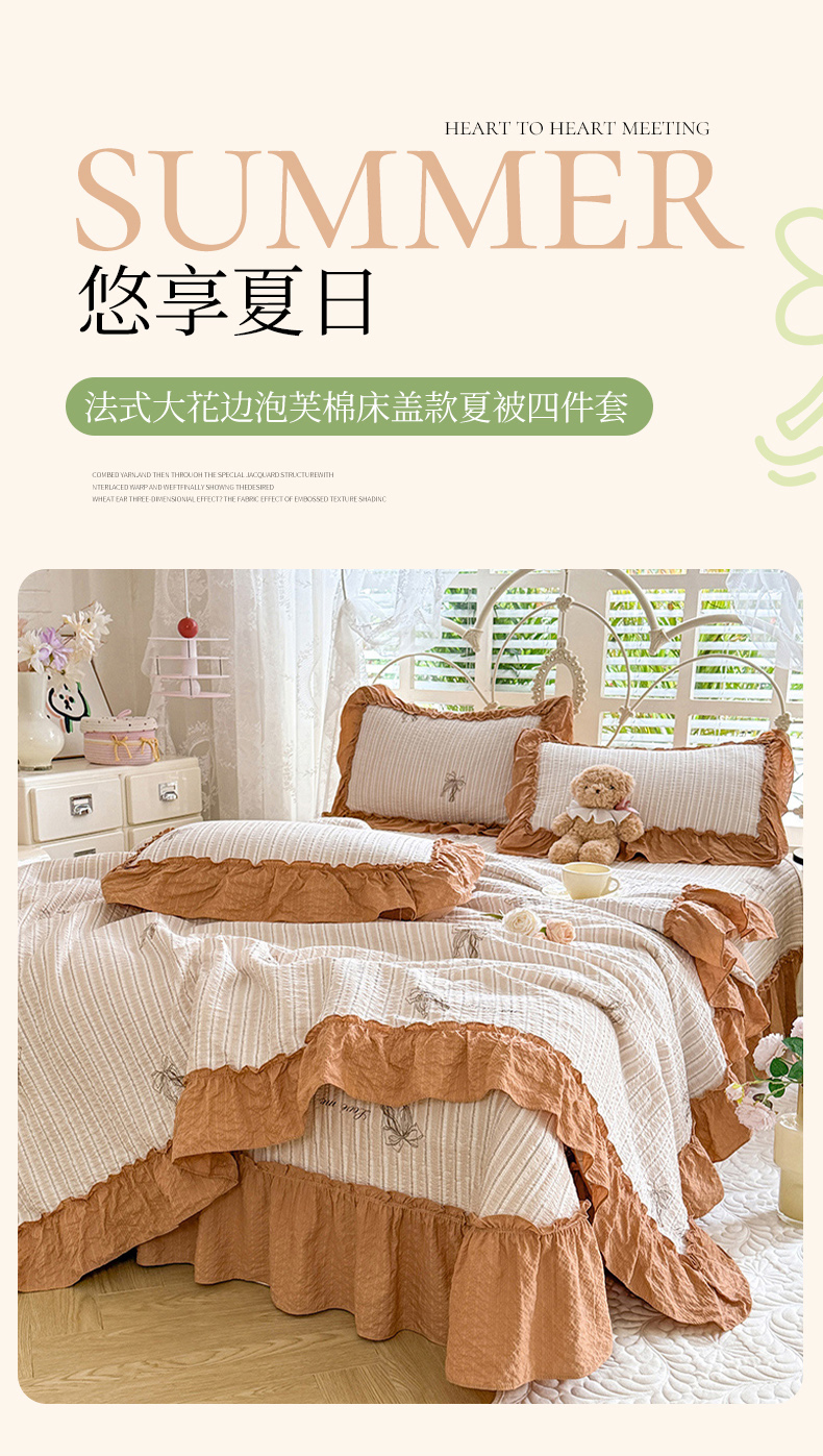 当前位置: 91家纺网 > 商品网购 > 床品套件 > 四件套 > 夏被四件套 > 韩约家纺 2026新款法式大花边泡芙棉床盖款夏被夏凉被空调被四件套 摩卡人生