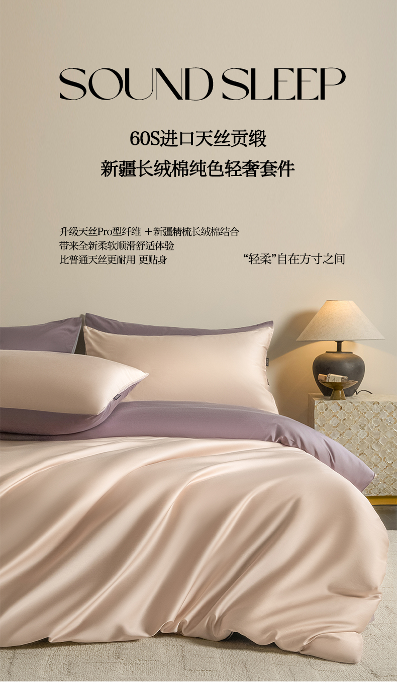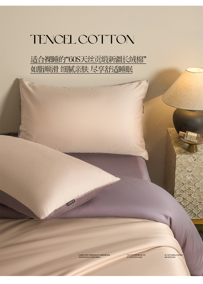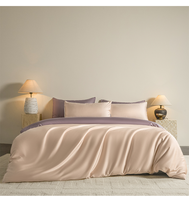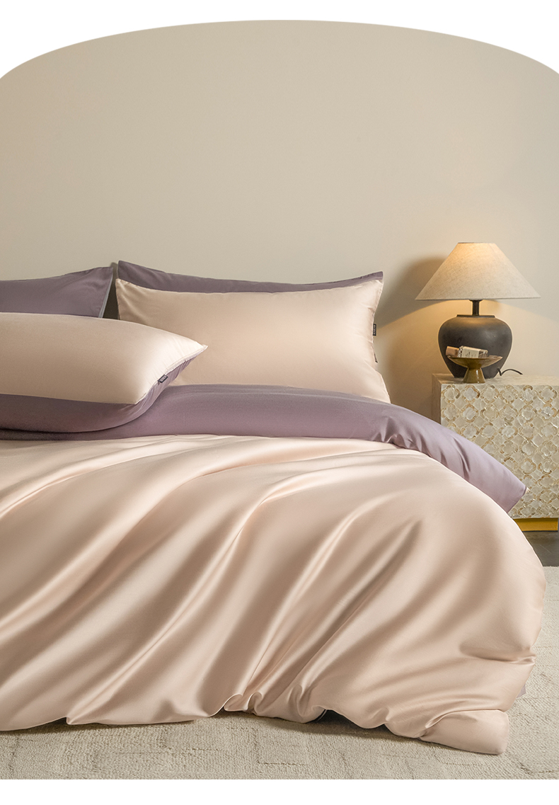 商品名称:秀色家纺 2026新款60S进口天丝贡缎新疆长绒棉纯色轻奢四件套 Air-天丝棉-桃灰粉+迷雾紫