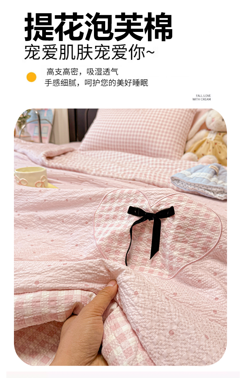 • 91家纺网 家纺一手货源 找家纺 (总)瑞禾家纺(原阿亮) 2026新款提花泡芙棉拼角蝴蝶结软乎乎的撸猫感单夏被夏被四件套-甜莓气泡,甜莓气泡-海盐蓝波点,甜莓气泡-奶粉波点,甜莓气泡-奶红波点,甜莓气泡-奶灰波点,组合图(仅供展示不可下单)