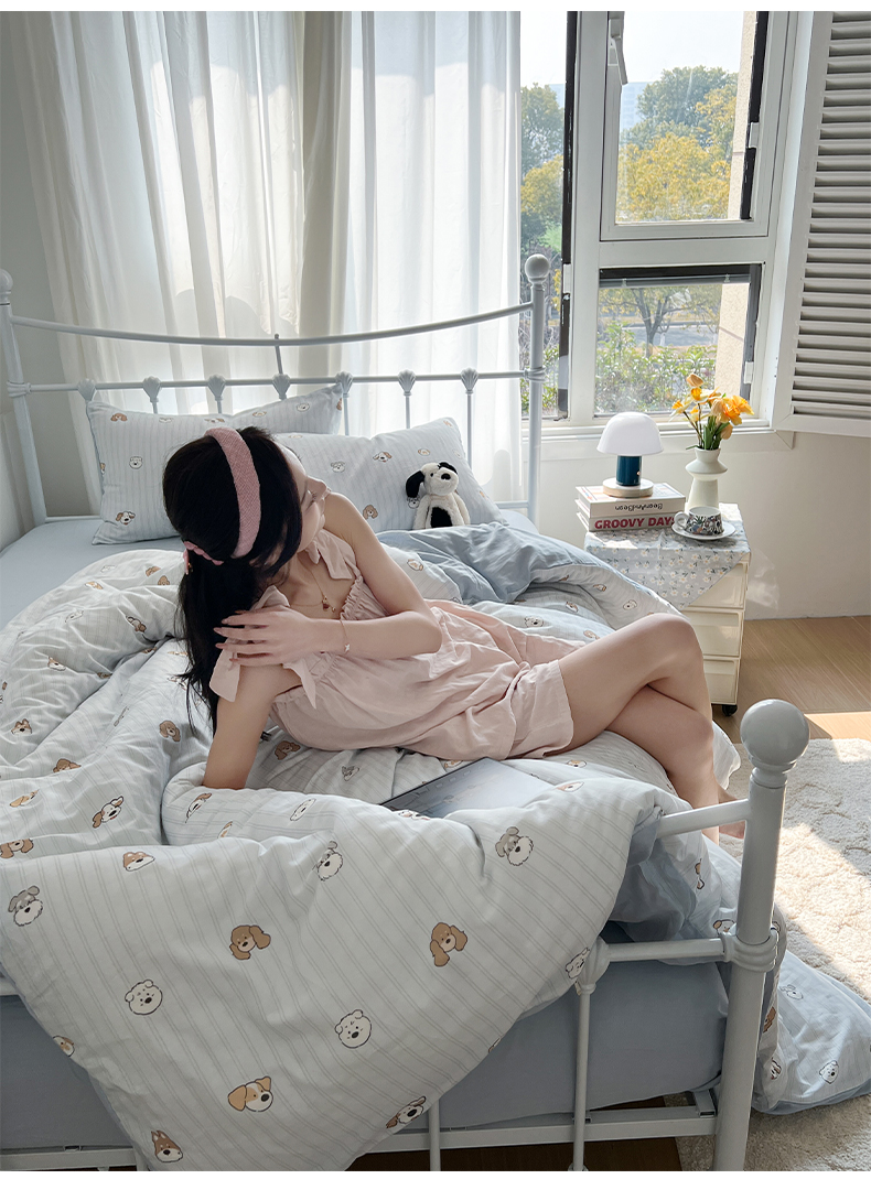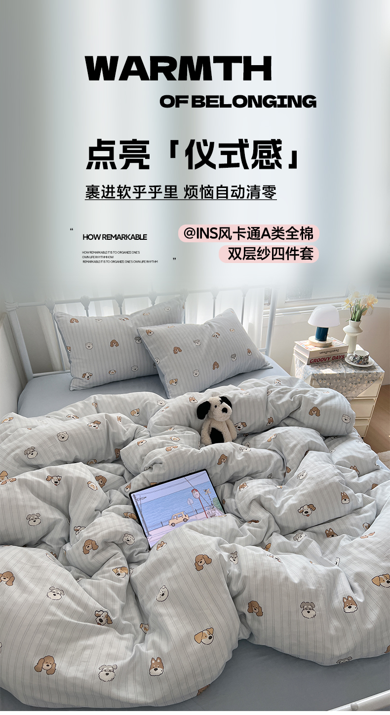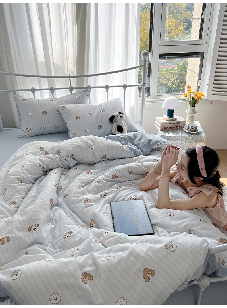 早晨家纺 2026新款INS博主风卡通A类全棉纯棉双层纱四件套 奶狗日记-蓝