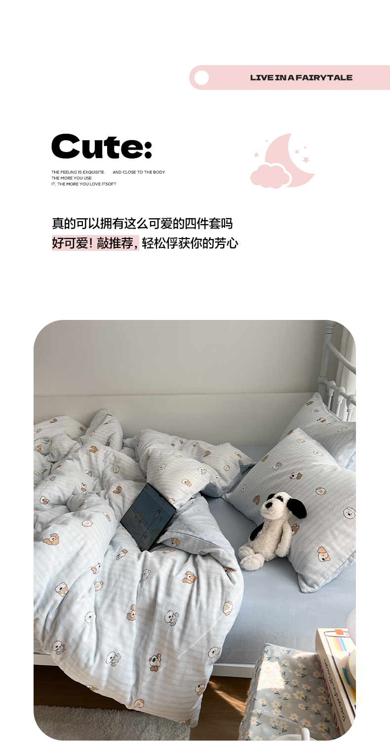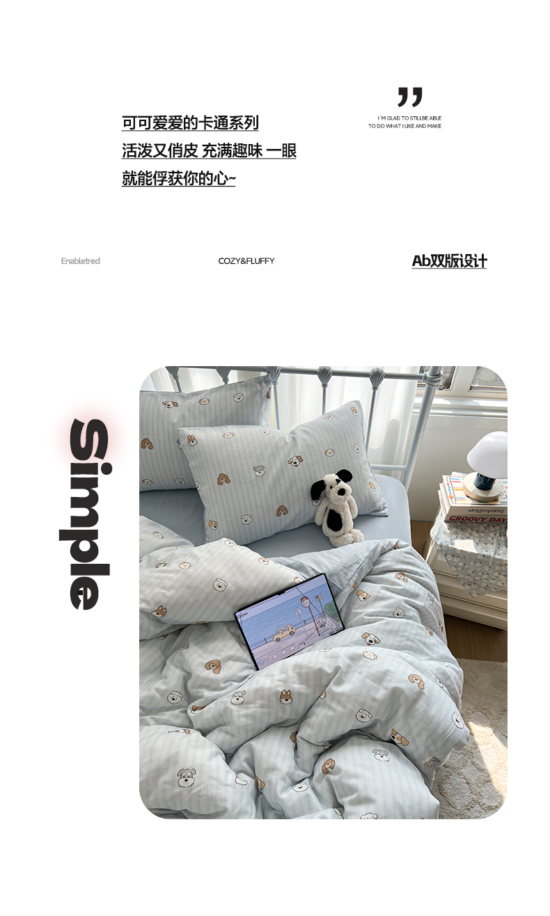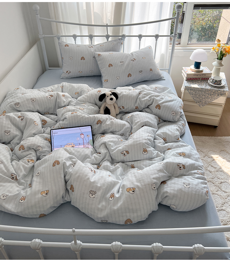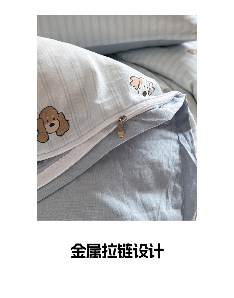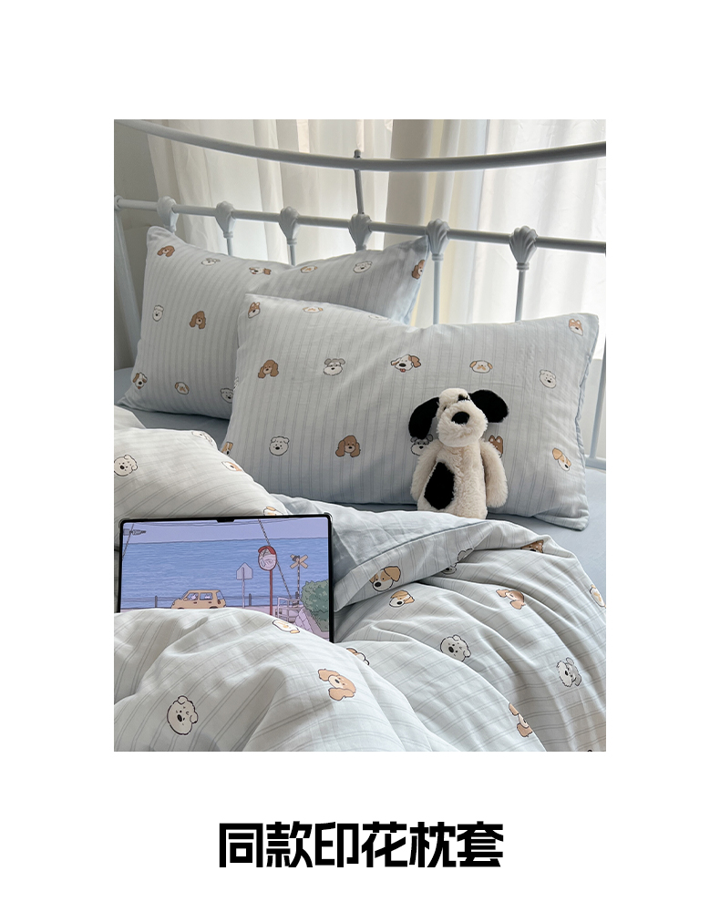 商品名称:早晨家纺 2026新款INS博主风卡通A类全棉纯棉双层纱四件套 奶狗日记-蓝
