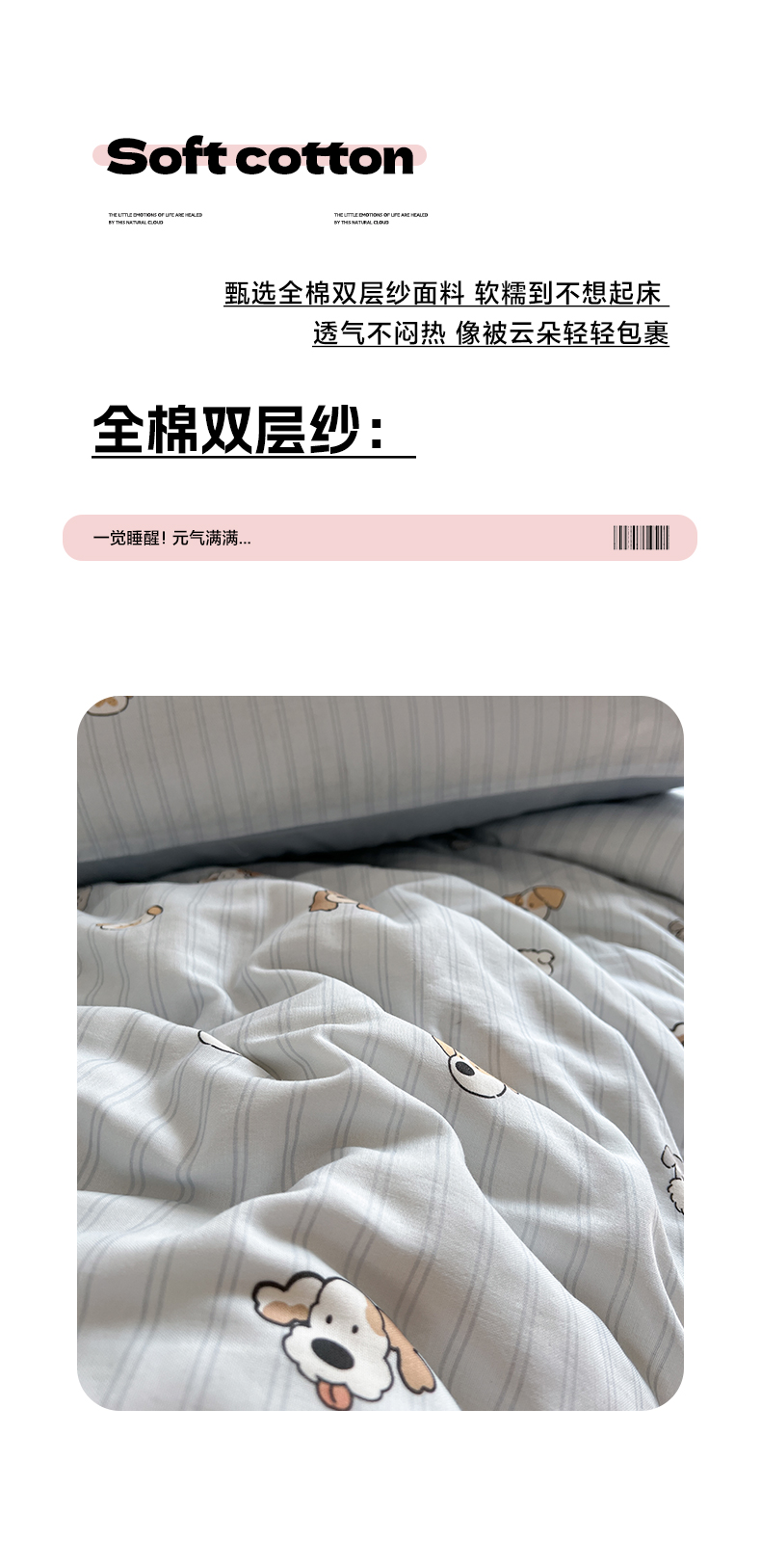 (总)早晨家纺 2026新款INS博主风卡通A类全棉纯棉双层纱四件套,奶狗日记-灰,奶狗日记-蓝,腊肠狗,气球城堡,软萌喵趴,森林小窝,樱桃小兔