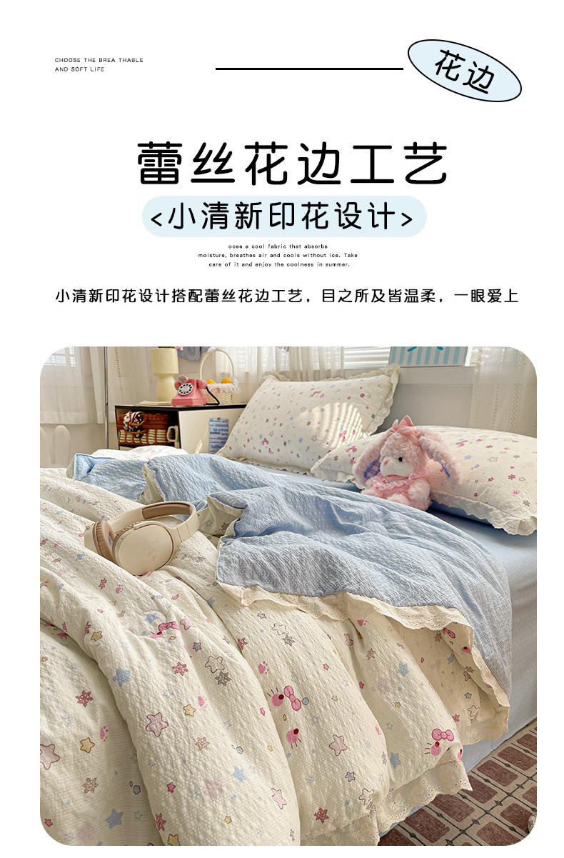 (总)优承佳生活馆 2026年新款卡通小清新风格高克重超柔软糯泡芙双层纱面料三件套四件套单被套系列,hello粉凯蒂,芭比兔,春日木马,花间兔语,咖色凯蒂,满满,萌萌狗,女孩日常,千禧马,浅陌,甜猫派对,甜心,甜心草莓兔,童趣星空,星星kt,紫蔷薇