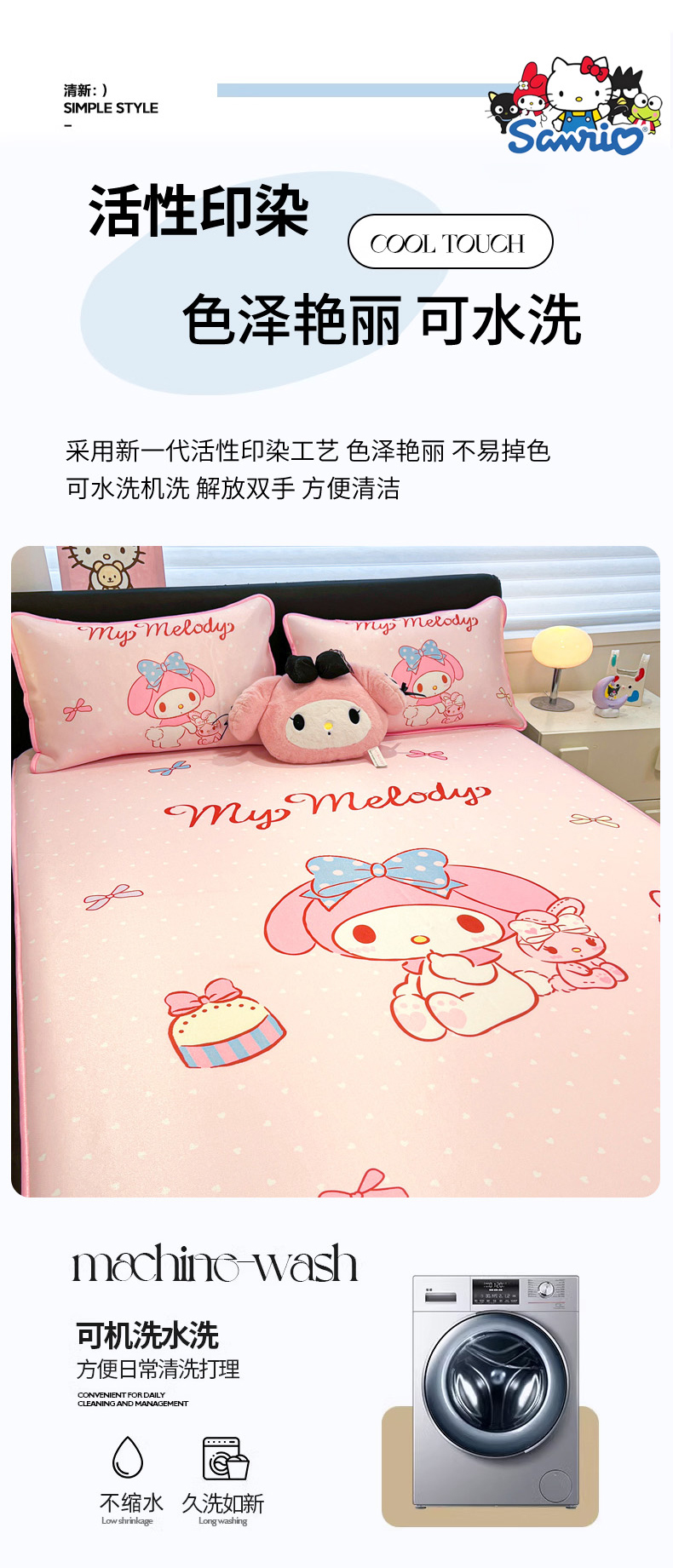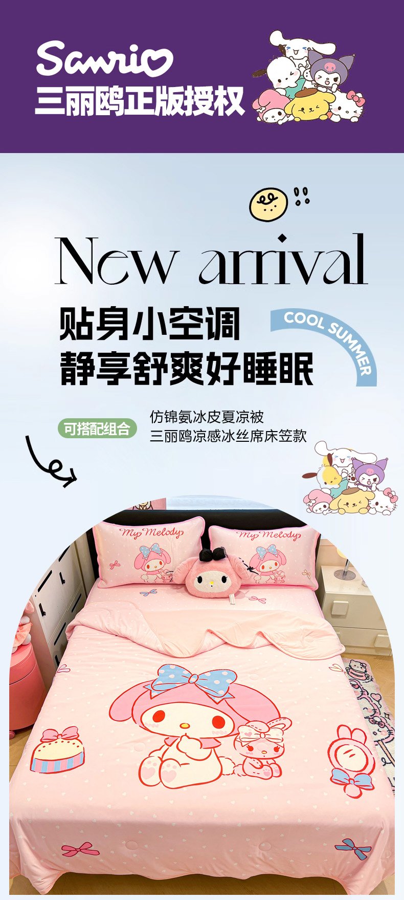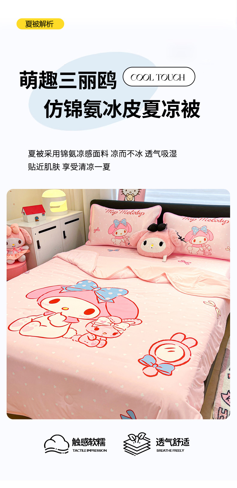 当前位置: 91家纺网 > 商品网购 > 床上用品 > 凉席 > 冰丝席 > 暮思家居 2026新款正版授权A类大版数码印花三丽鸥1200D冰丝凉席可组合仿锦氨夏被 床笠款-小兔美乐蒂