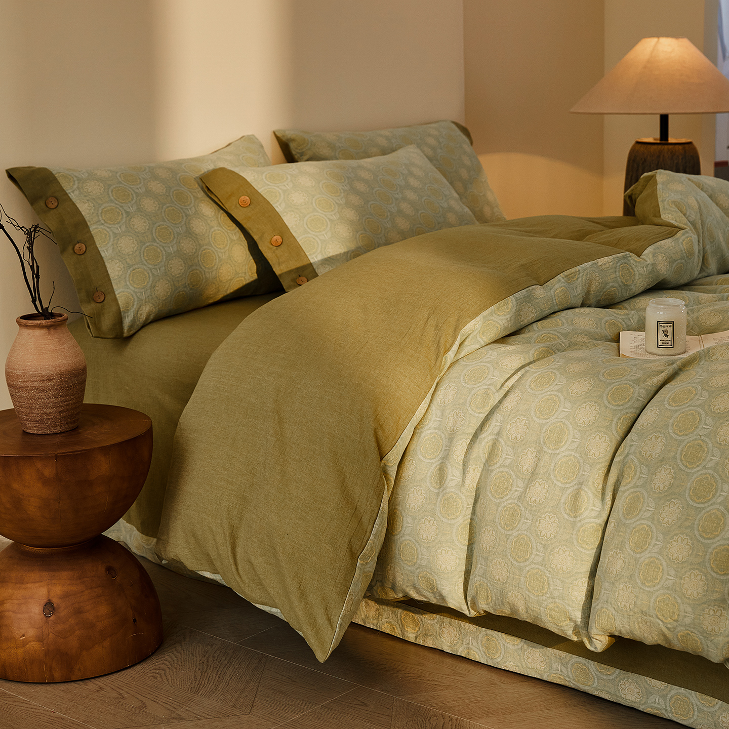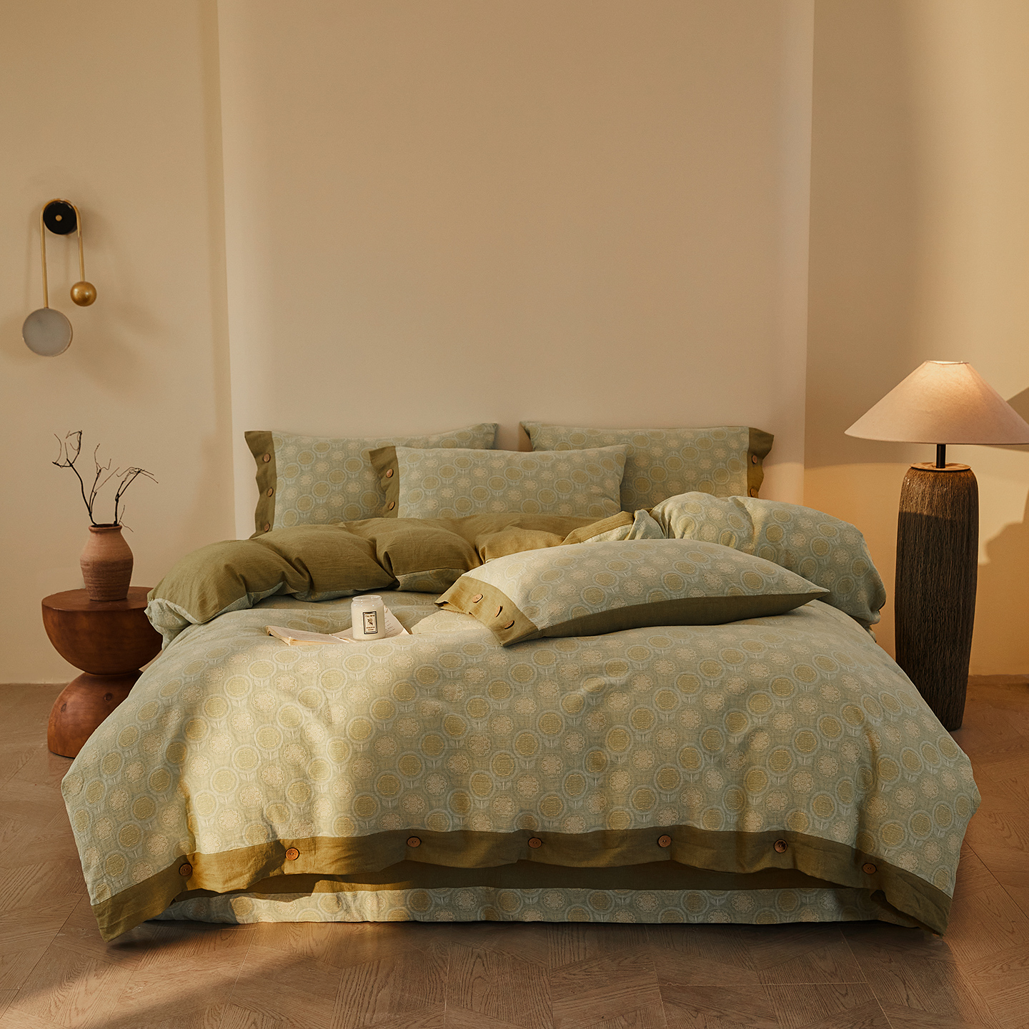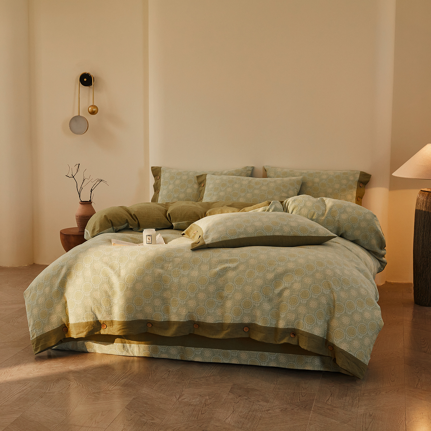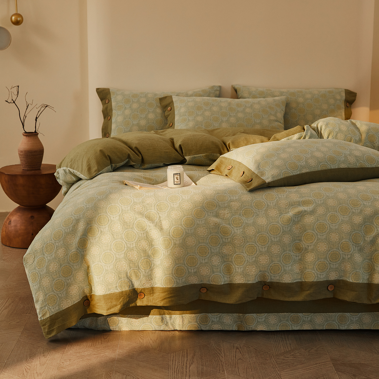 商品名称:(总)仰望棉麻双层纱供应链 2026新款全棉色织提花双层纱纽扣款四件套-梵可