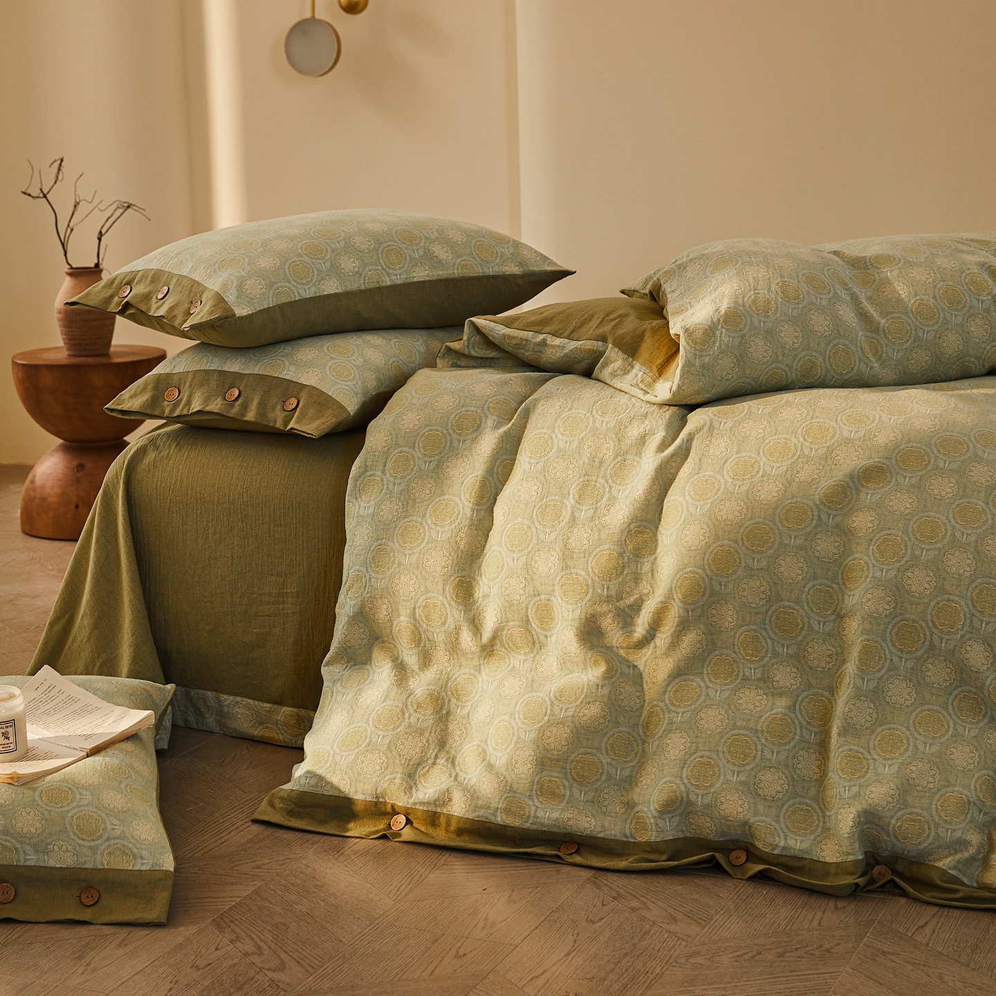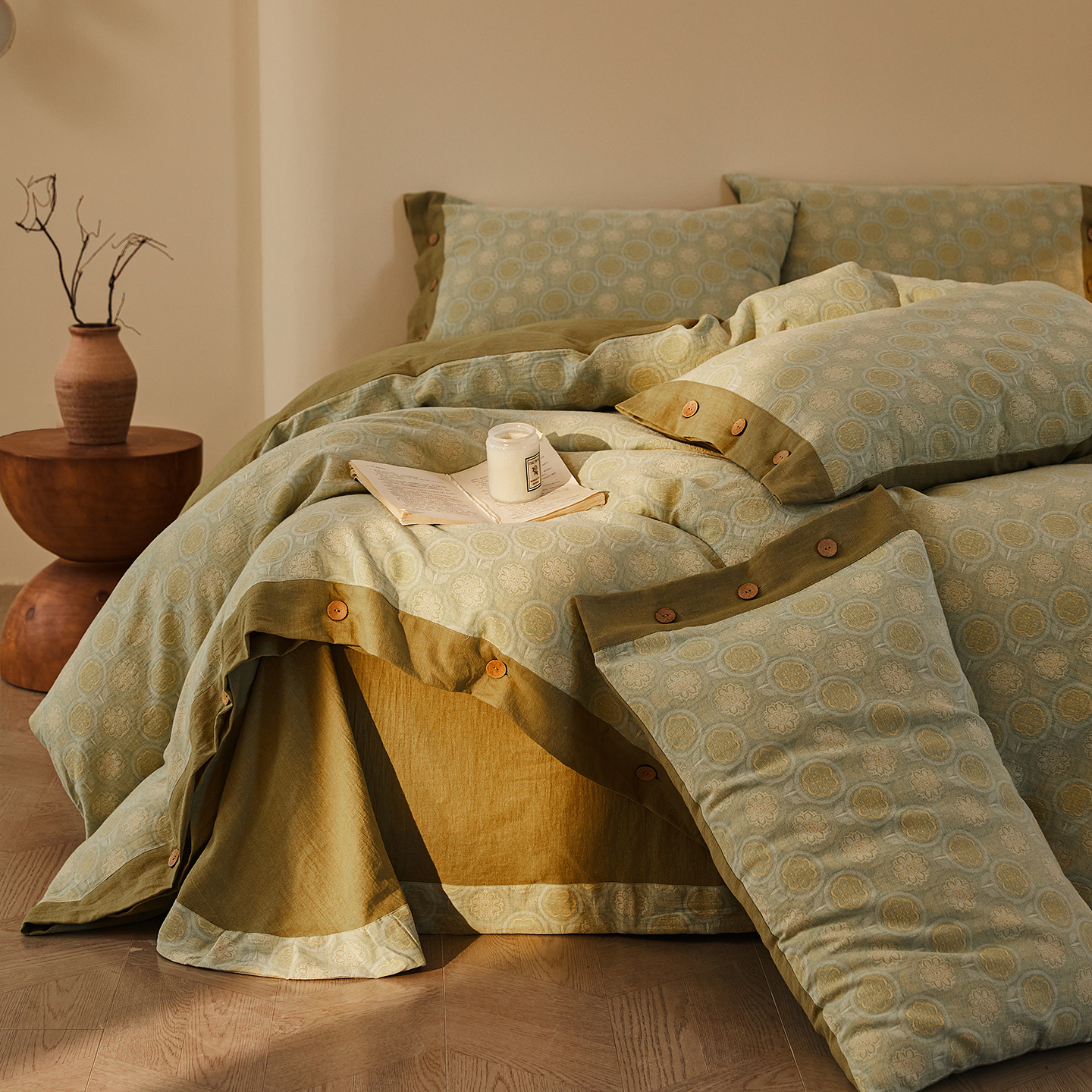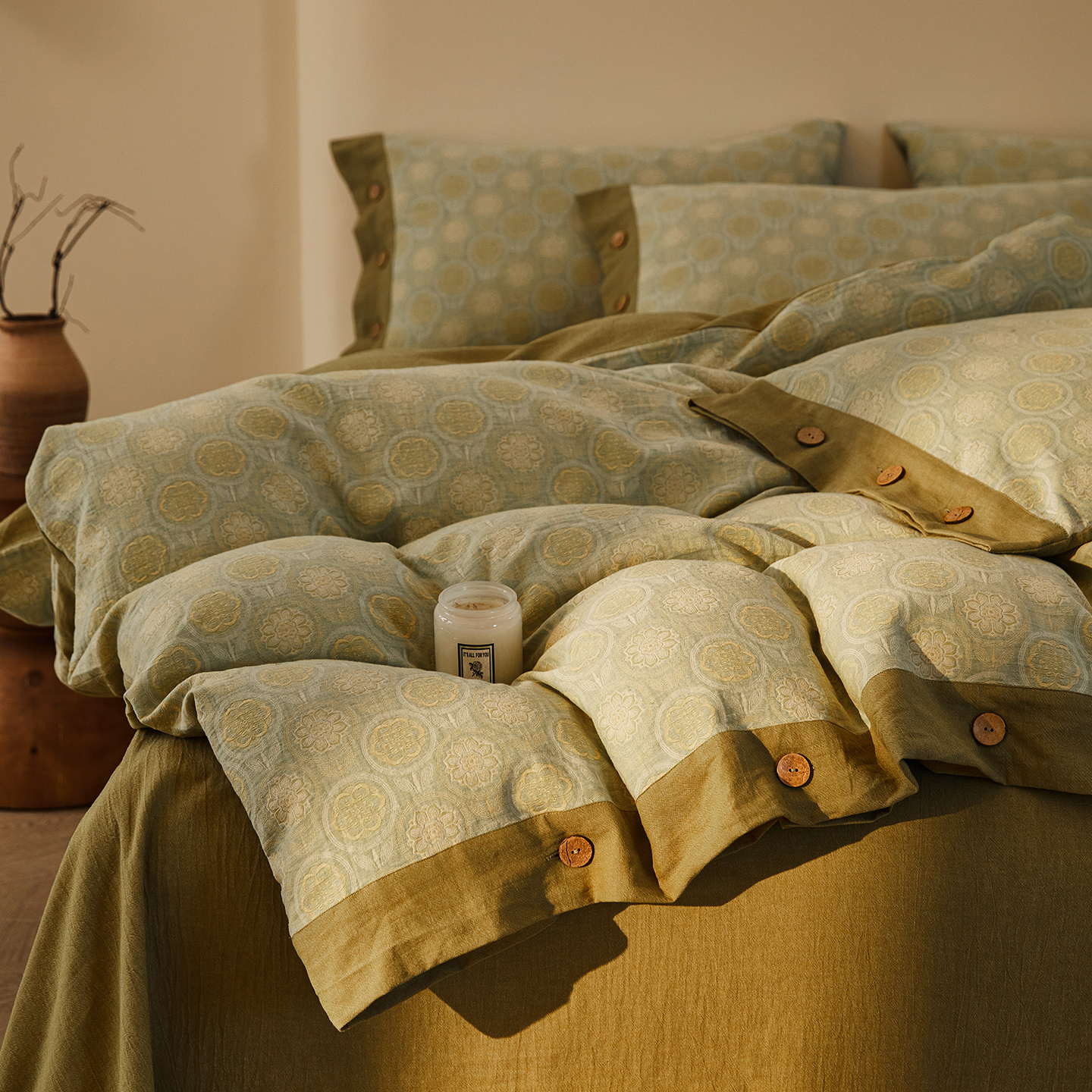 (总)仰望棉麻双层纱供应链 2026新款全棉色织提花双层纱纽扣款四件套-森意棉棉,森意棉棉