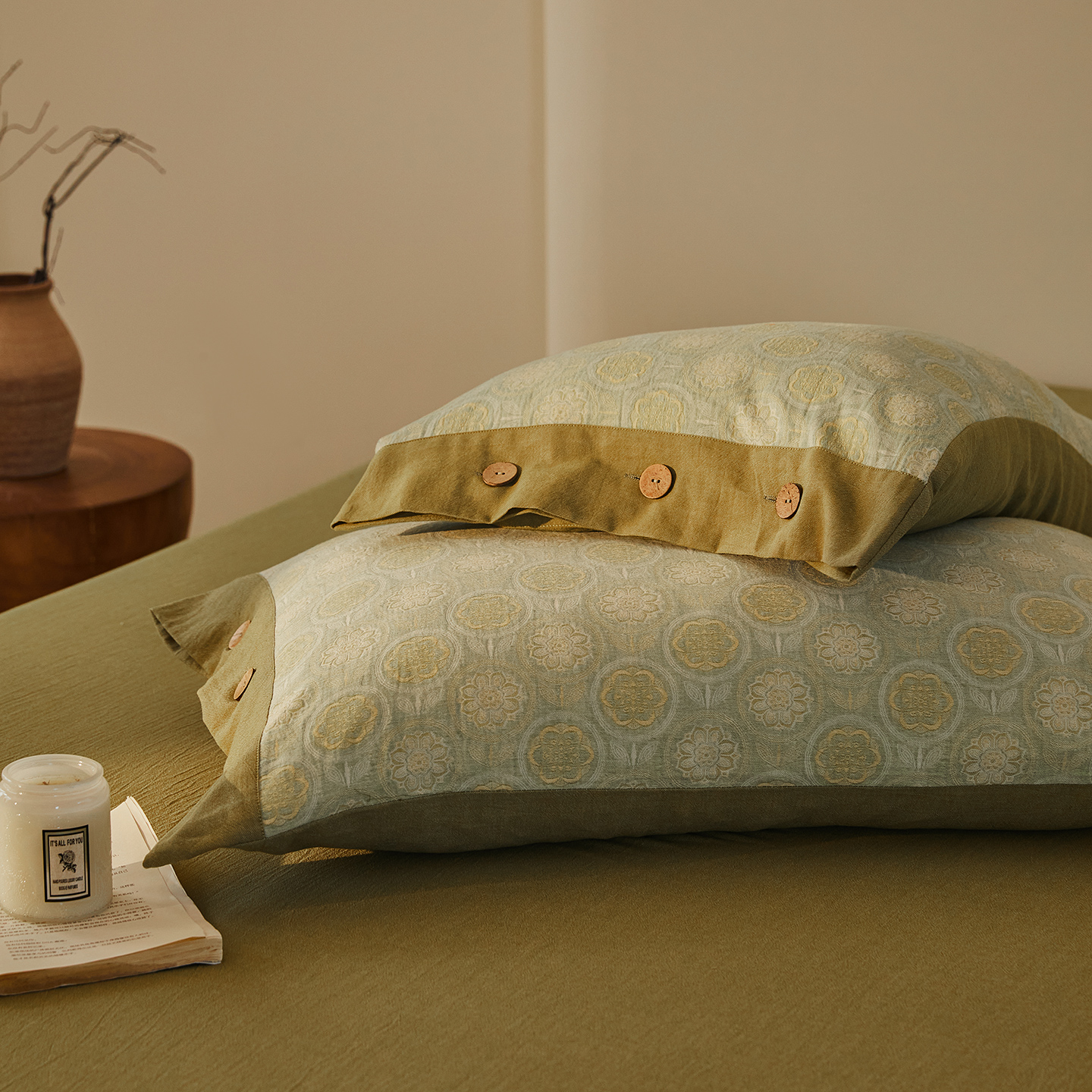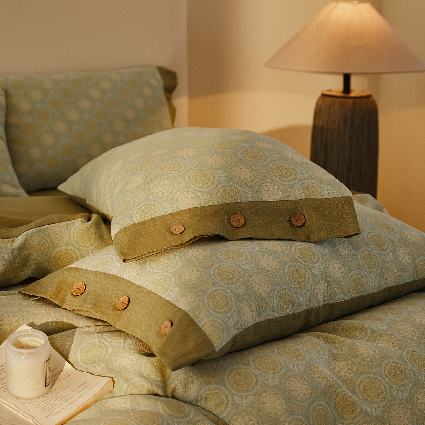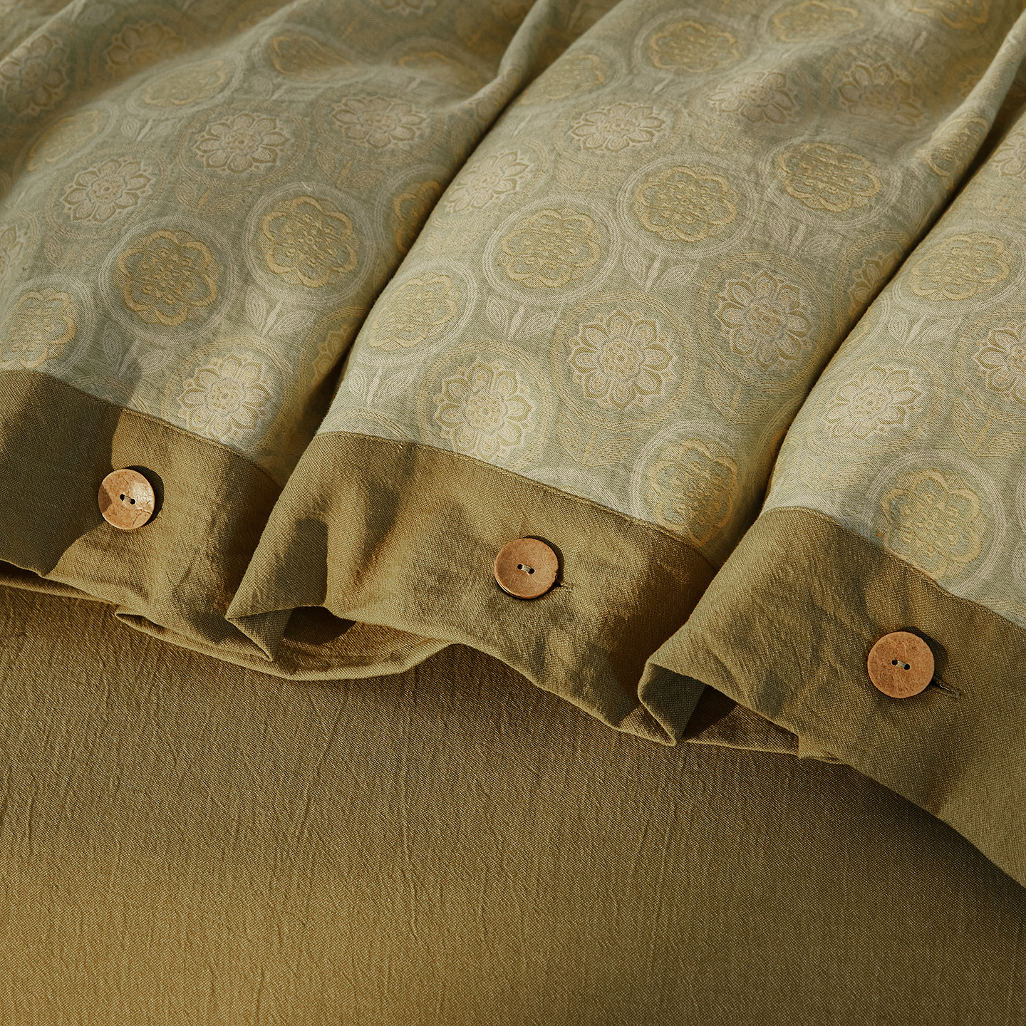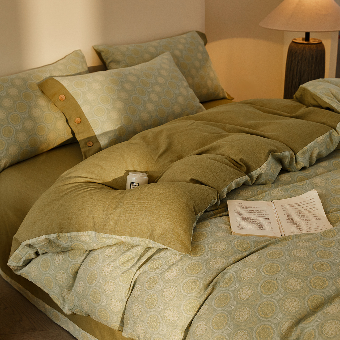 (总)仰望棉麻双层纱供应链 2026新款全棉色织提花双层纱纽扣款四件套-森意棉棉,森意棉棉