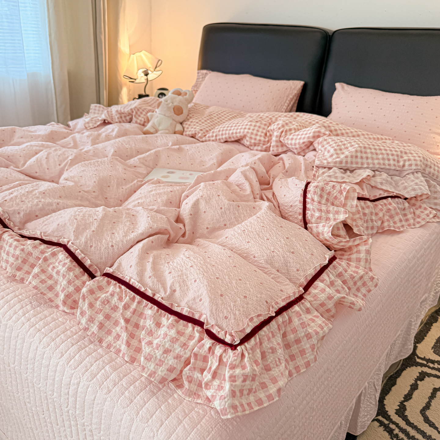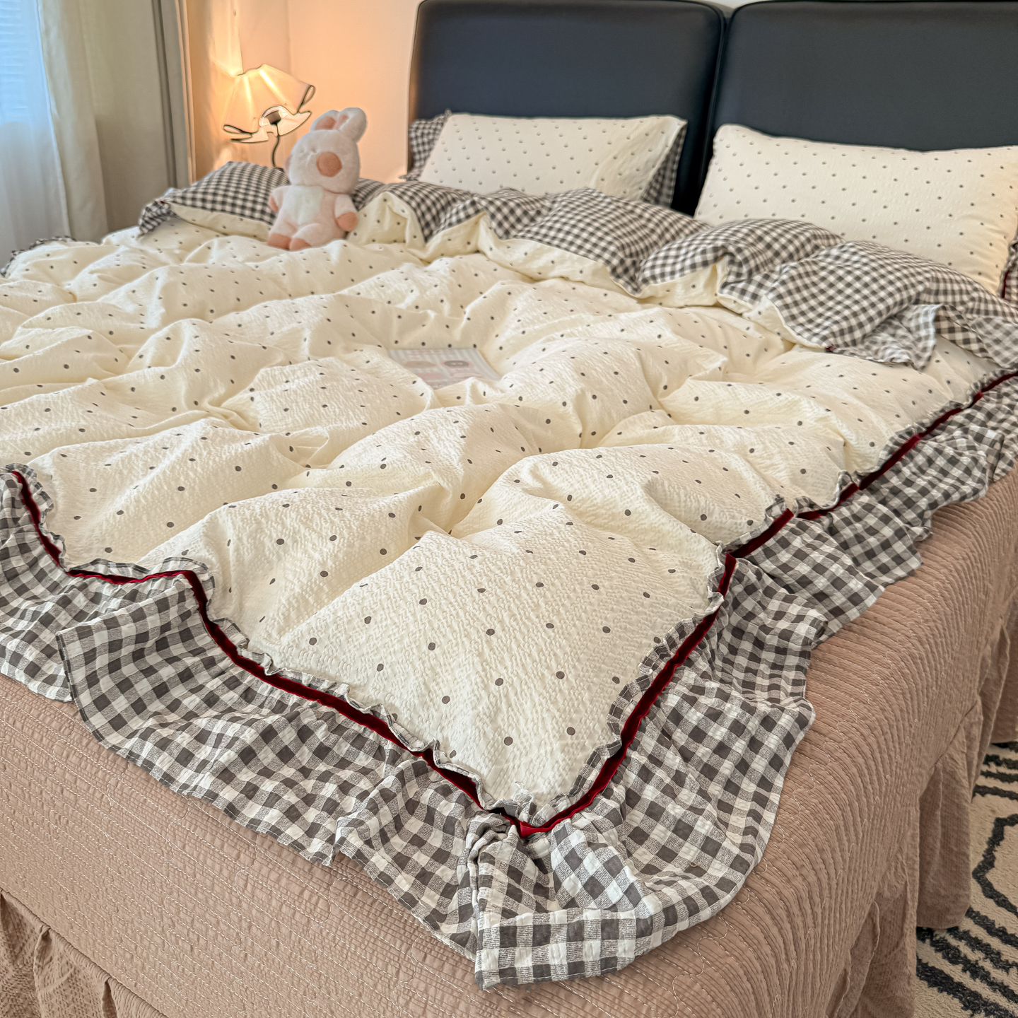(总)子钦家纺 2026春夏新款提花泡芙棉贴布绣手包边但夏被夏被四件套-丘比特的爱恋(场景二),丘比特的爱恋-海盐蓝+蓝格,丘比特的爱恋-奶粉波点+粉小格,丘比特的爱恋-奶红波点+红格,丘比特的爱恋-奶灰波点+黑小格,组合图