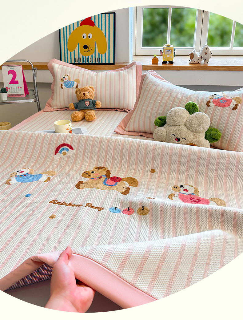 雯豆家纺 2026新款PE中分子毛巾绣凉席三件套平铺席子卡通绣花条席 奔腾小马-粉