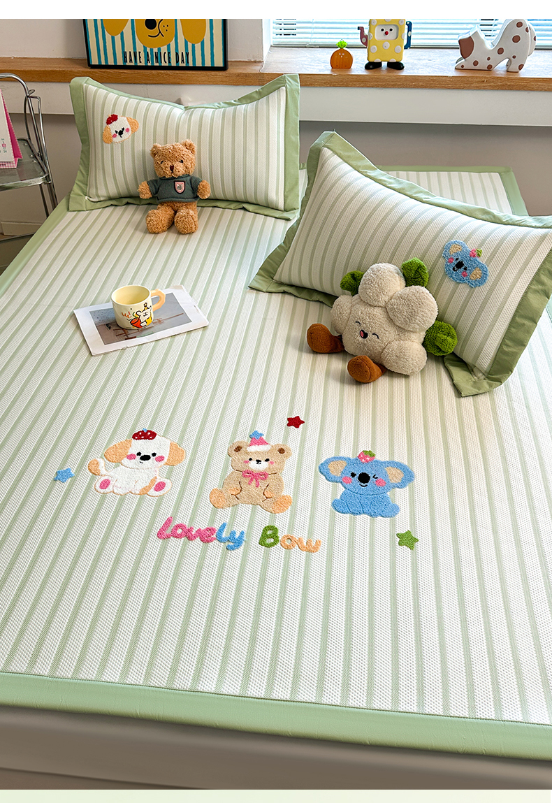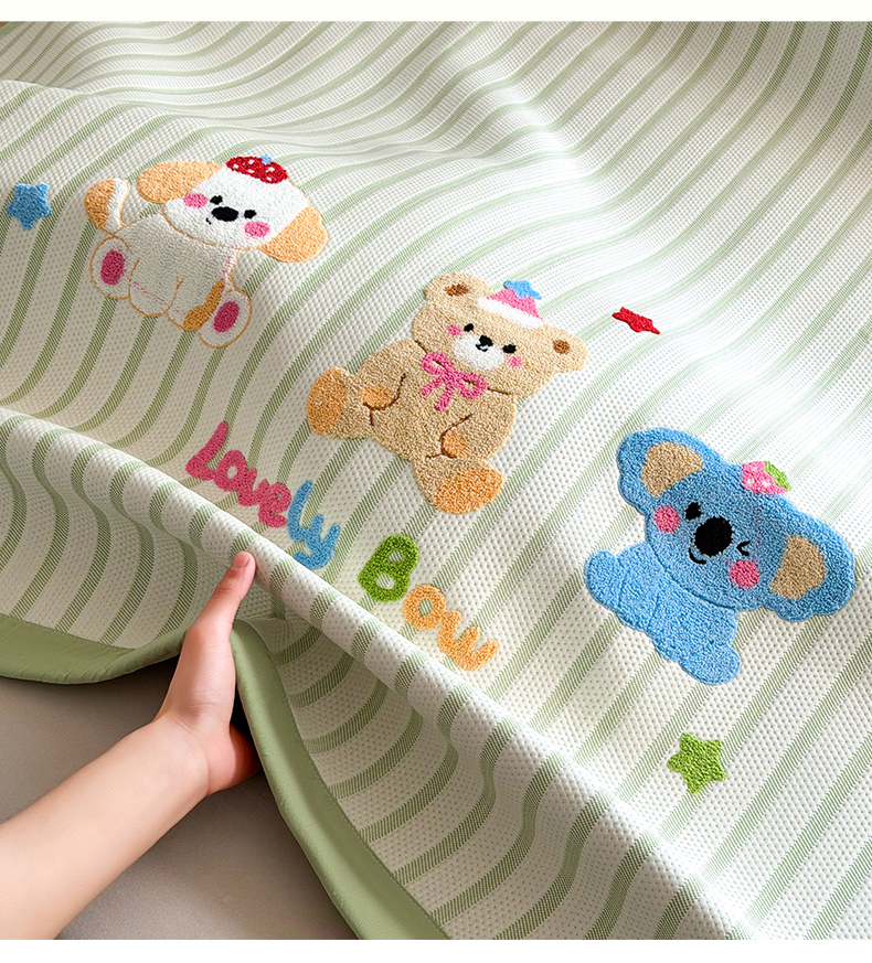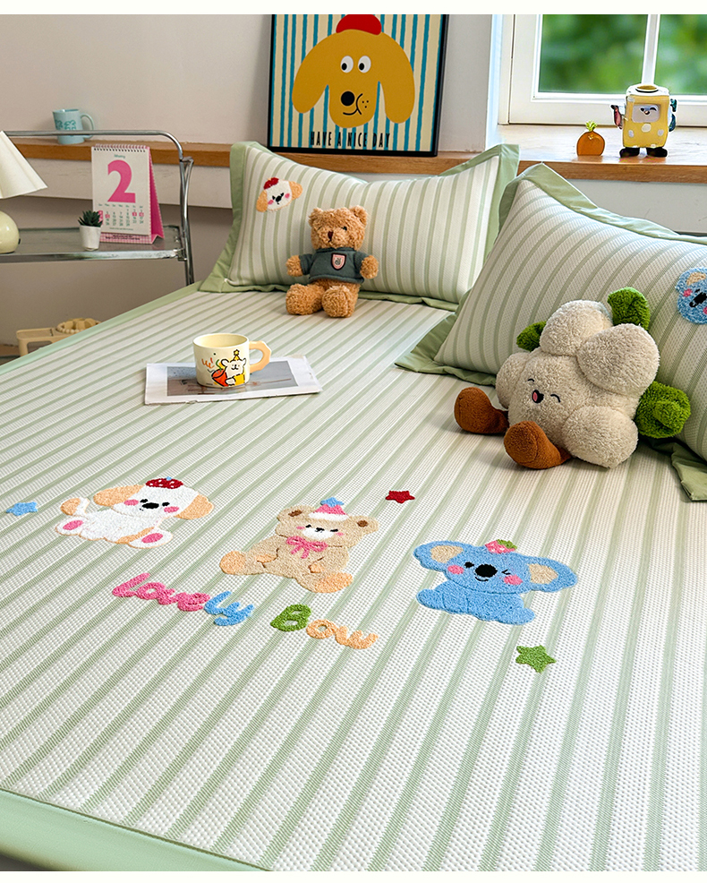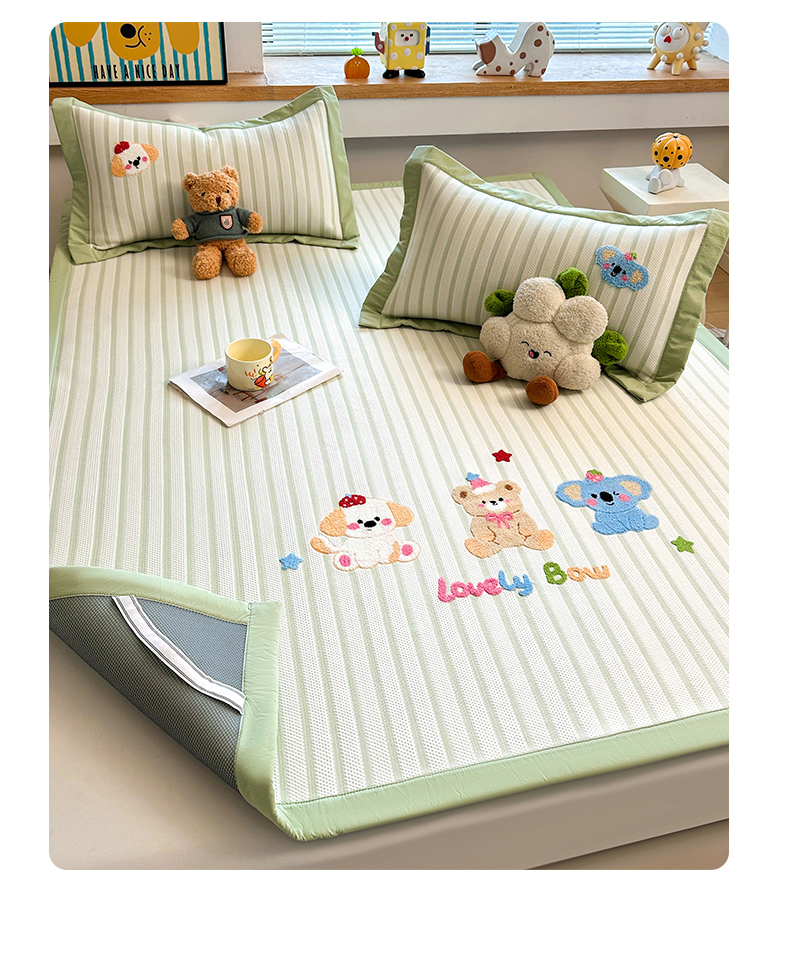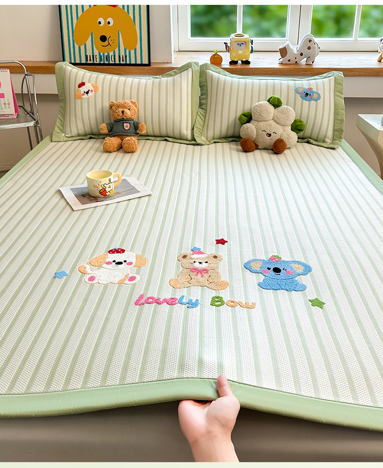雯豆家纺 2026新款PE中分子毛巾绣凉席三件套平铺席子卡通绣花条席 树懒-绿