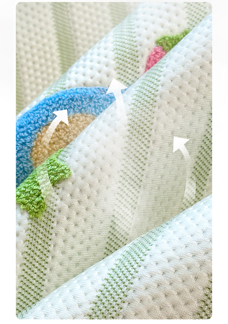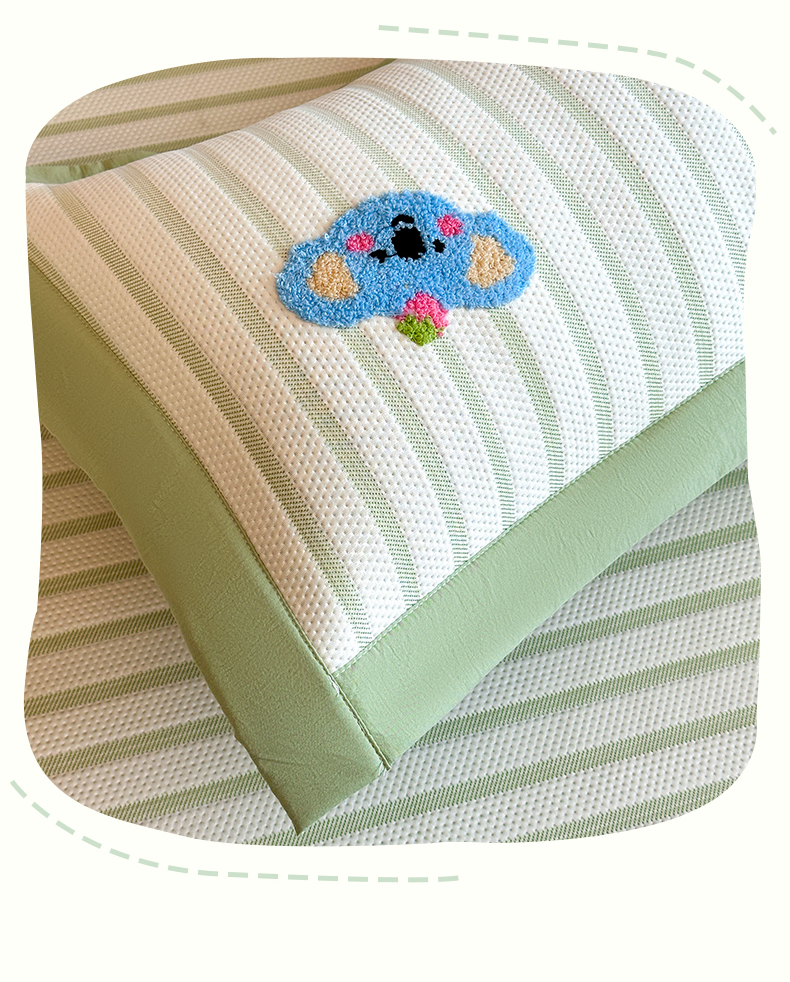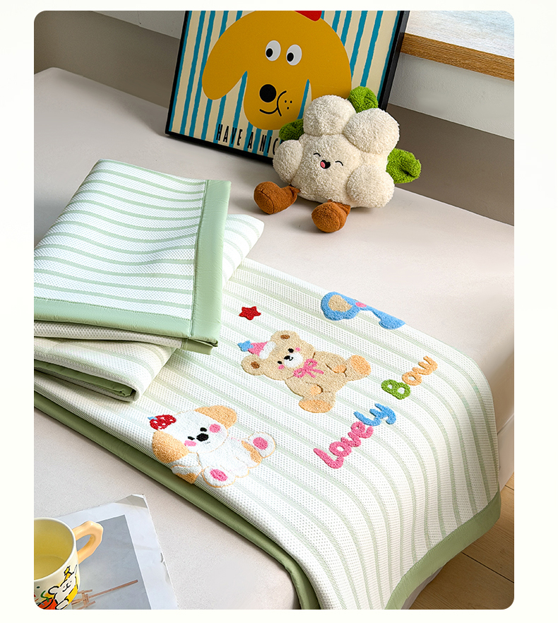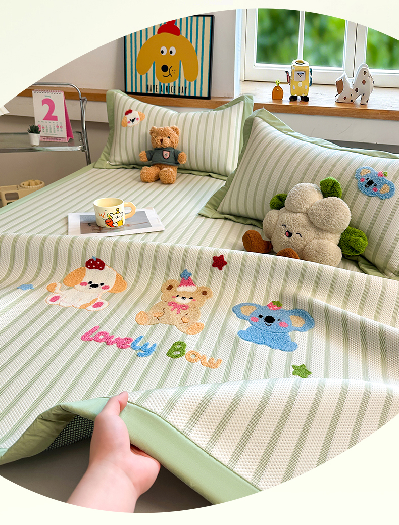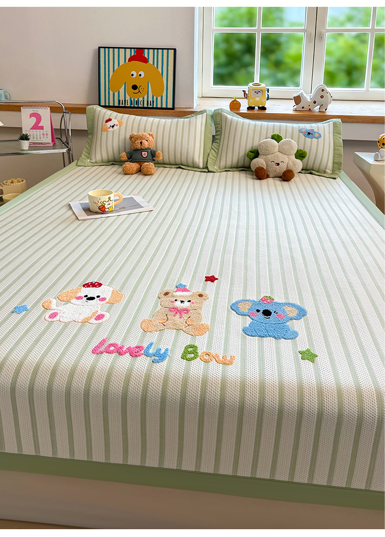 雯豆家纺 2026新款PE中分子毛巾绣凉席三件套平铺席子卡通绣花条席 树懒-绿