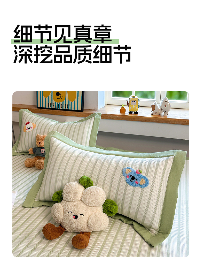 商品名称:雯豆家纺 2026新款PE中分子毛巾绣凉席三件套平铺席子卡通绣花条席 树懒-绿