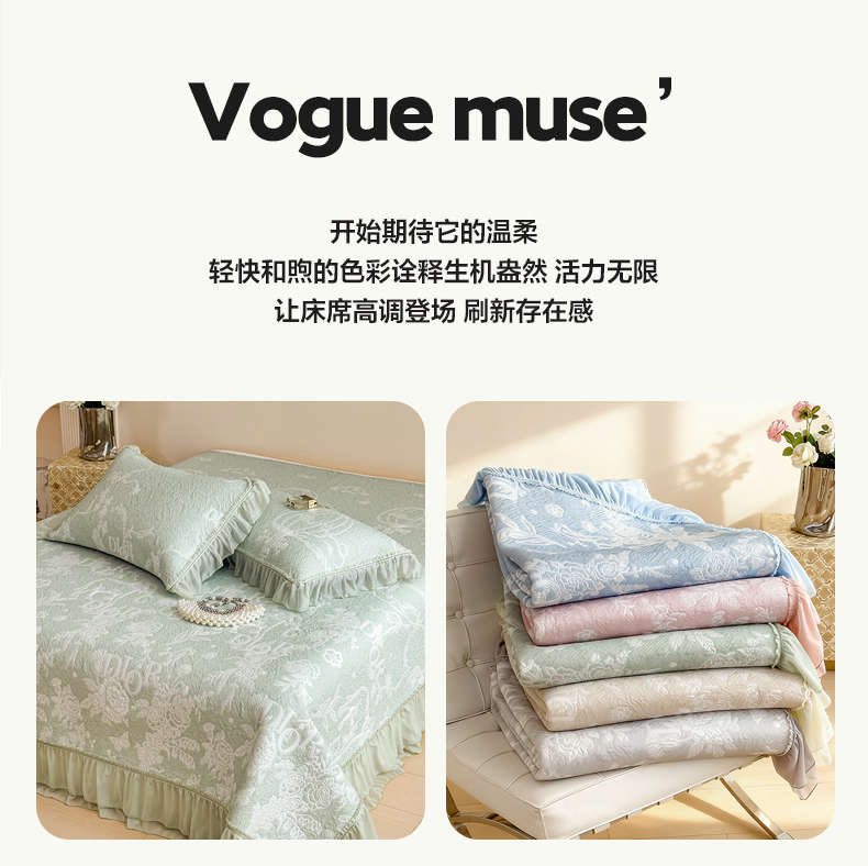 (总)慕木家纺 2026新款A类乙纶双面提花560克冰豆豆花边床盖款床裙迎客松系列(提供买家秀),迎客松-蓝,迎客松-绿,迎客松-粉,迎客松-灰