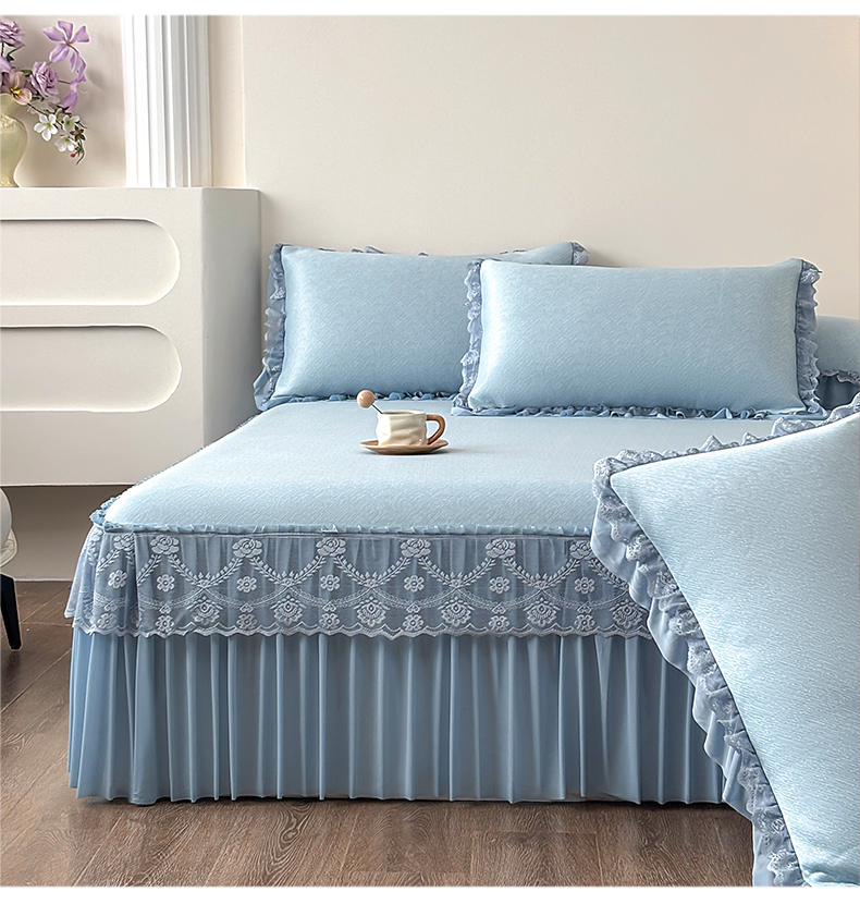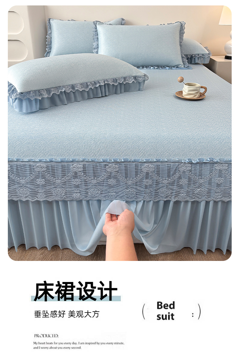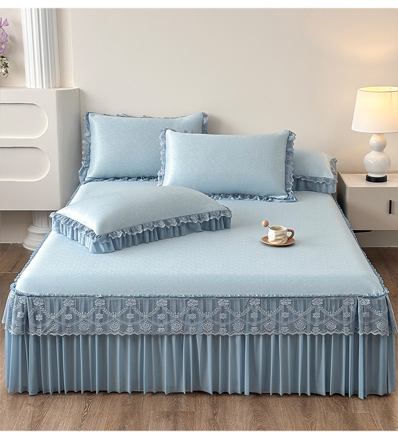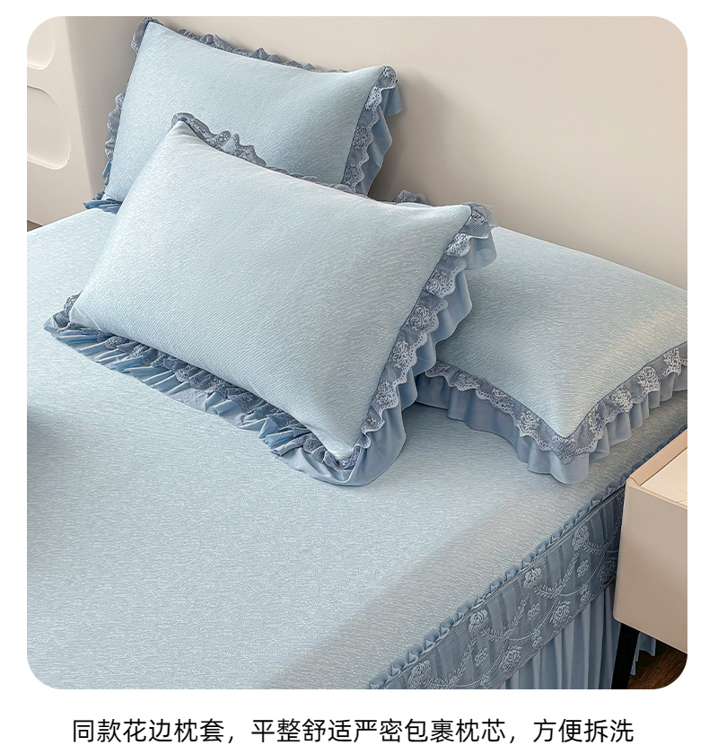 金艾草 2026新款PE高分子凉豆豆小冰皮凉感花边床裙席子凉席三件套 豆豆床裙-浅蓝