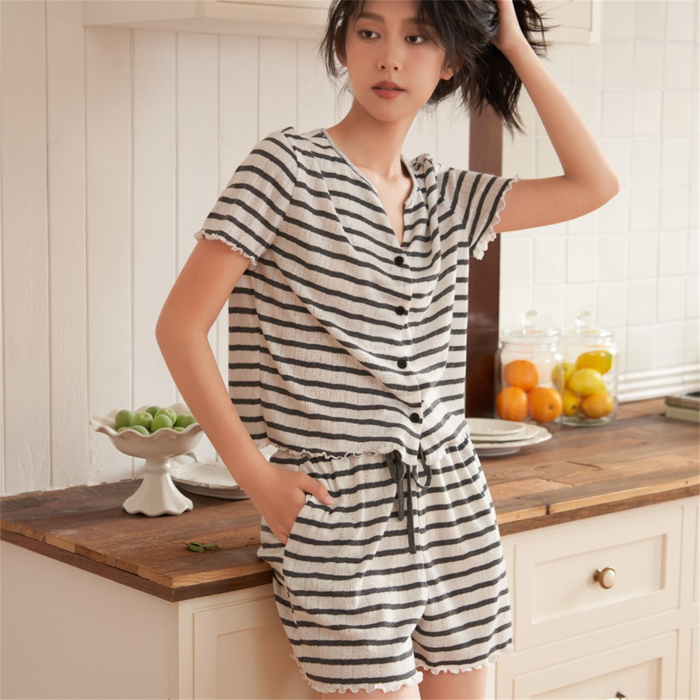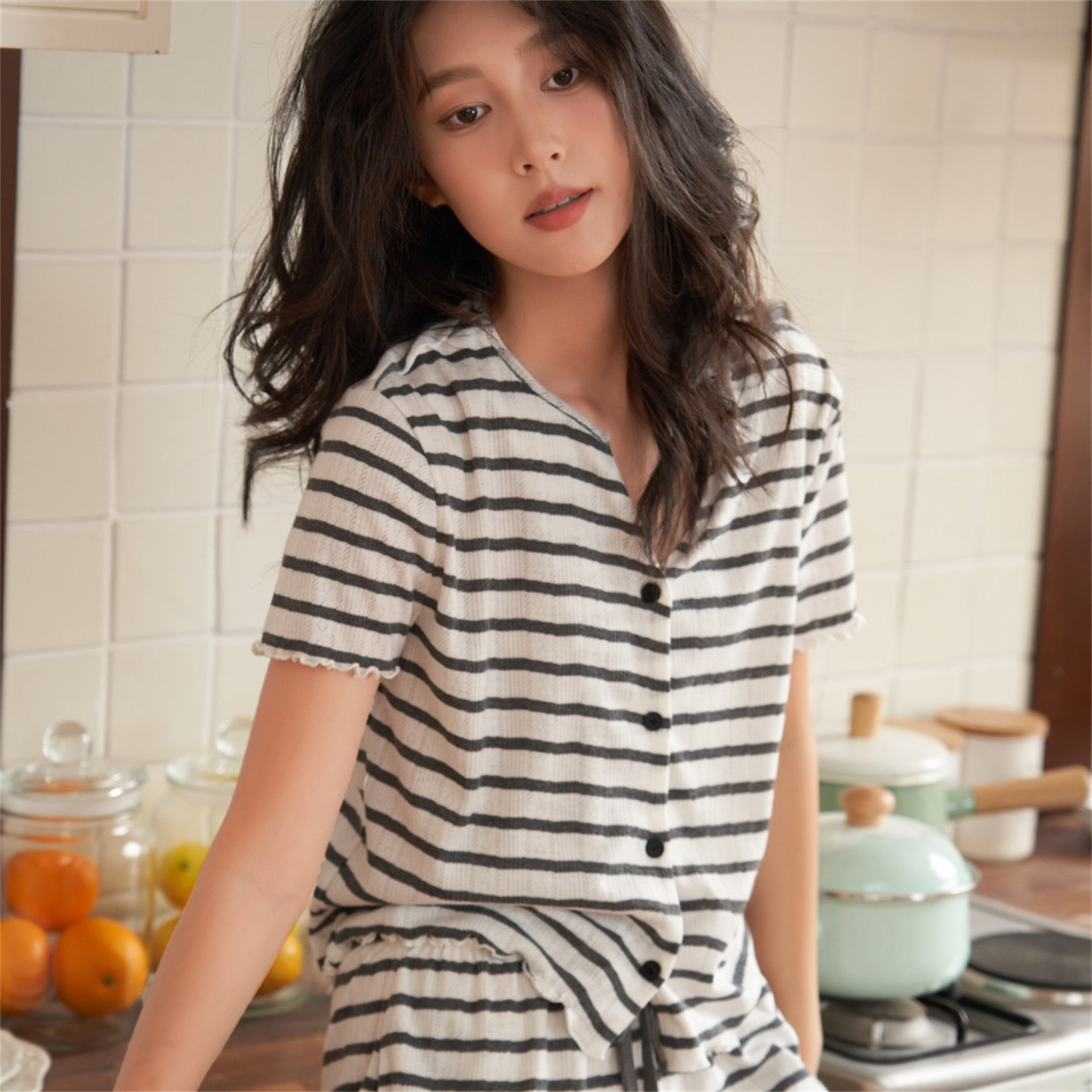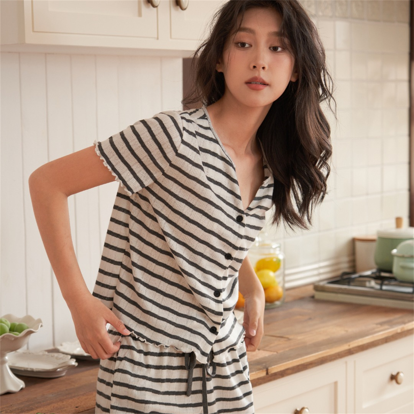 当前位置: 91家纺网 > 商品网购 > 居家日用 > 睡衣/家居服套装 > (总)妍景家居生活馆 2026新款针织棉条纹开衫短短家居服