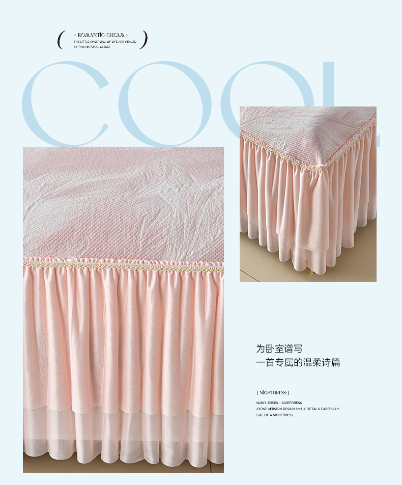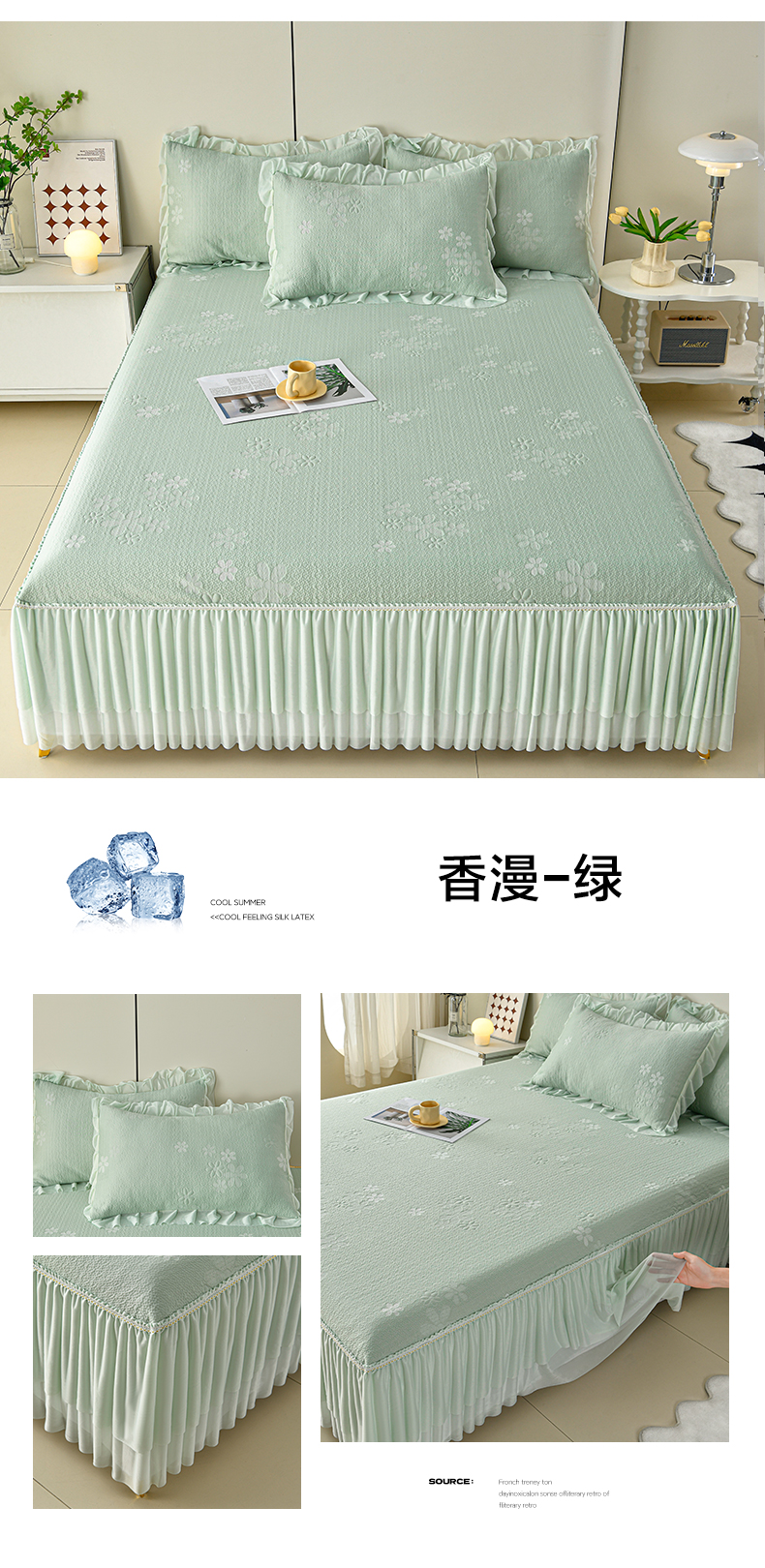 (总)畅畅家纺 2026新款锦氨夏被PE凉感豆豆凉席绣花三明治复合床裙三件套四件套,格韵-粉-床裙款,格韵-灰-床裙款,格韵-蓝-床裙款,格韵-绿-床裙款