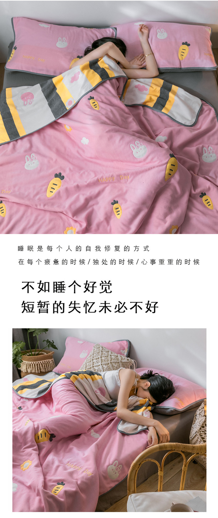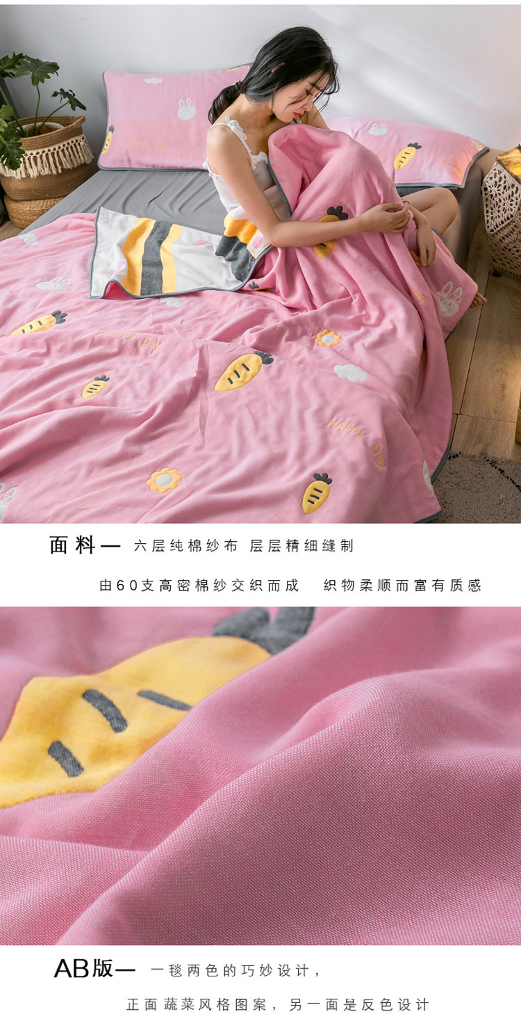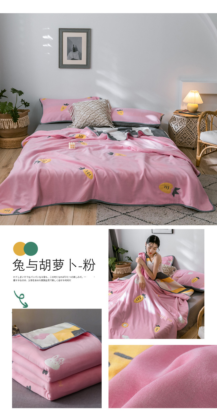 朴尔 2021新款时尚六层全棉纱布毛巾被兔与胡萝卜-粉
